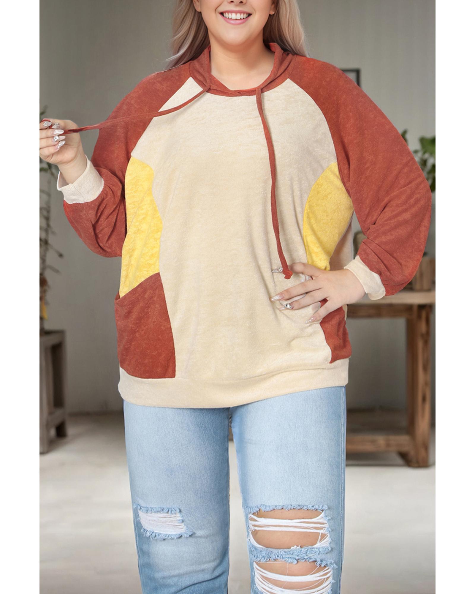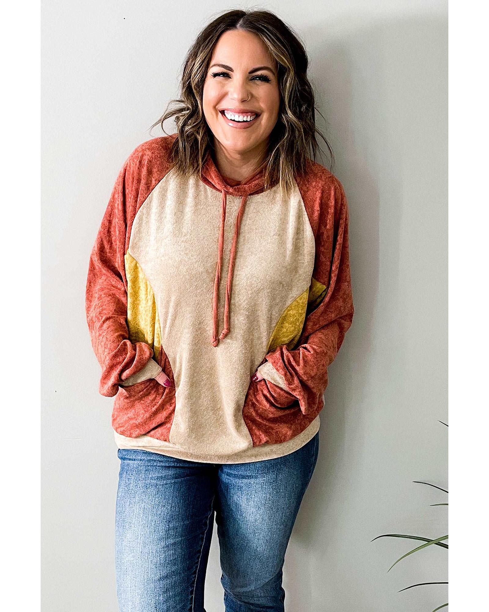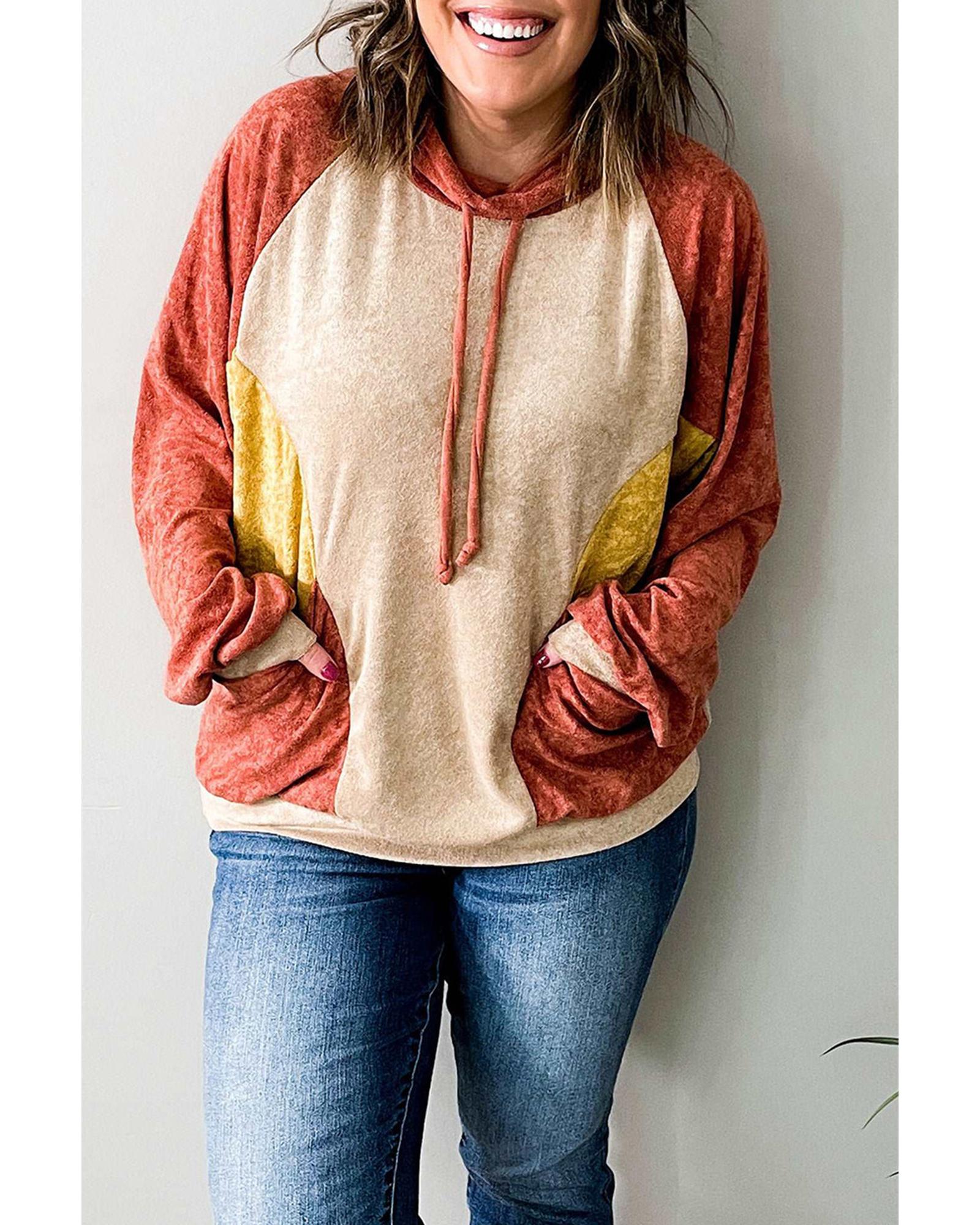 Orange Plus Size Colorblock Raglan Hoodie with Pockets – 2X