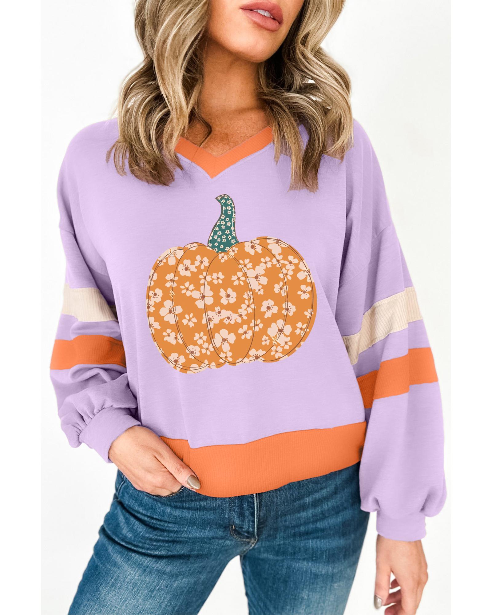 - Orchid Bouquet Halloween Floral Pumpkin Color Block V Neck Sweatshirt
