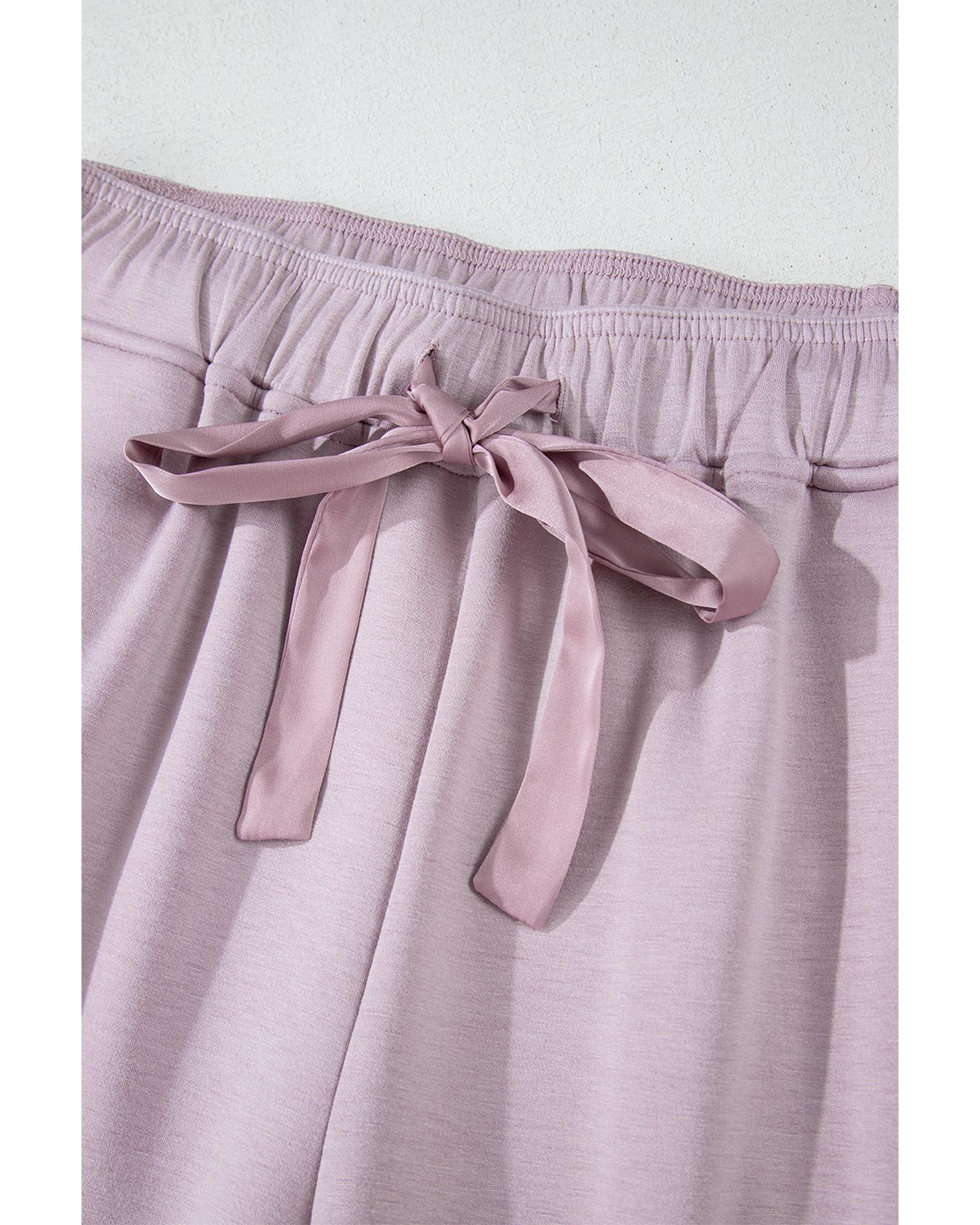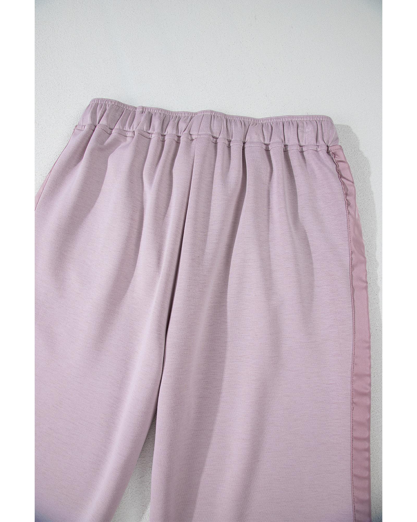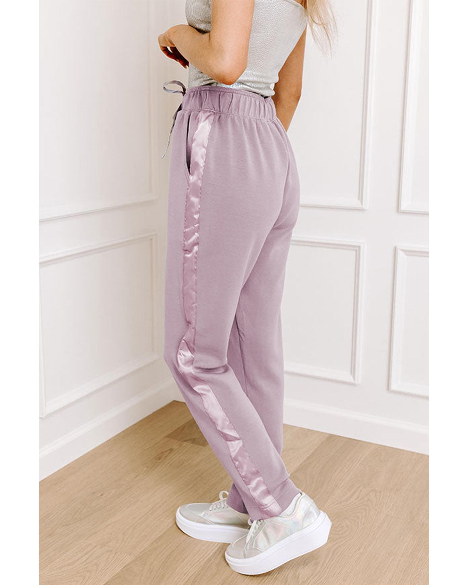 Orchid Petal Drawstring Waist Satin Stripe Patch Straight Leg High Waist Pants – L