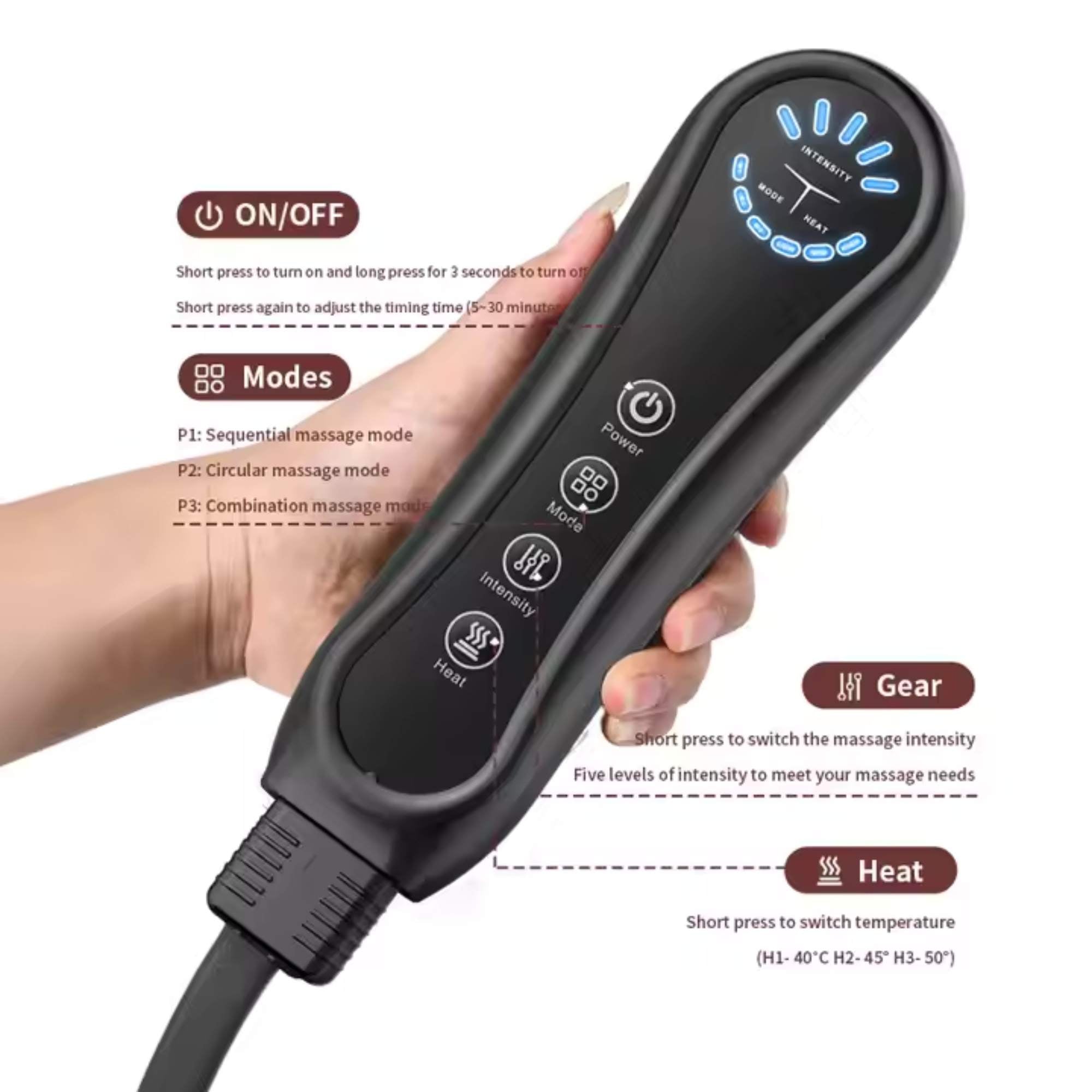 - Massage Modes: 3 Modes (Sequential, Circular, Full Coverage)