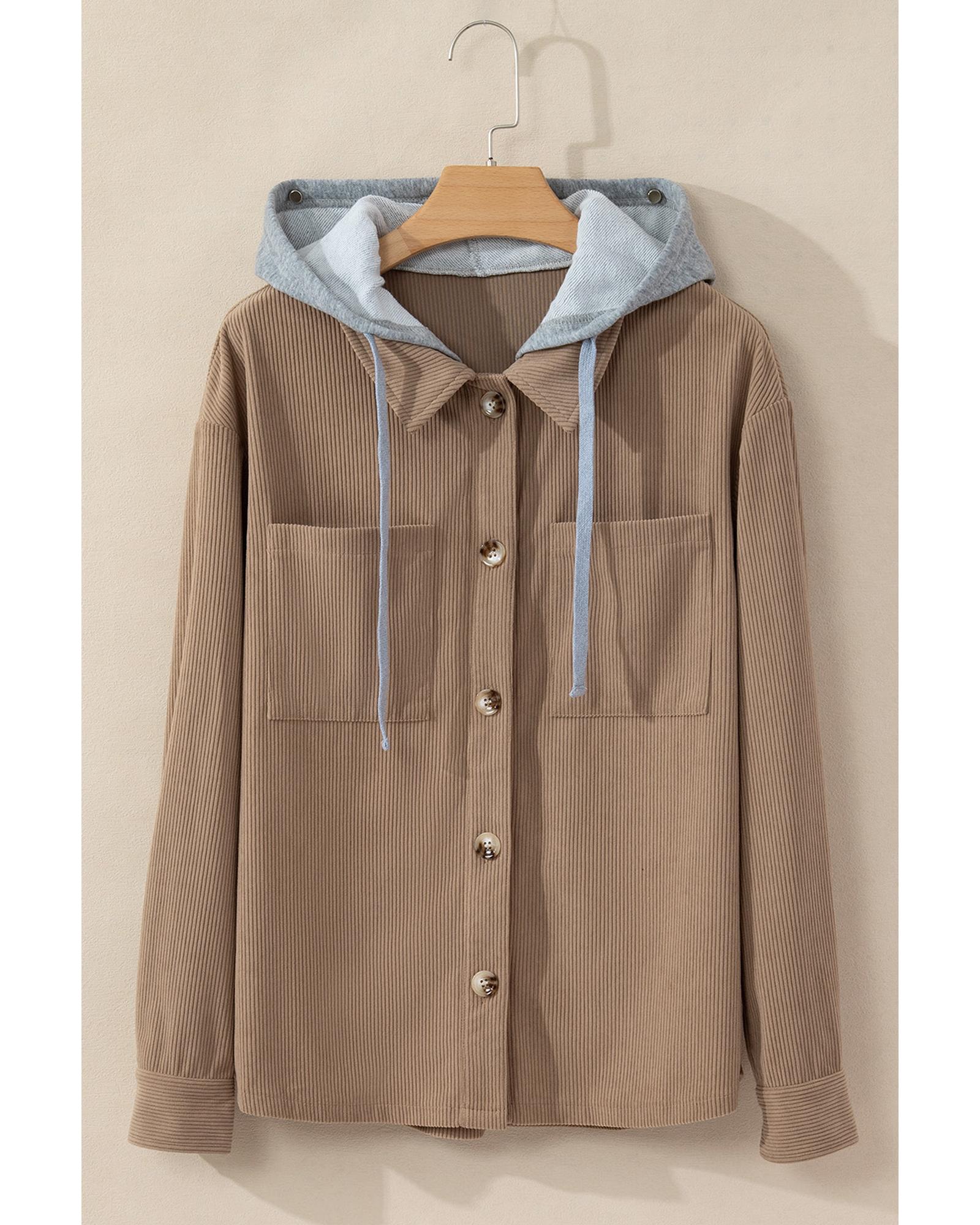 Pale Khaki Hooded Drawstring Pockets Corduroy Shacket – XL