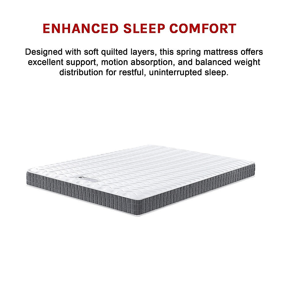 - Enhanced Sleep Comfort Designed with soft quilted layers, this spring mattress offers excellent support, motion absorption, and balanced weight distribution for restful, uninterrupted sleep.