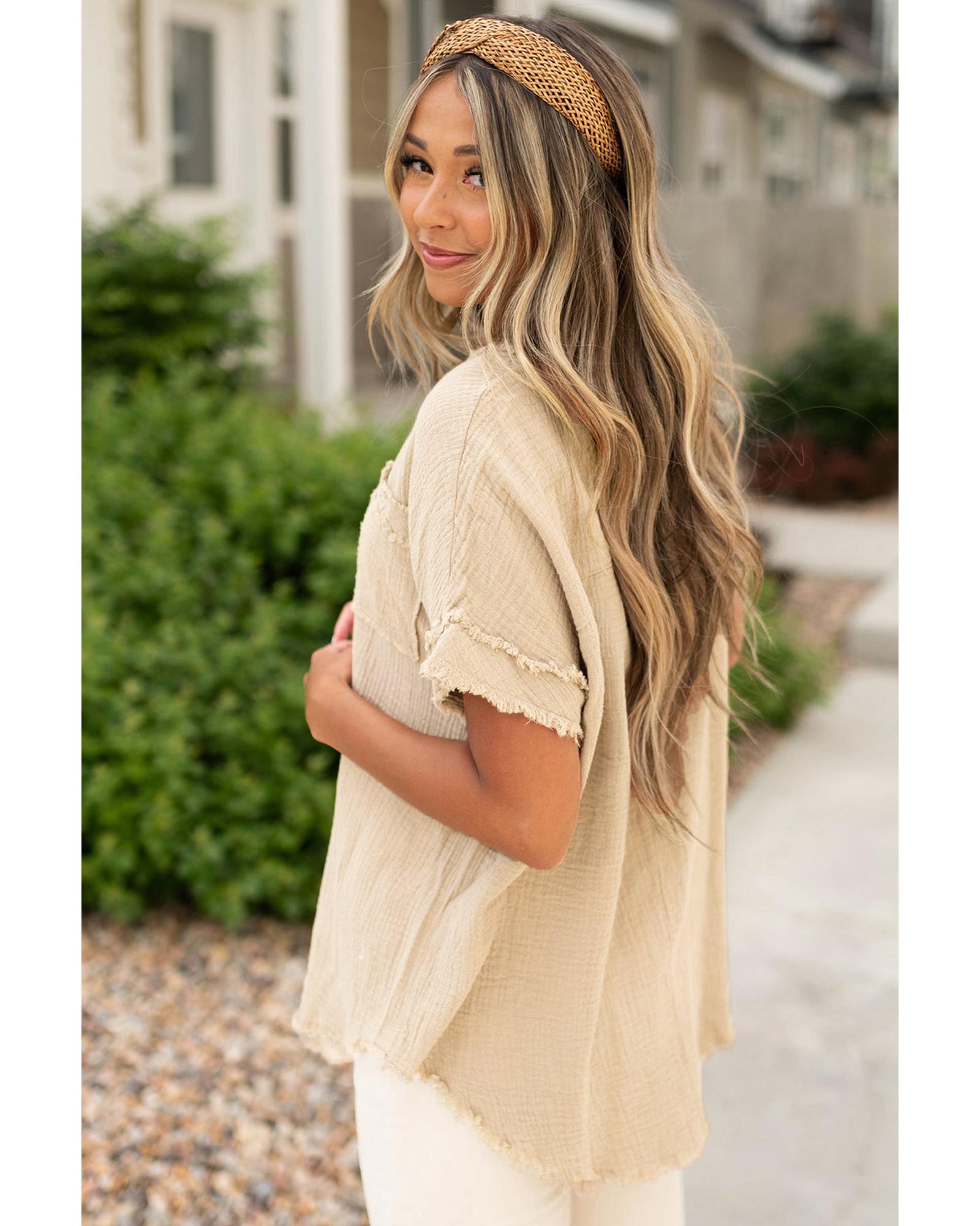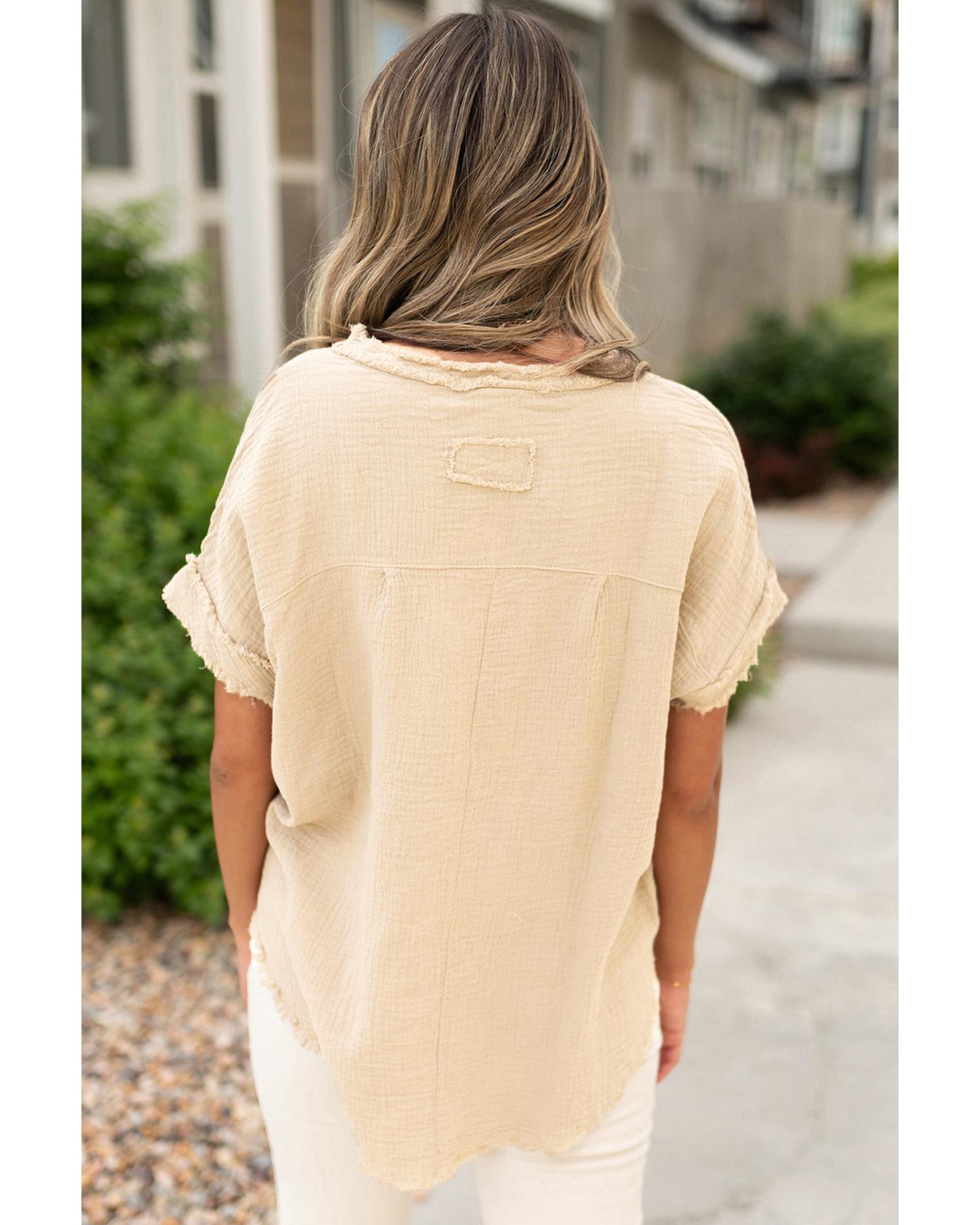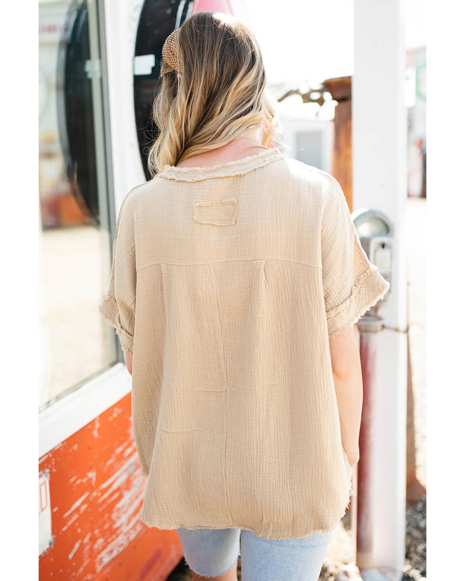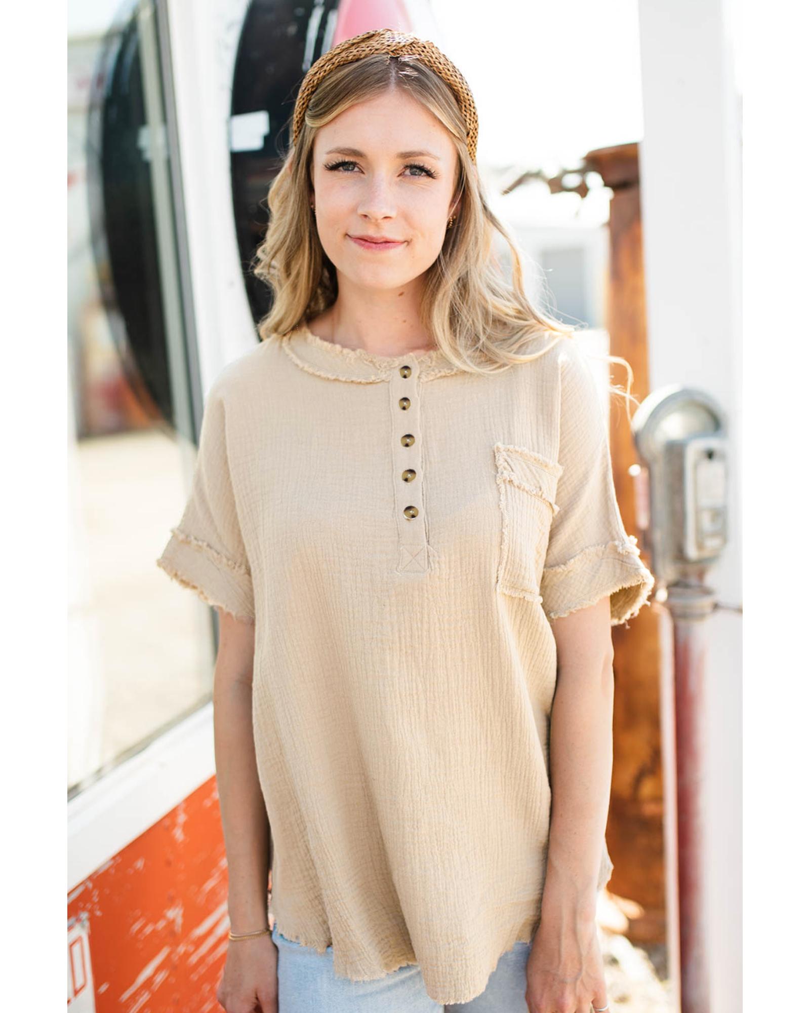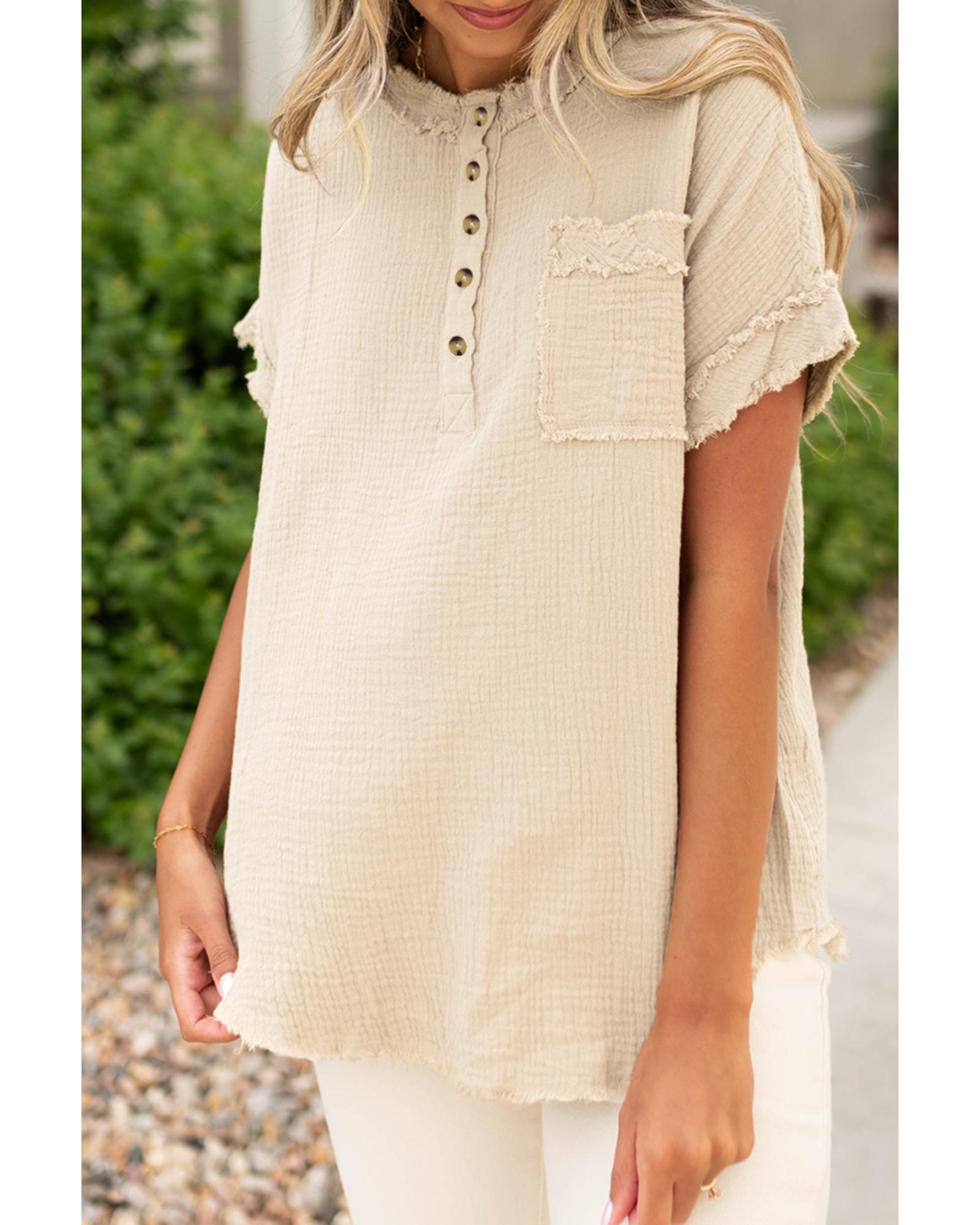 Parchment Crinkle Textured Frayed Trim Half Button Short Sleeve Top – S