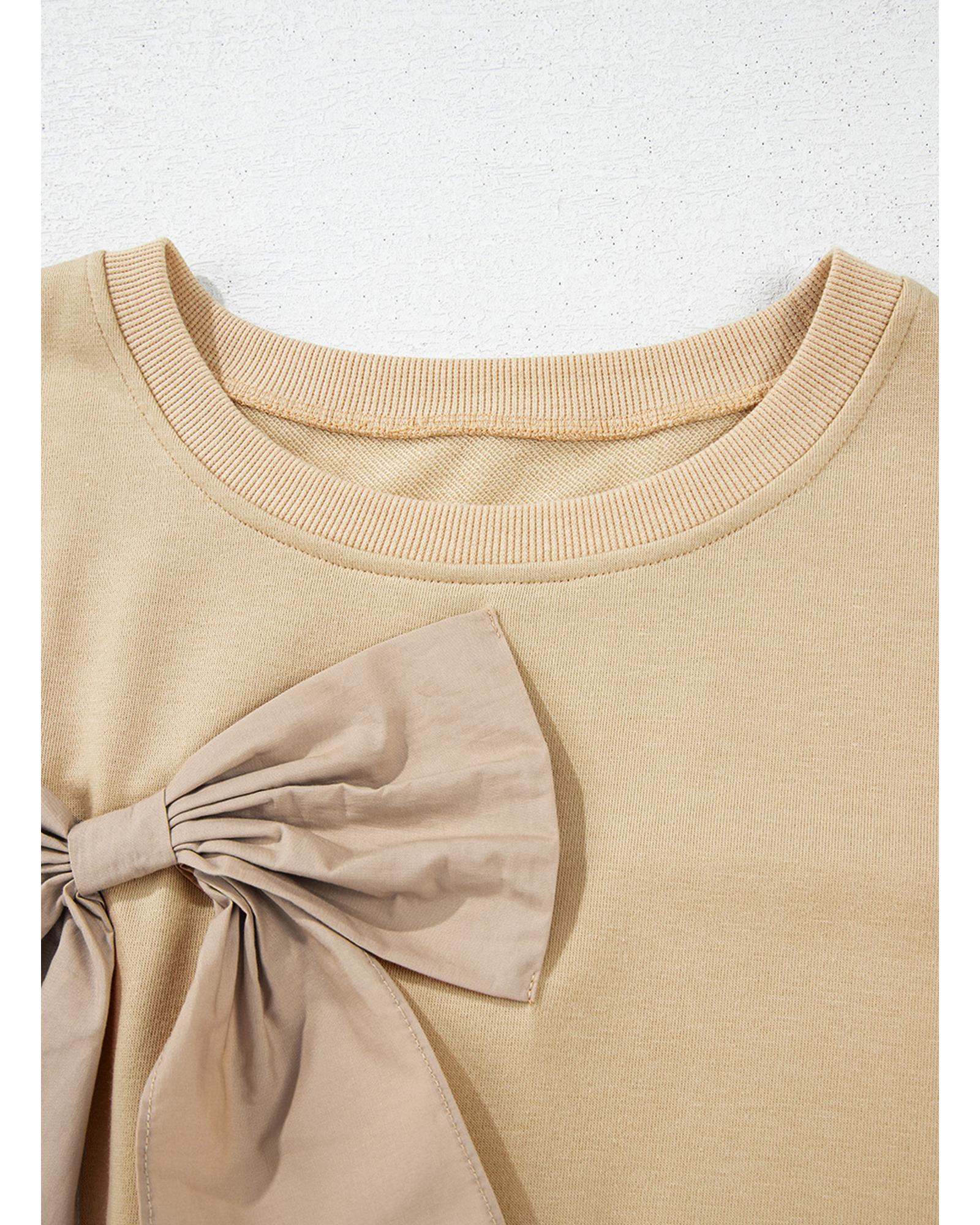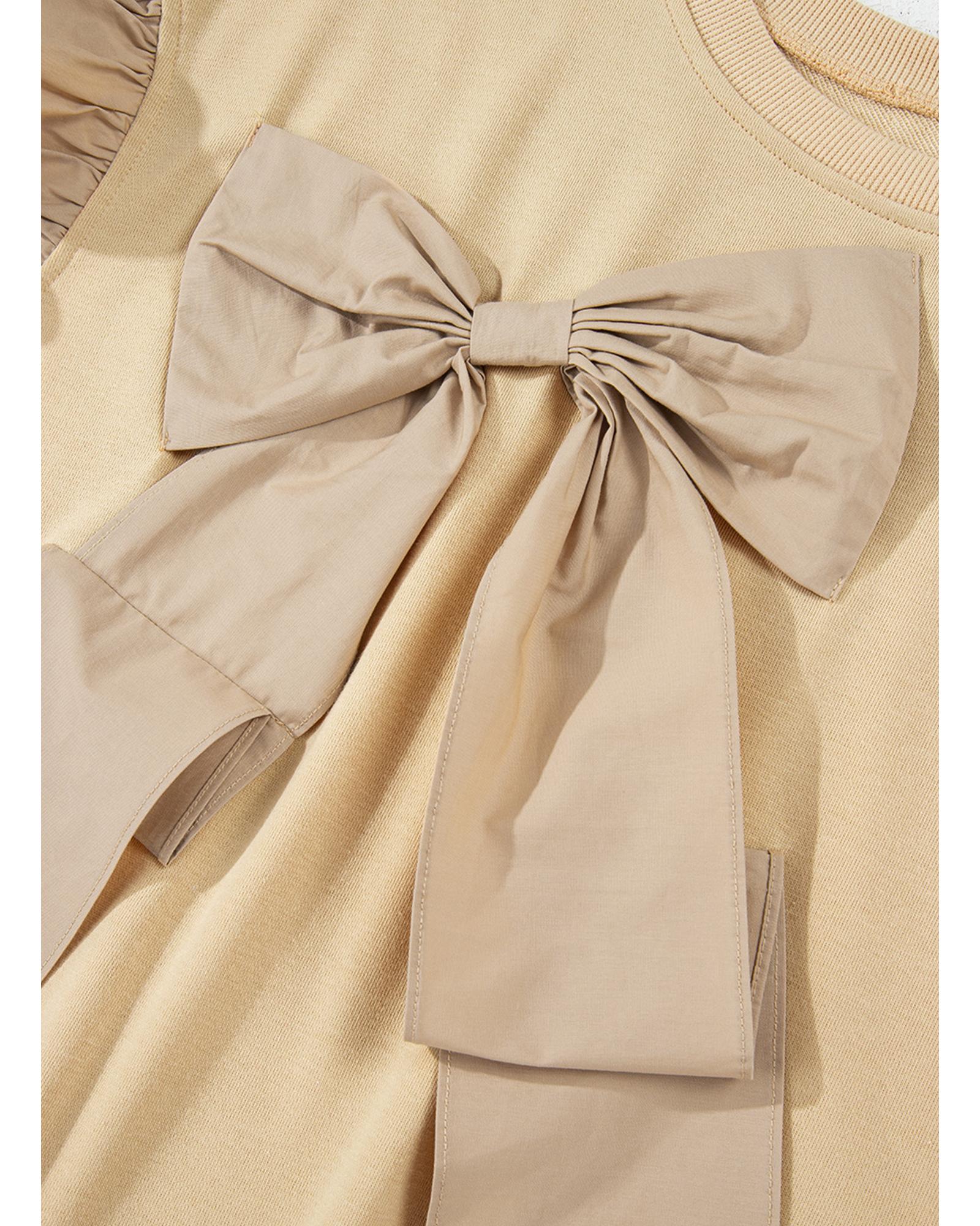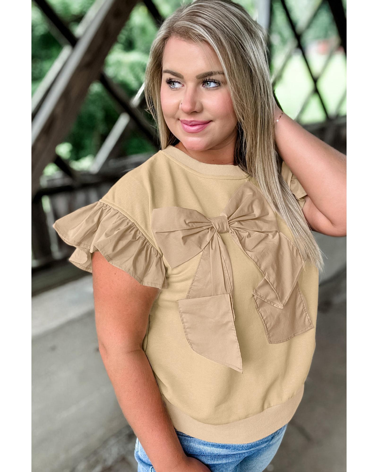 Parchment Ruffled Short Sleeve Bowknot Applique Crew Neck Plus Size Top – 2X