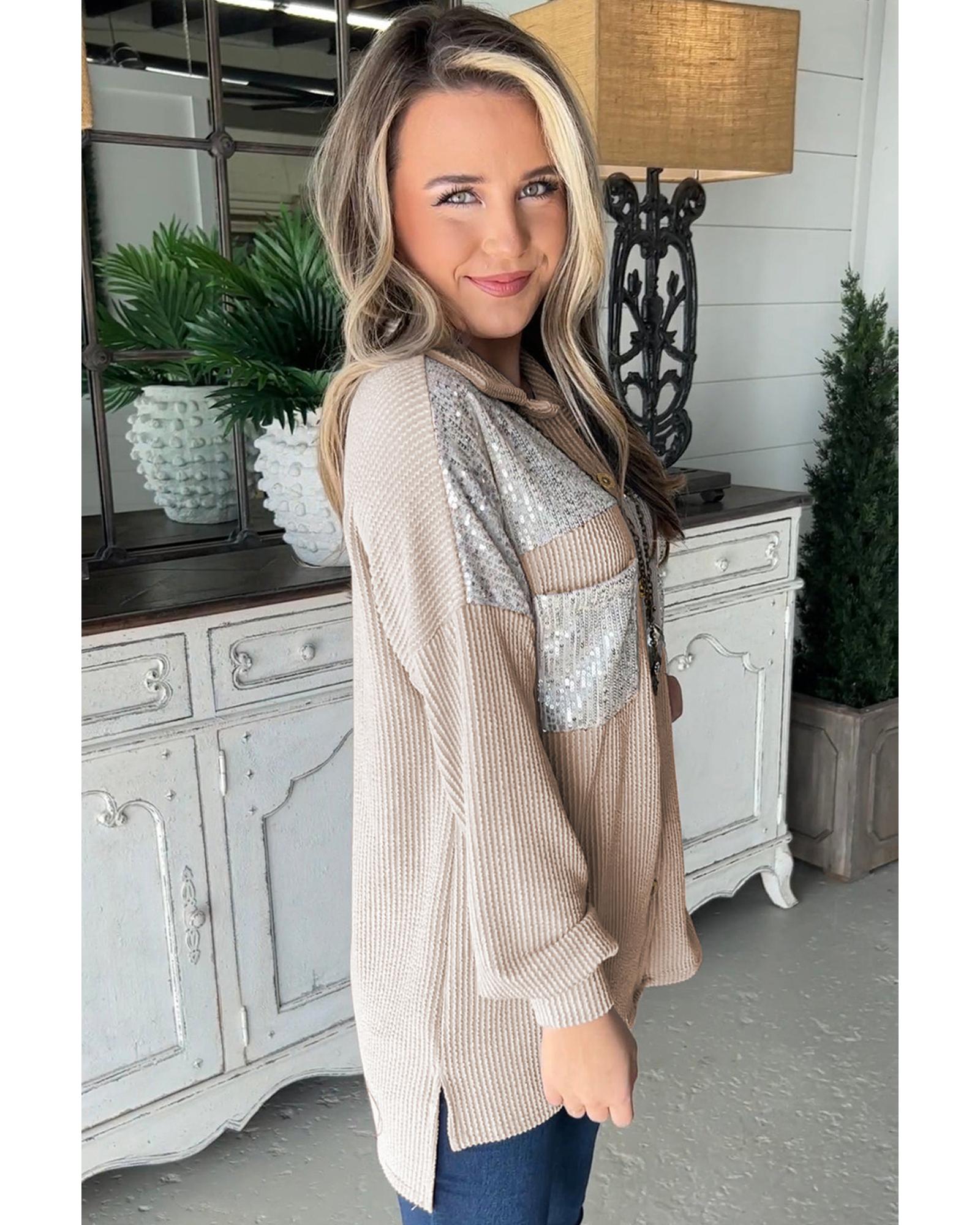 - Sequin patch adds sparkle to the shacket