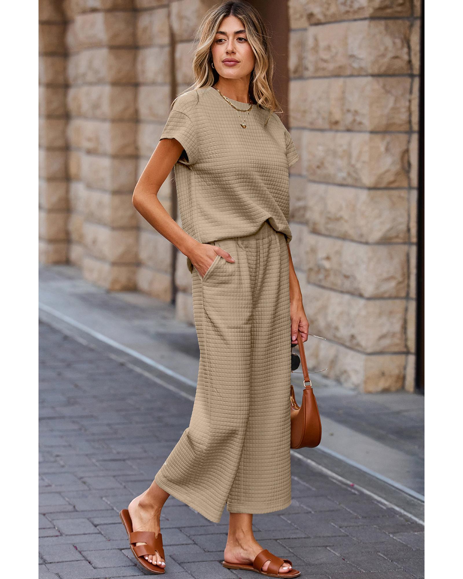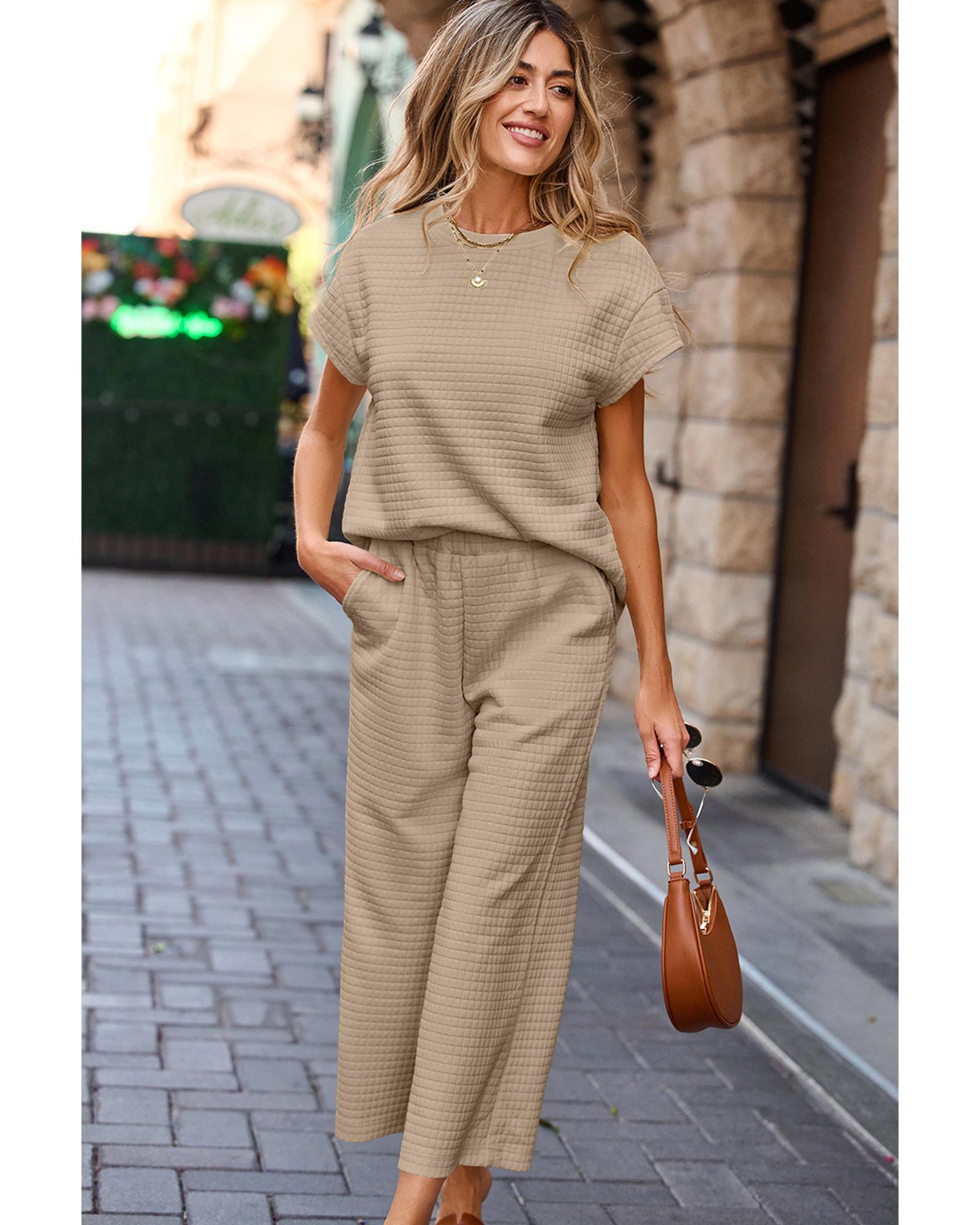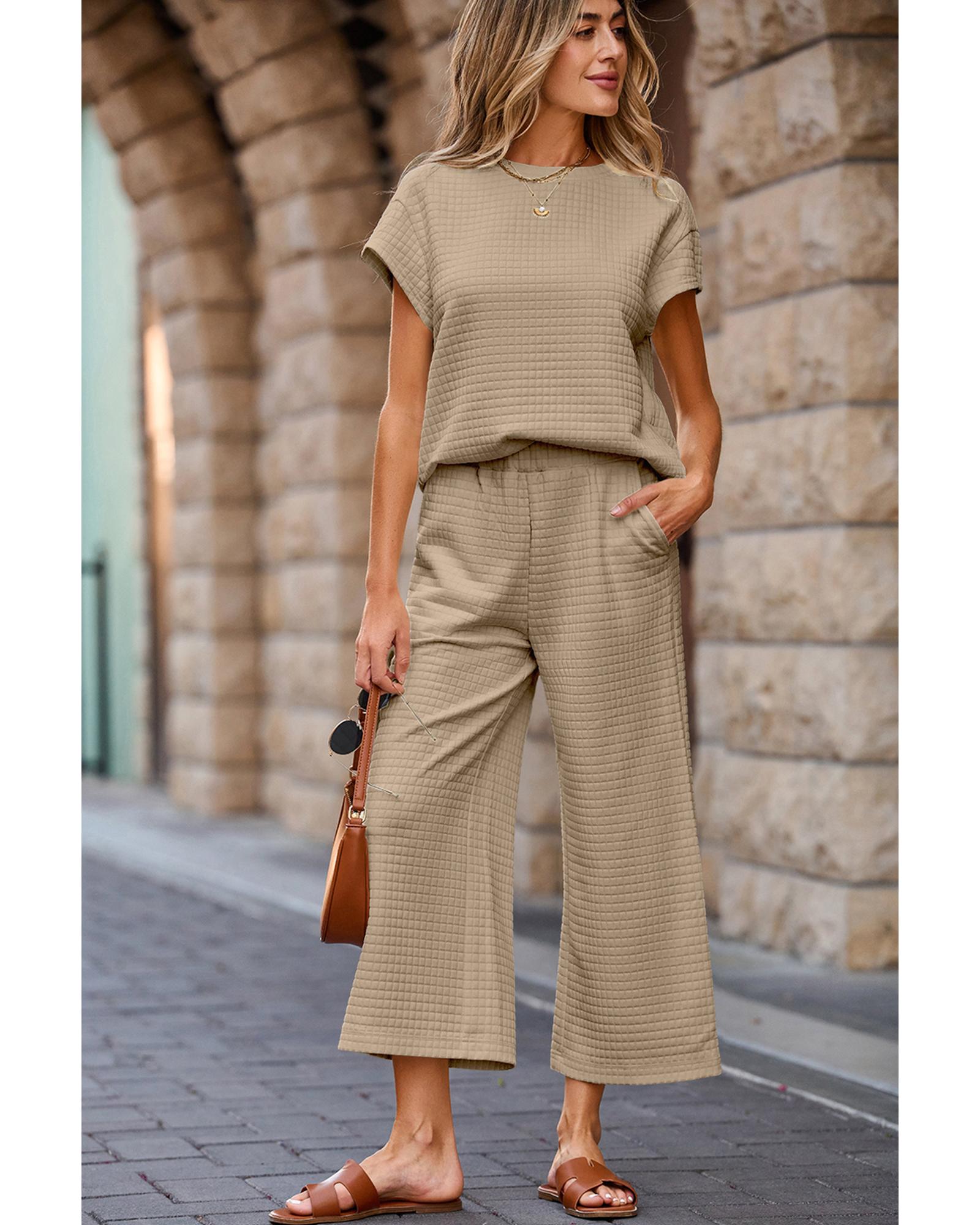 Parchment Solid Color Textured Short Sleeve Top and Casual Pants Set – M