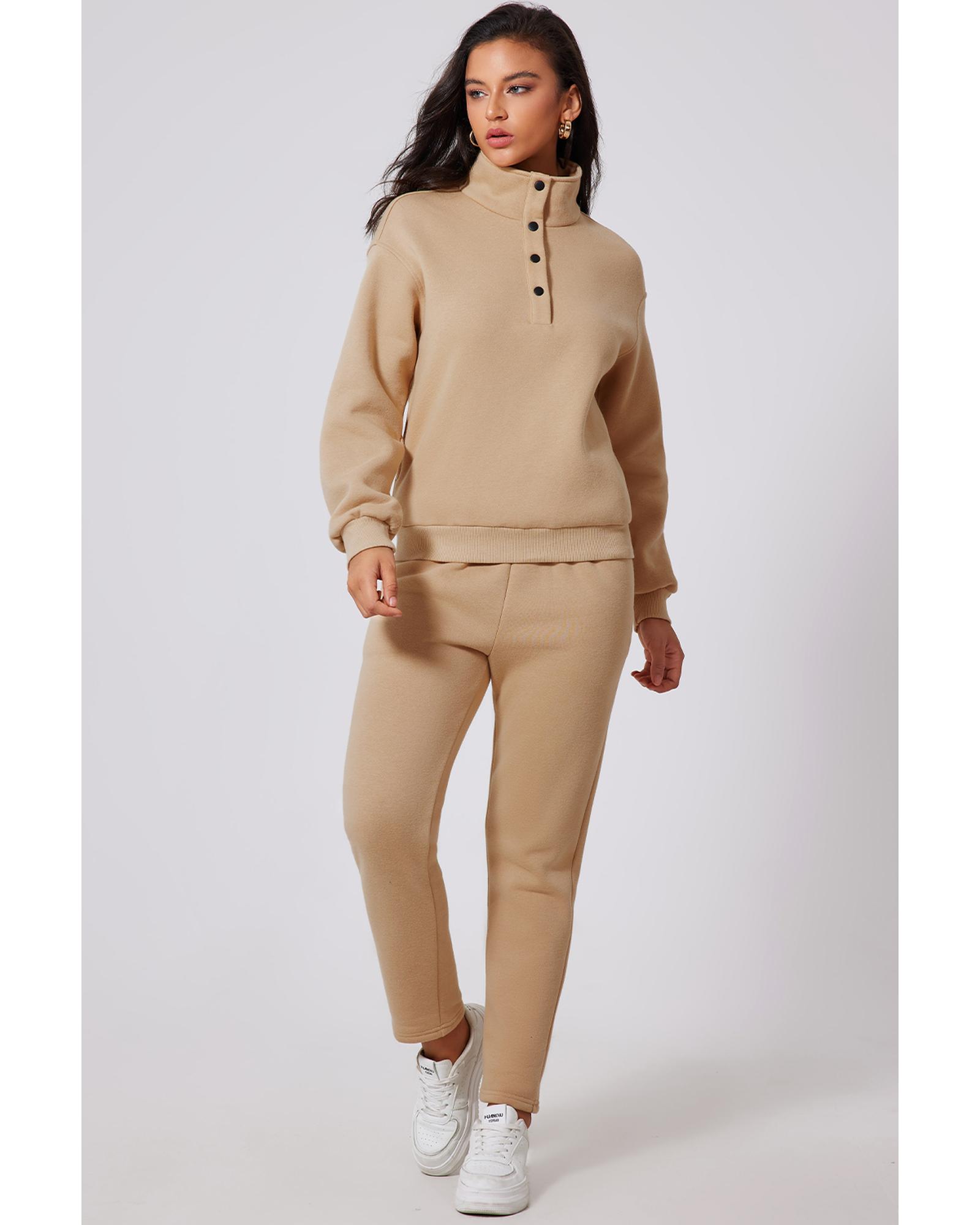 - Chic Parchment Solid Half Button Sweatshirt and High Waist Sweatpants Set