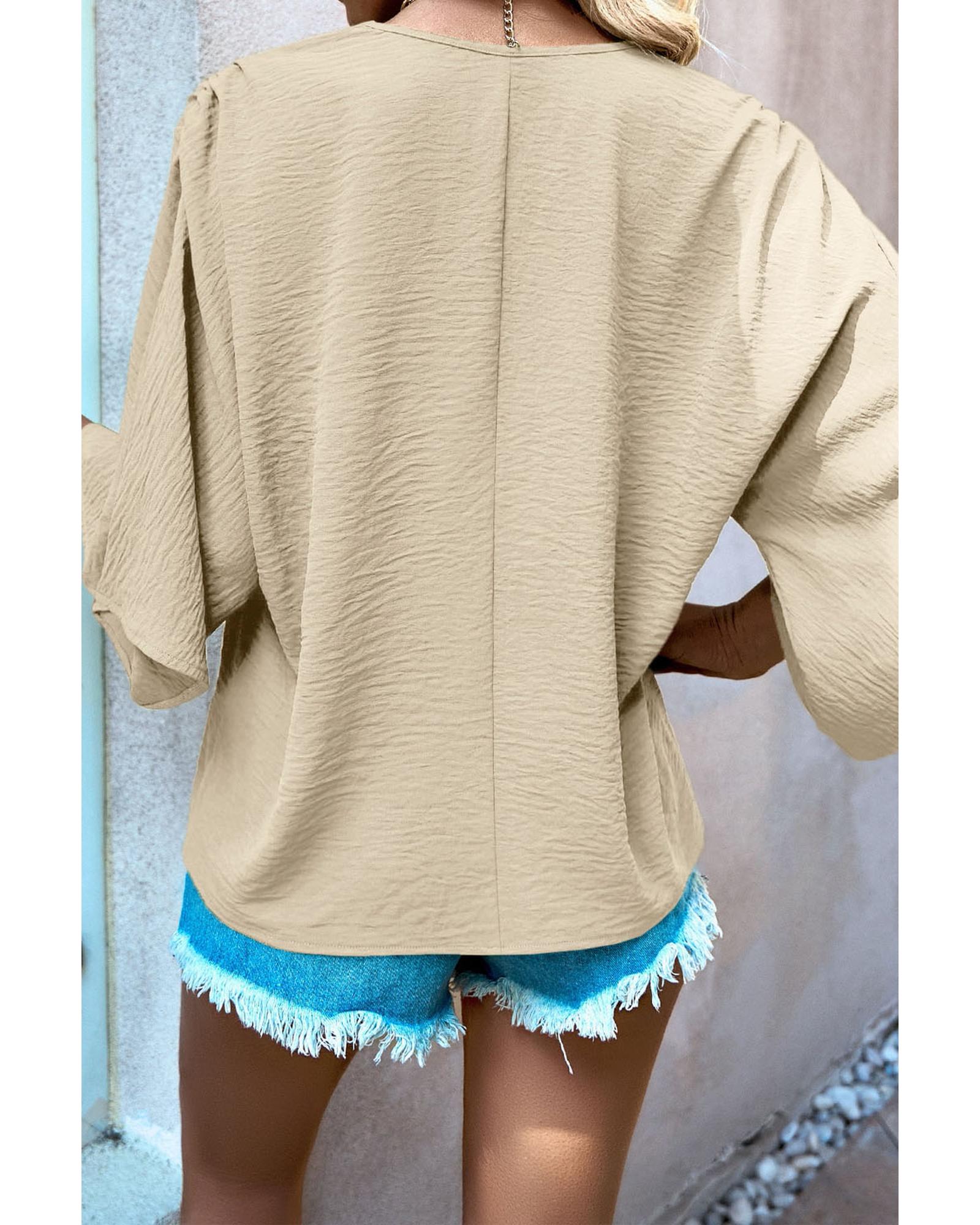 Parchment Solid V Neck Wide Sleeve Crinkled Blouse – L