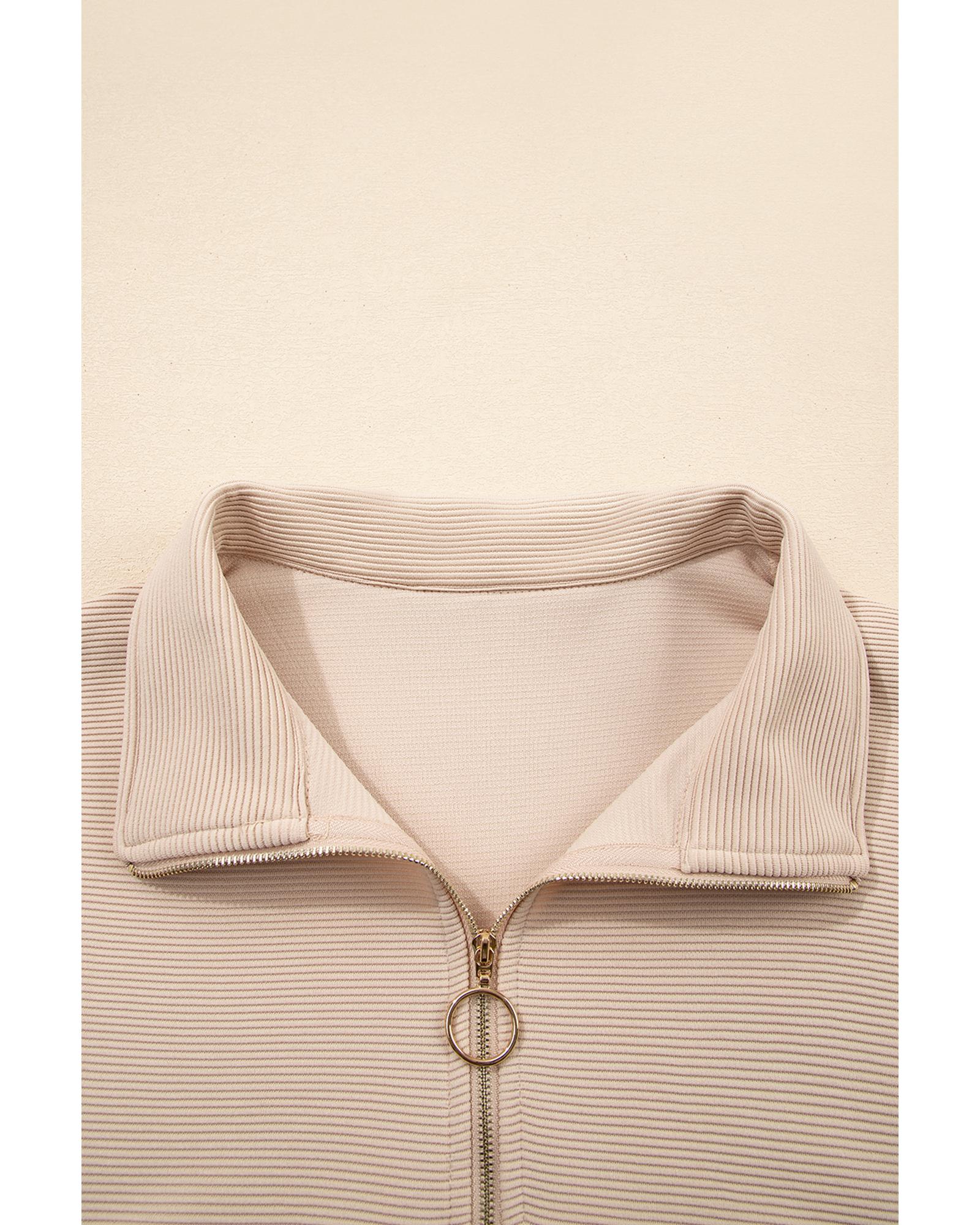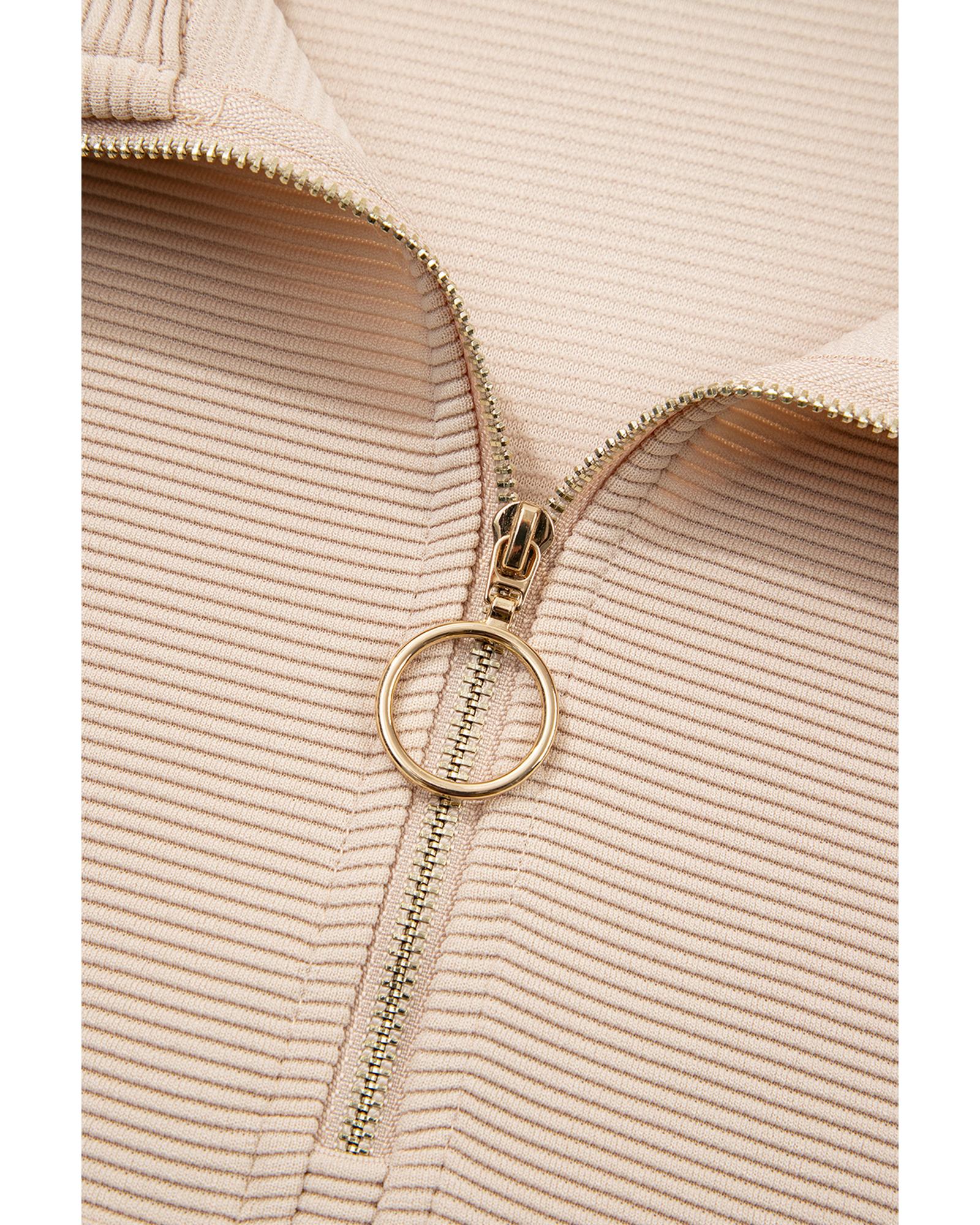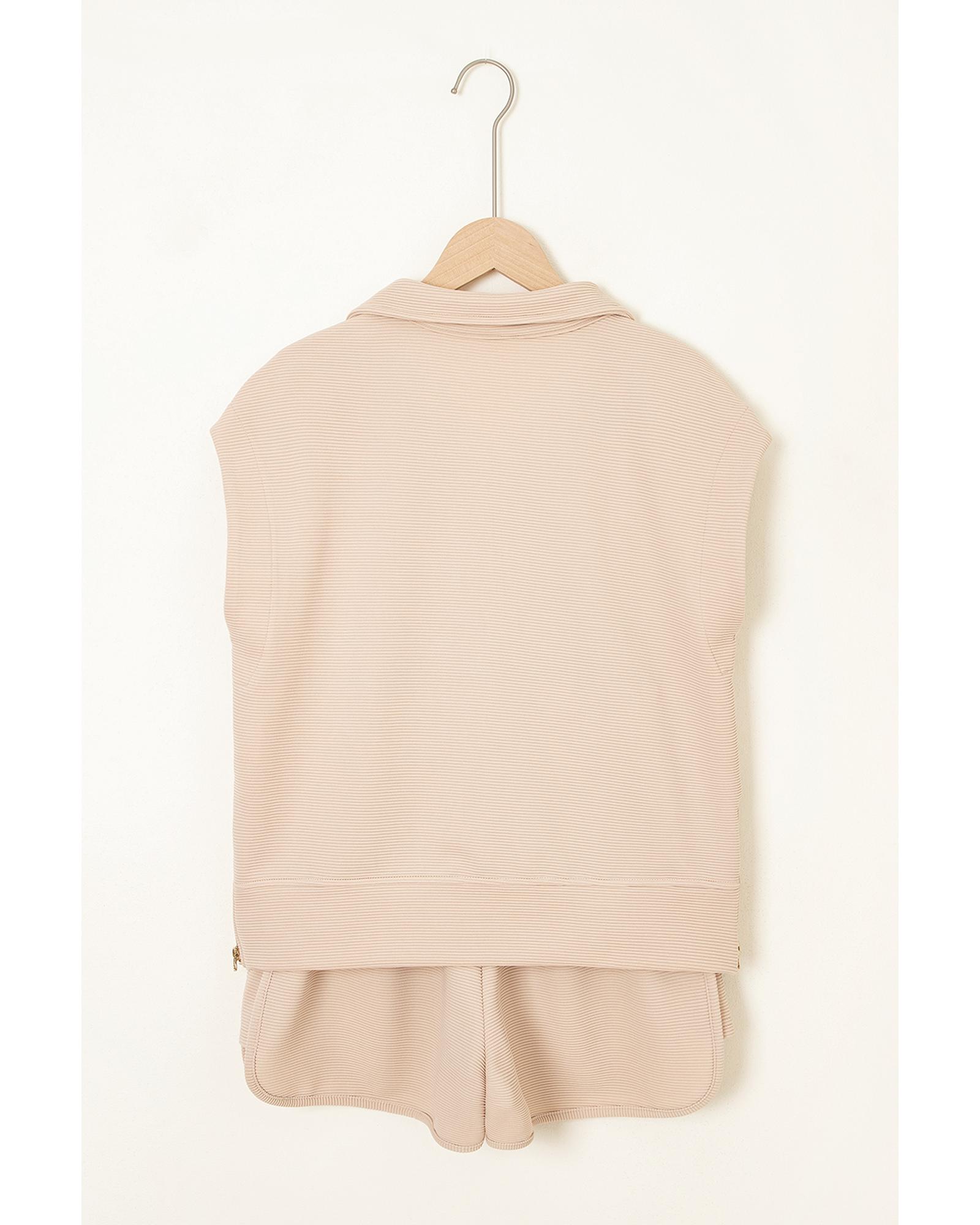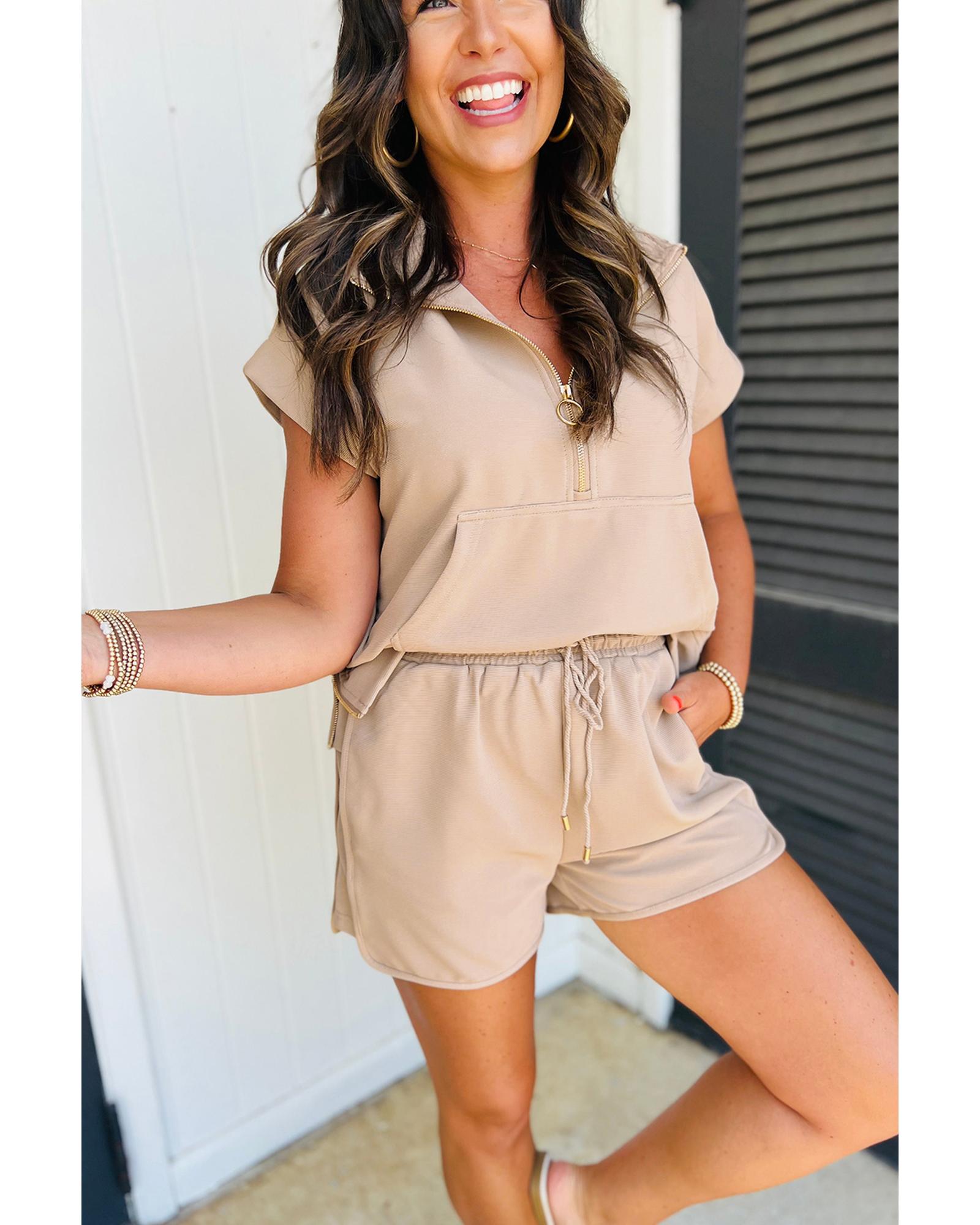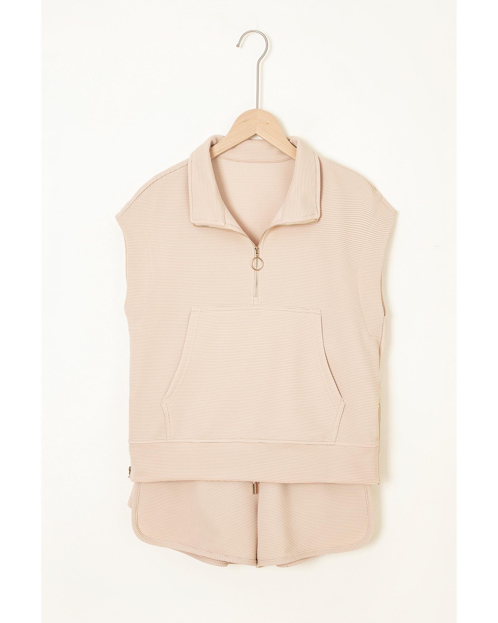 Parchment Textured Half Zip Kangaroo Pocket Top Drawstring Shorts Set – S