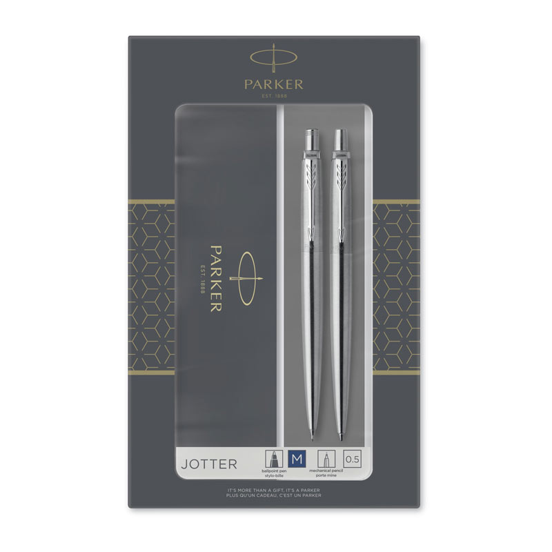 PARKER DUO SET JOTTER BP SS/CT / MECHANICAL PENCIL INCLUDES A STYLISH STAINESS STEEL RETRACTABLE BALLPOINT PEN AND MATCHING MECHANICAL PENCIL WITH CHROME TRIM. PENCIL SUPPLIED WITH HB 0.5MM SIZE GRAPHITE LEAD WITH AN ERASER. GIFTBOX INCLUDED.