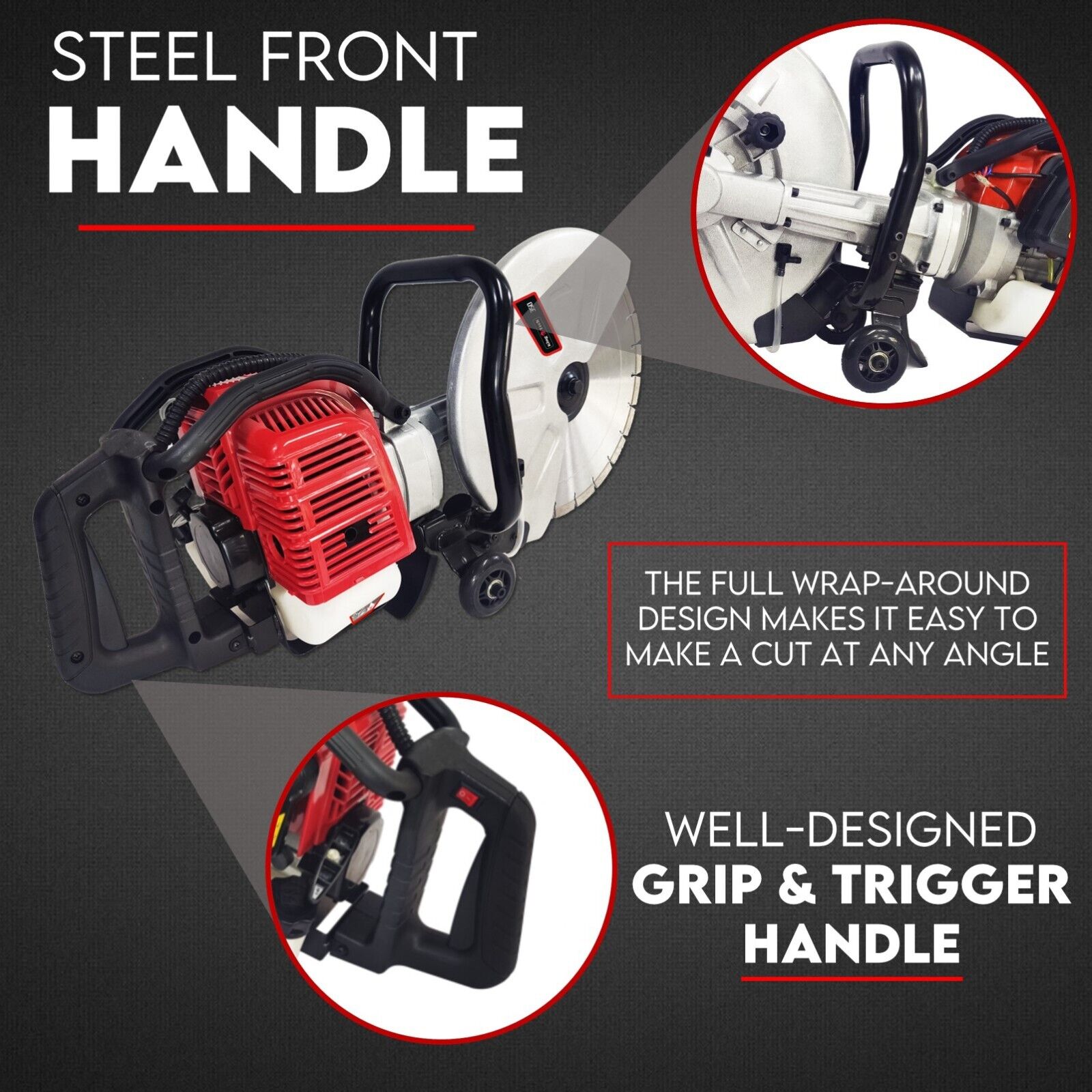 • Steel Front Handle. Gives the user total control and lives up to the toughest jobs. The full wrap-around design makes it easy to make a cut at any angle.