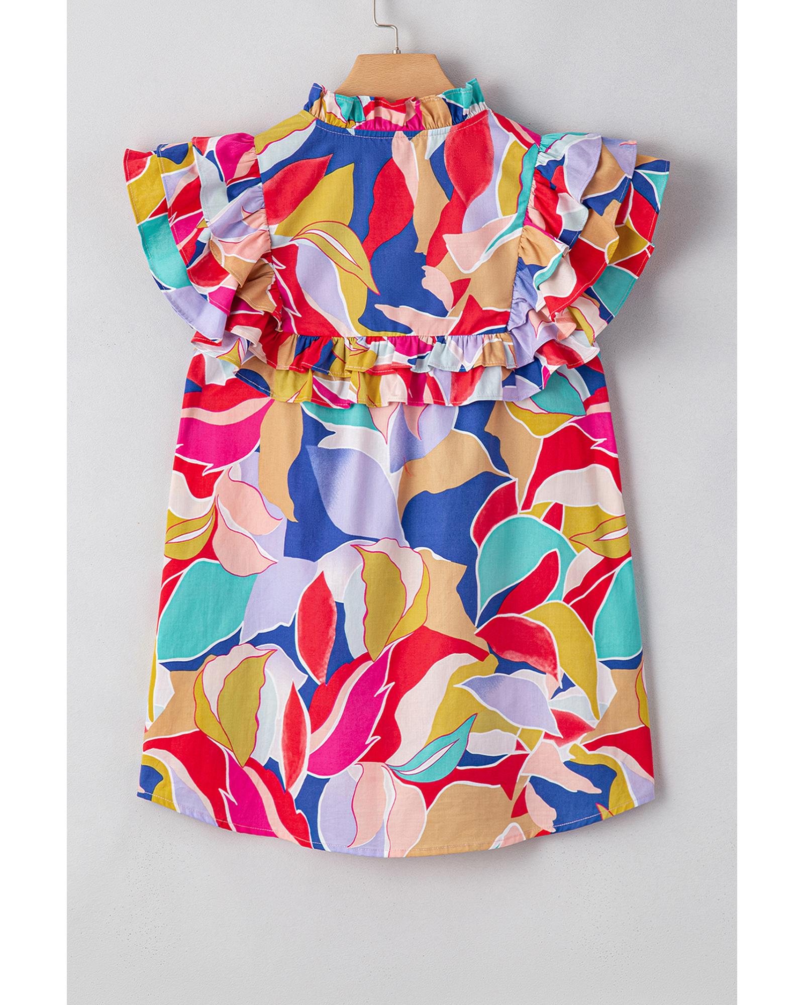 Pink Abstract Printed Ruffled Flutter Sleeve Tied Split V Neck Blouse – XL