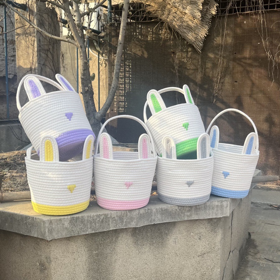 Pink And White Stitching Charming Easter Egg Tote Basket – Cute Rabbit-Themed Handwoven Cotton Rope Candy Holder