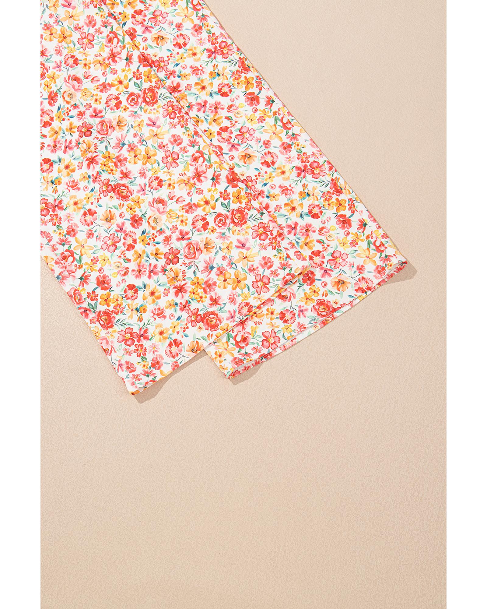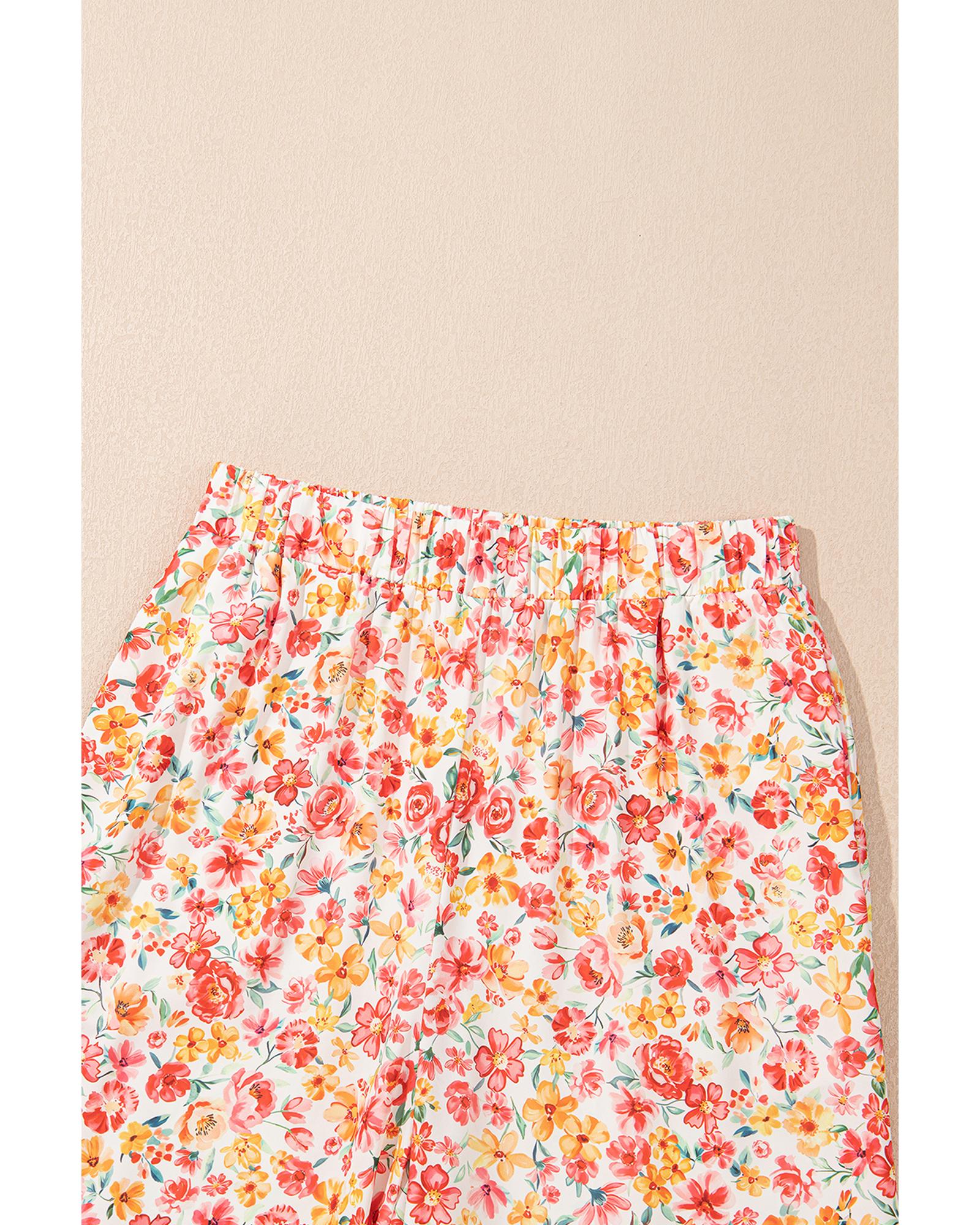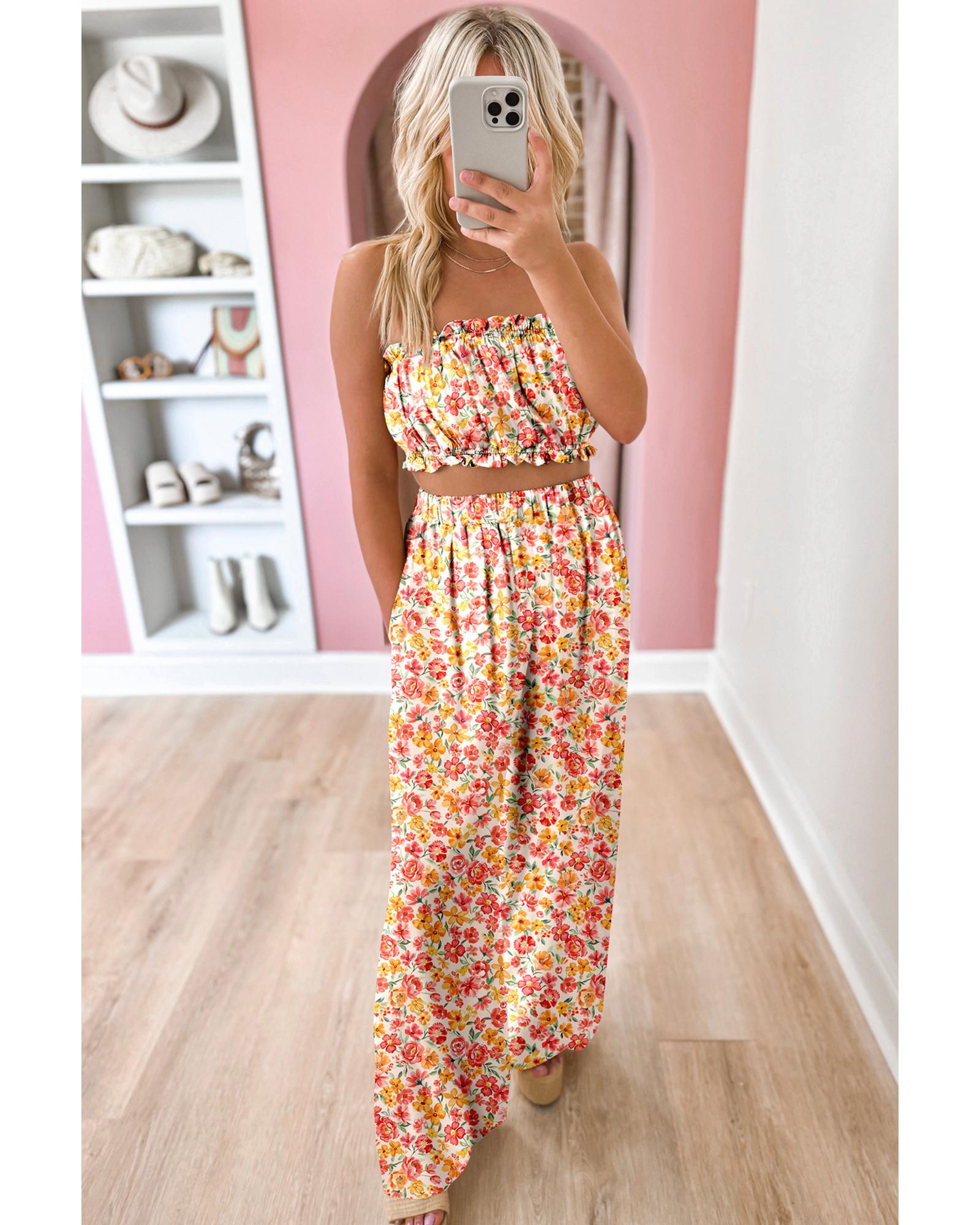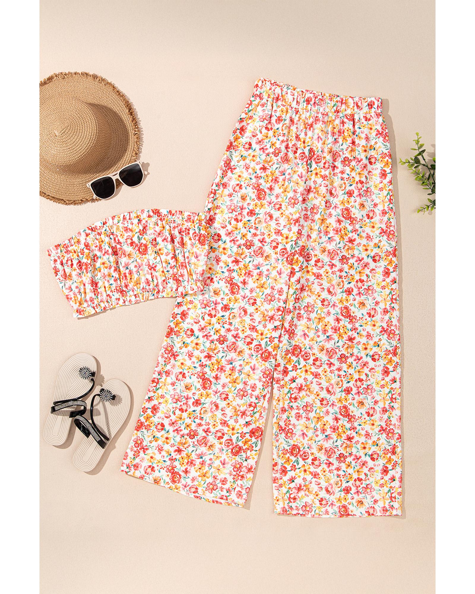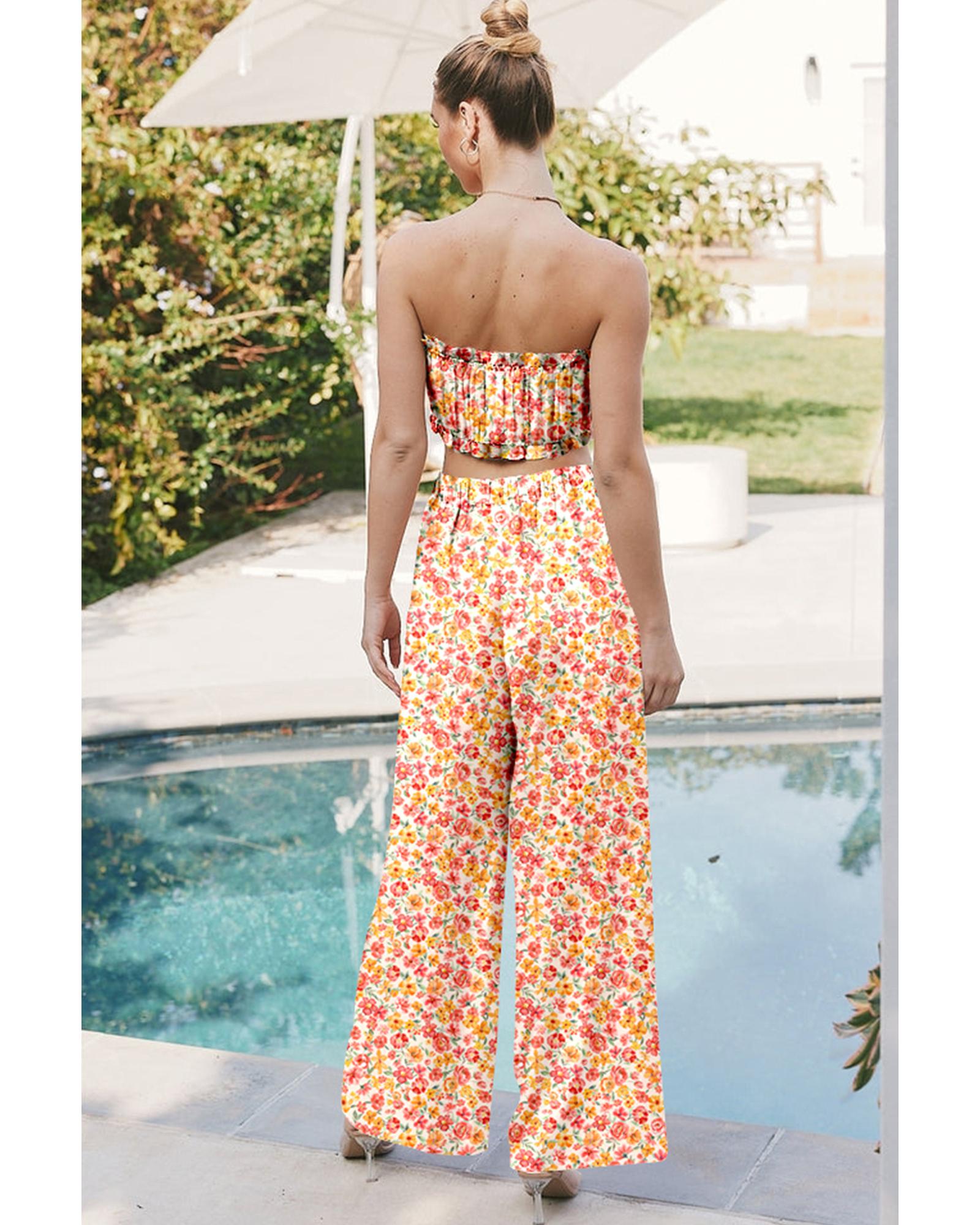 - Pink Boho Floral Bandeau Top and High Waist Wide Leg Pants Set