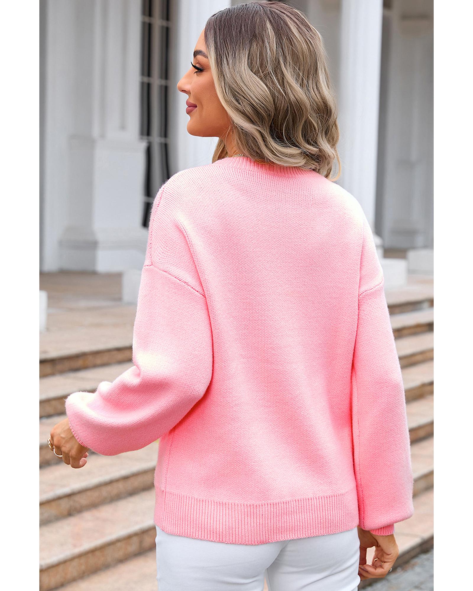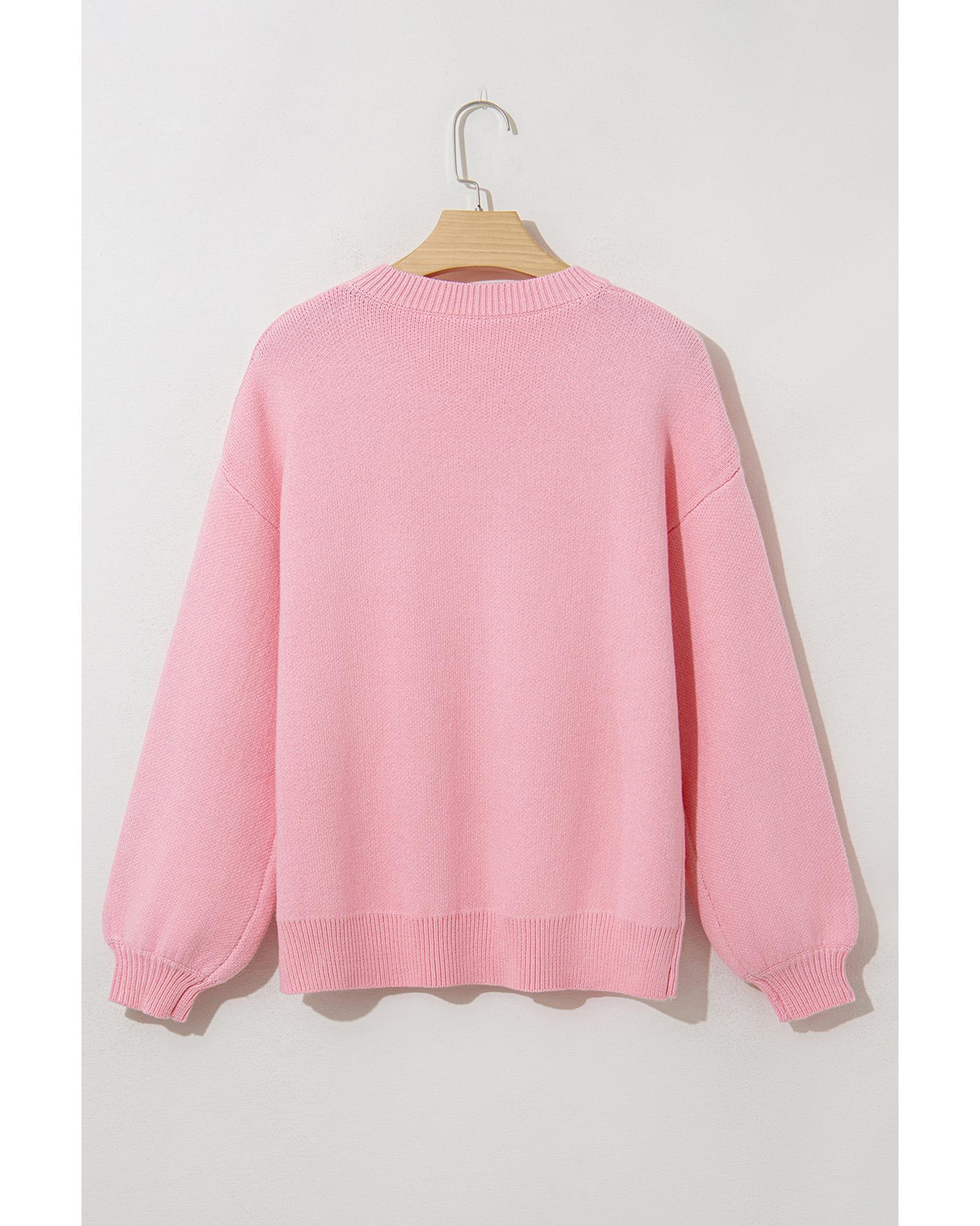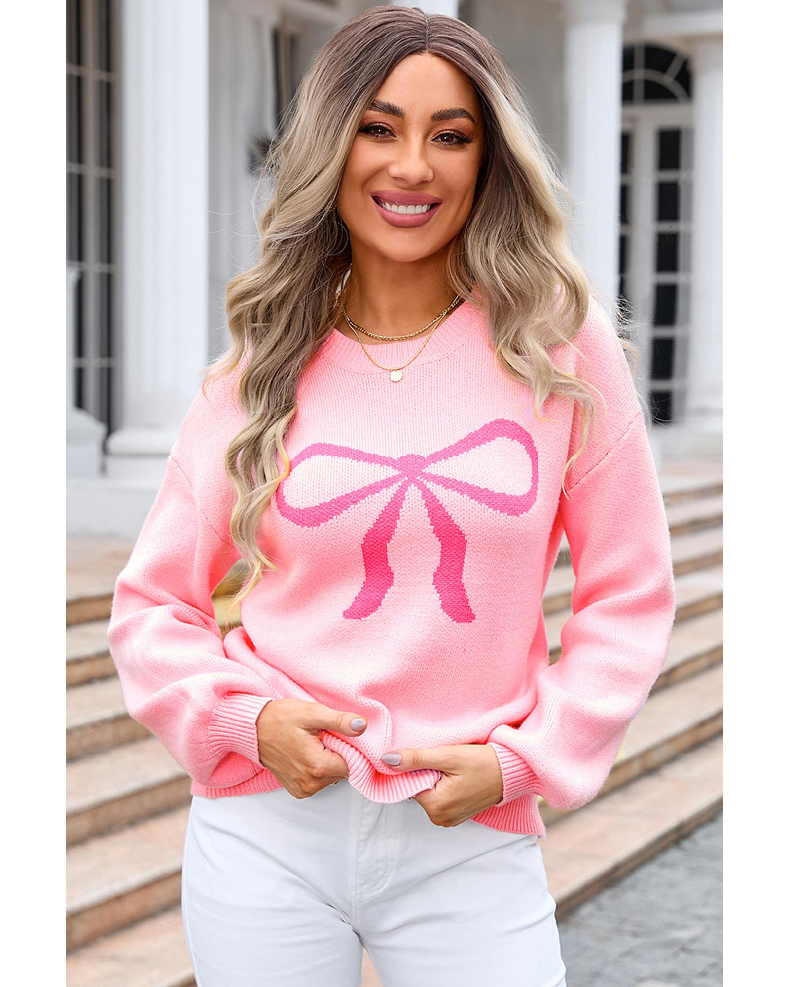 Pink Bow Graphic Drop Shoulder Round Neck Sweater – M