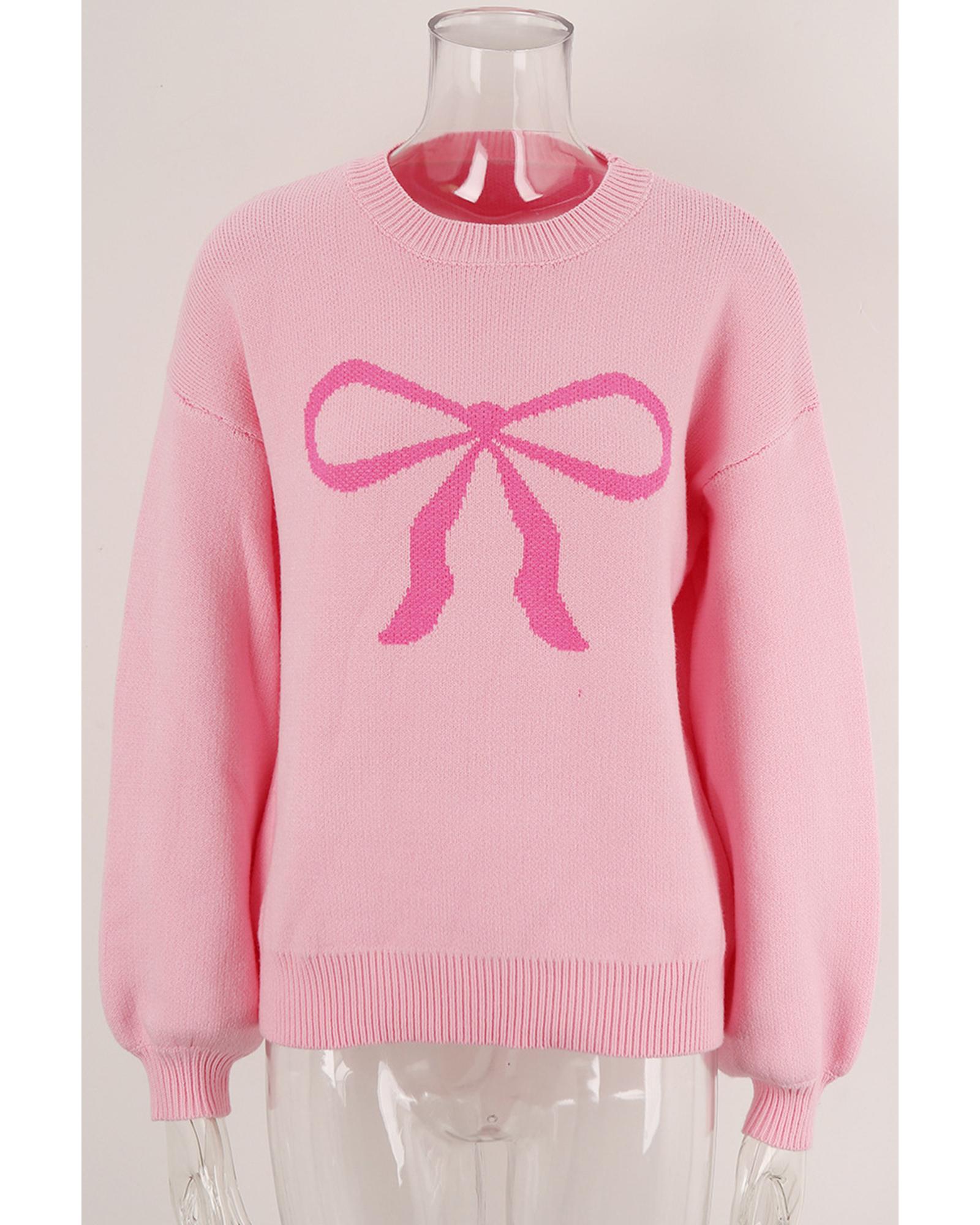 Pink Bow Graphic Drop Shoulder Round Neck Sweater - S
