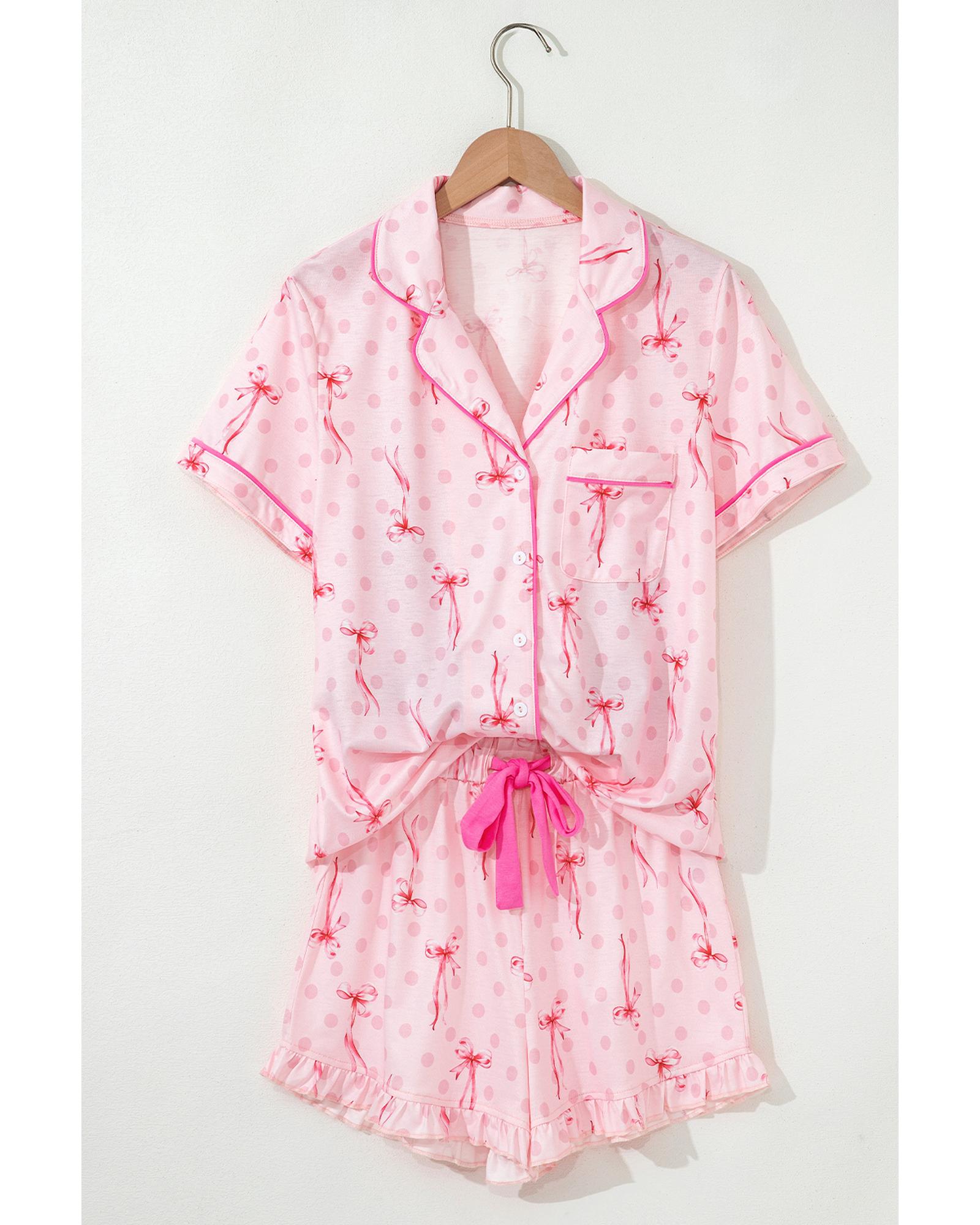 Pink Bow Print Contrast Pipping Short Pajamas Set – XL