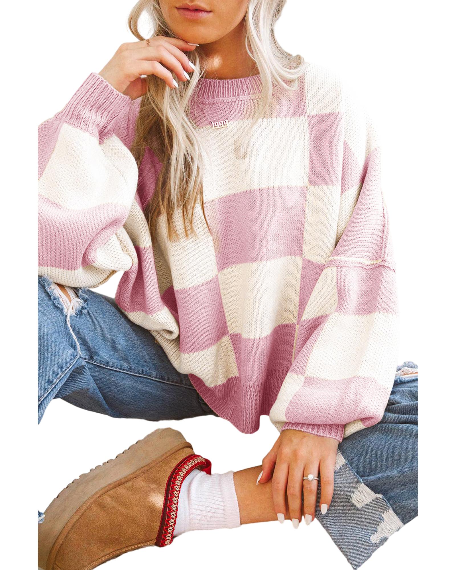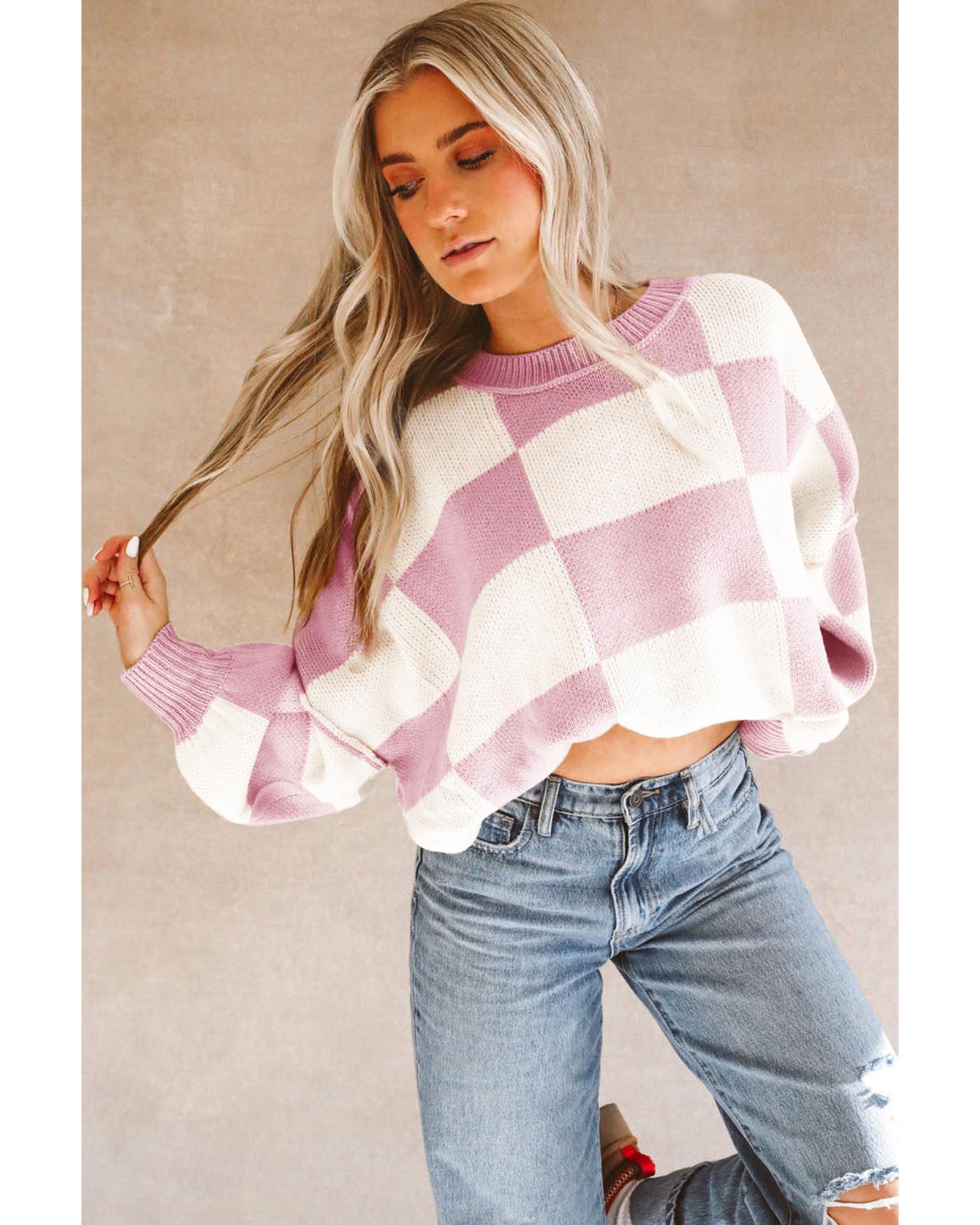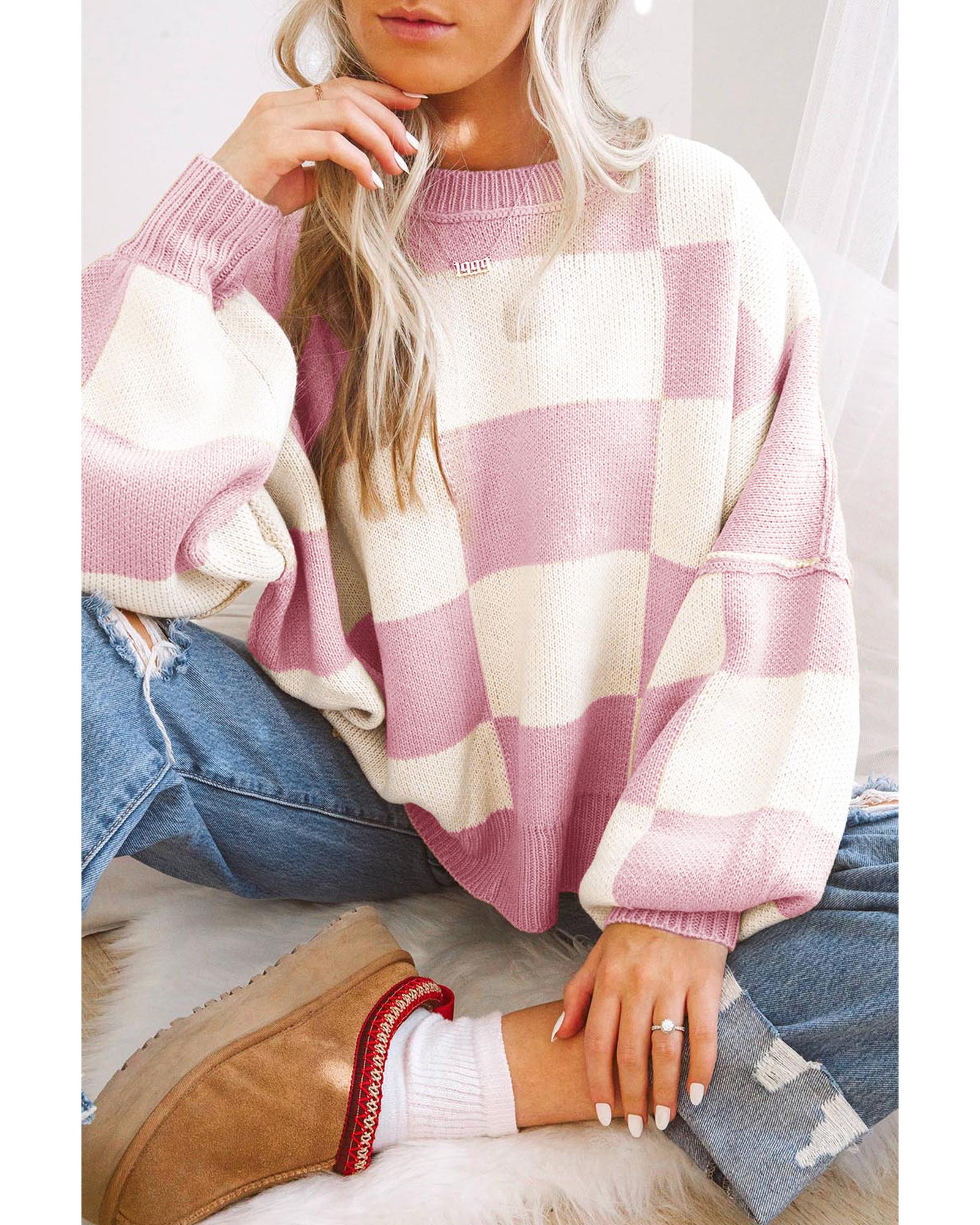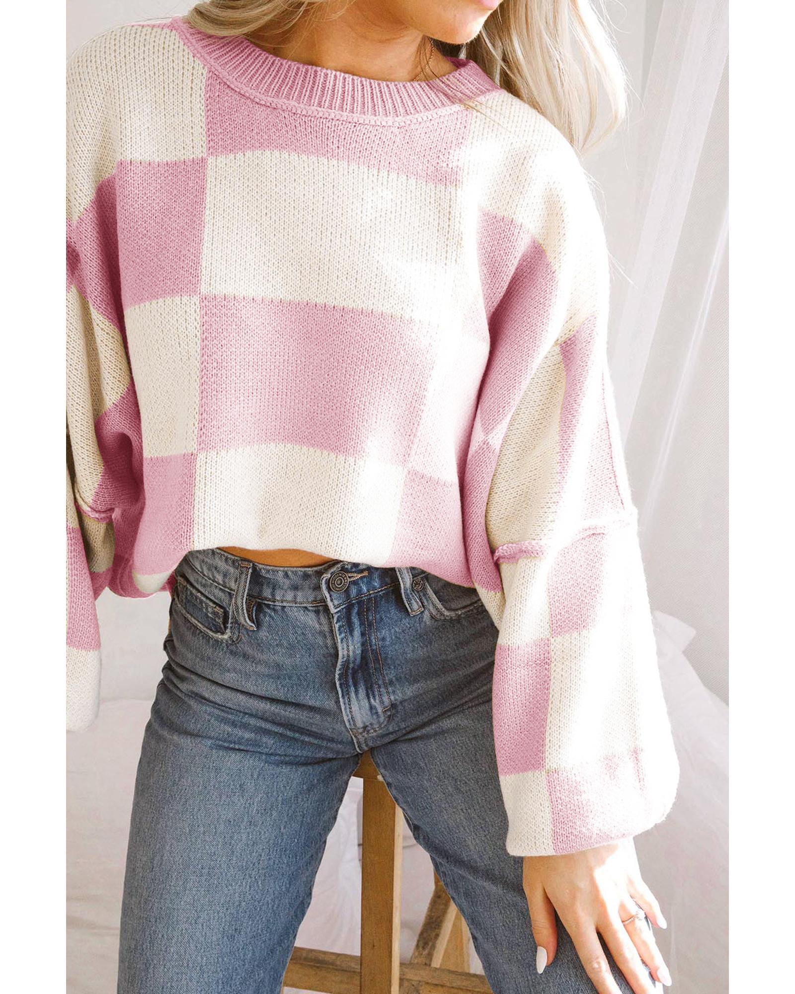 - Luxurious Pink Checkered Bishop Sleeve Sweater