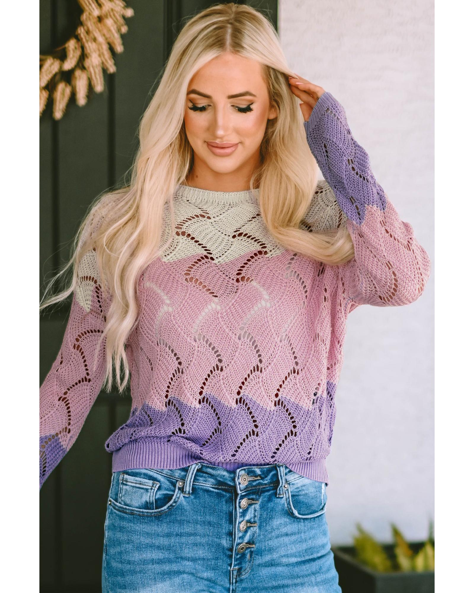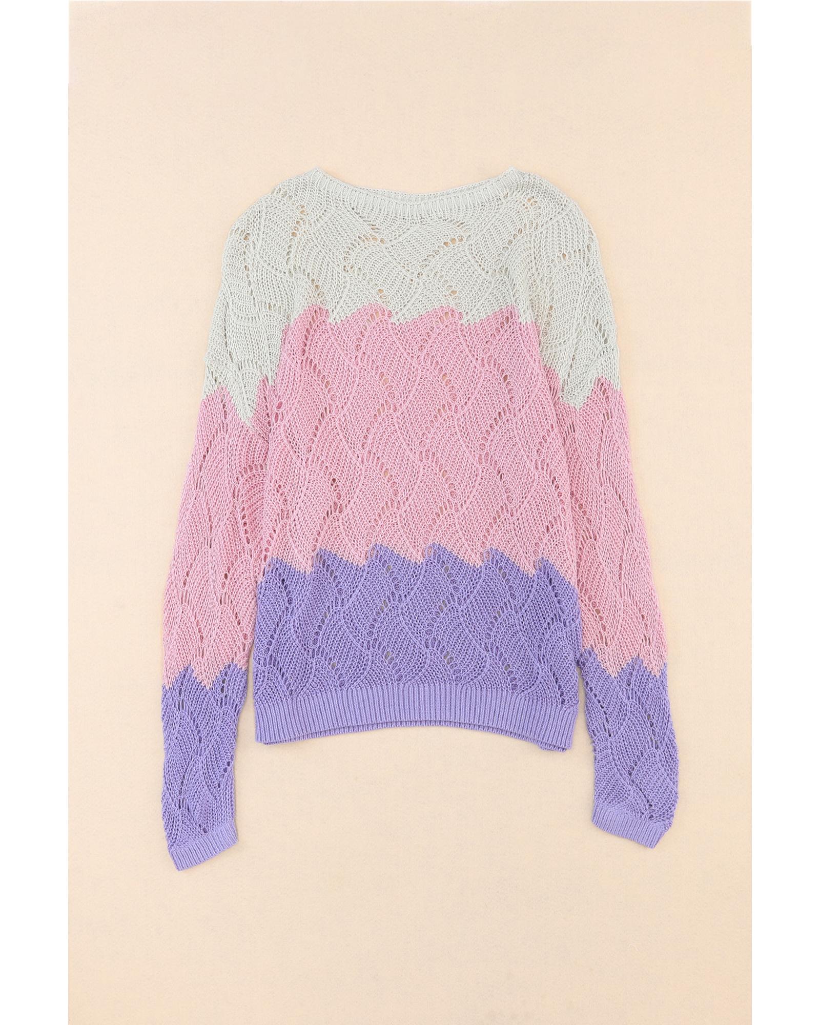 Pink Color Block Hollow Knitted Loose Sweater – XL