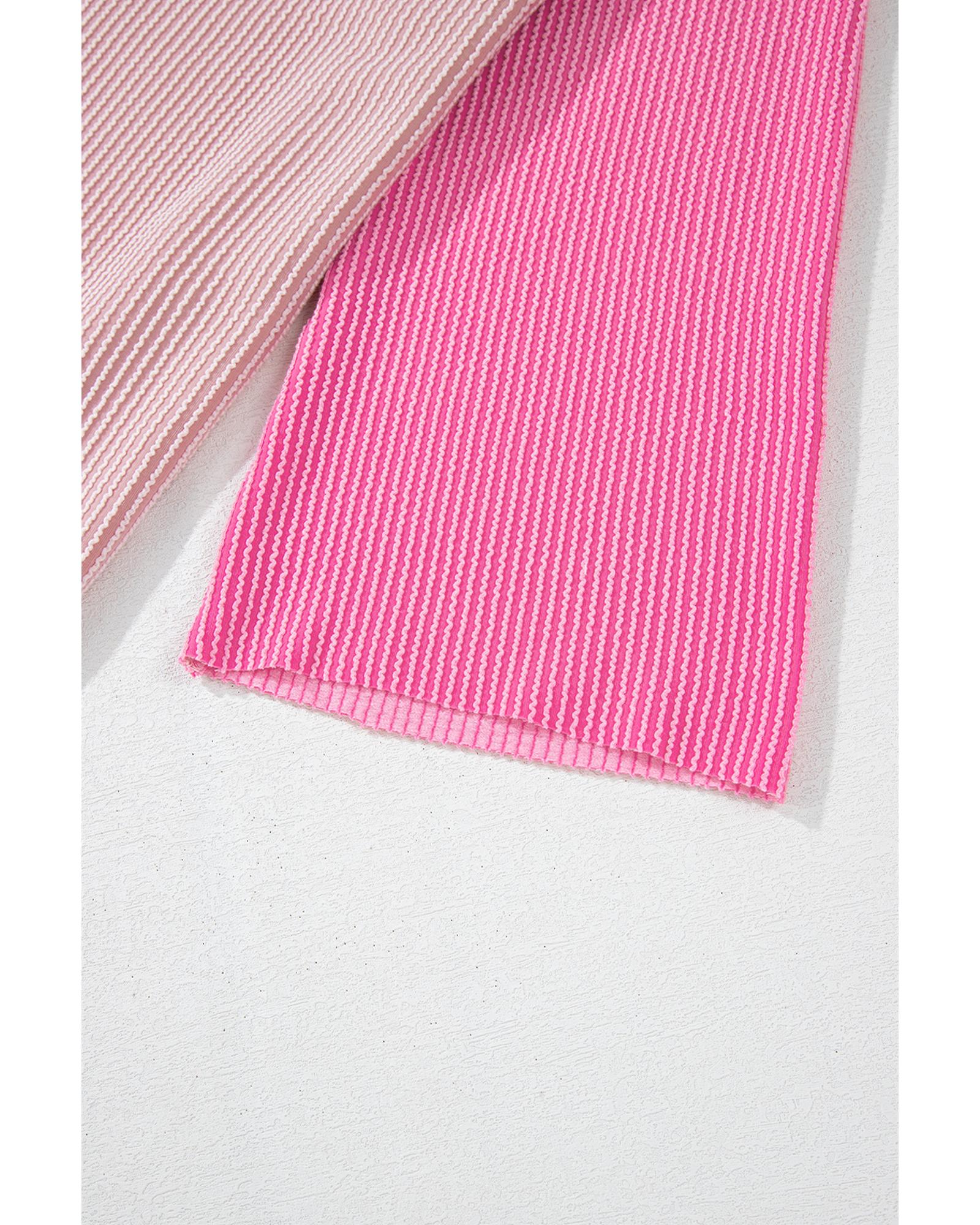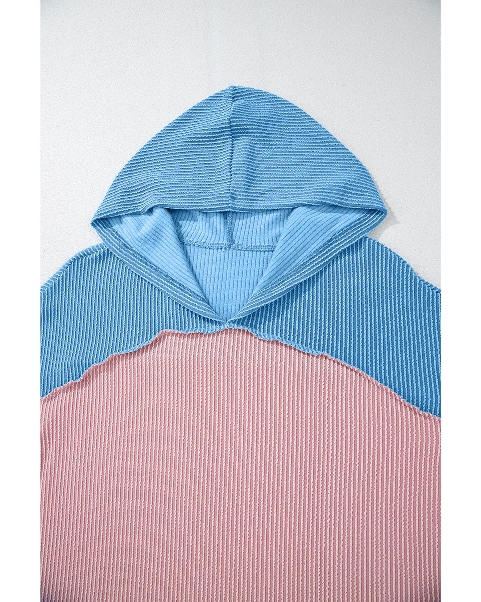 • Pink Color Block Patchwork Corded Knit Loose Fit Hooded Blouse