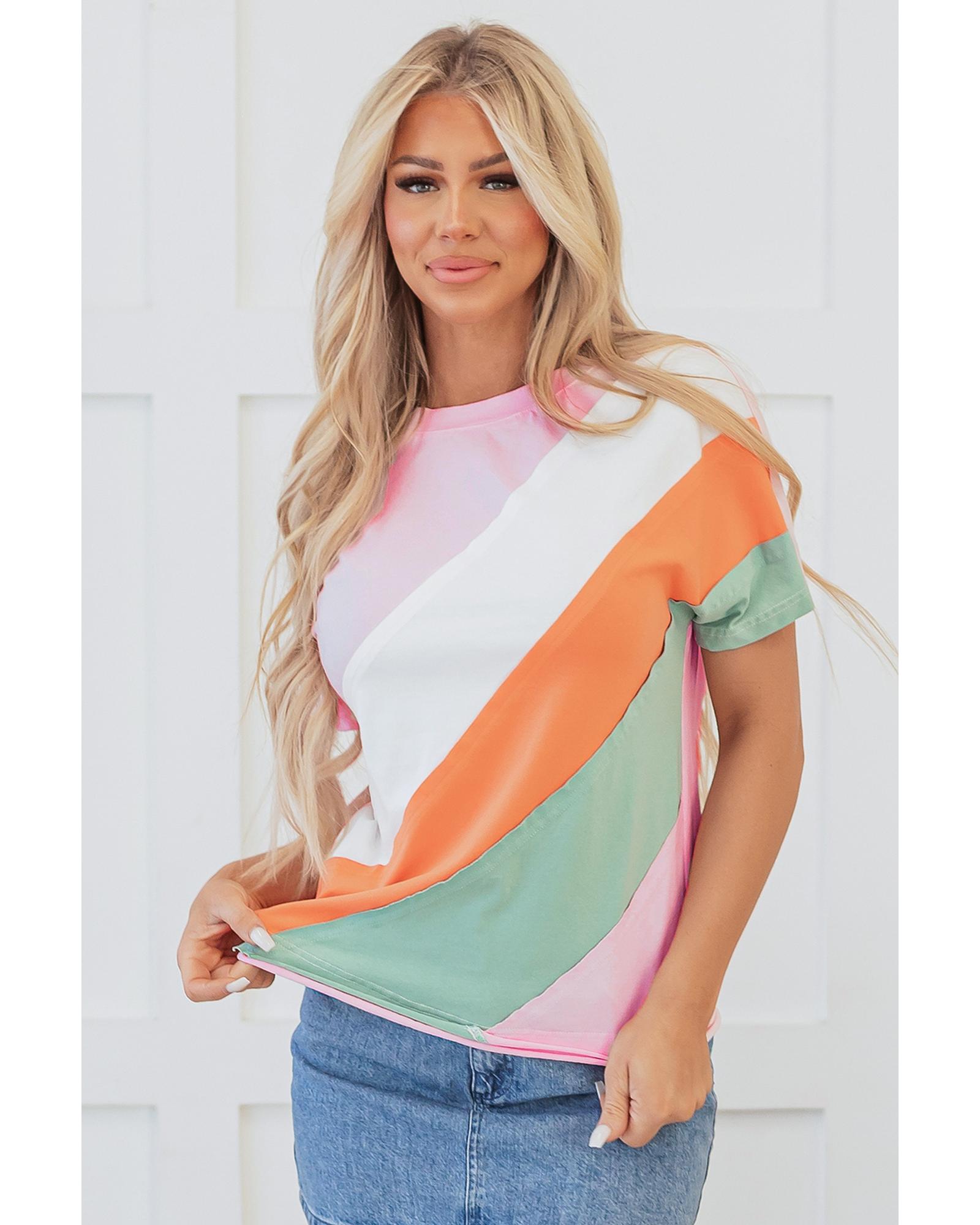 Pink Color Block Patchwork Seamed Crewneck T Shirt – M