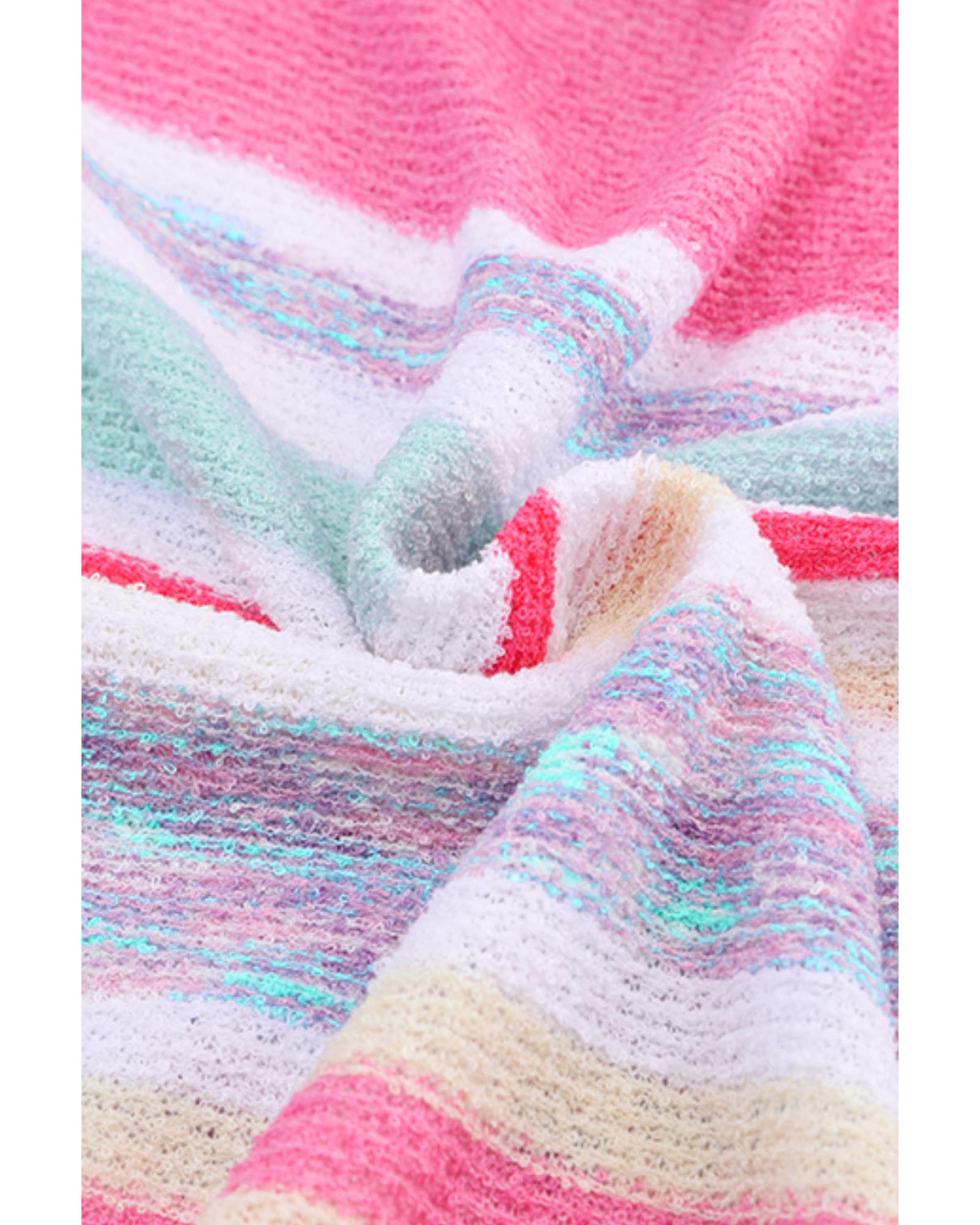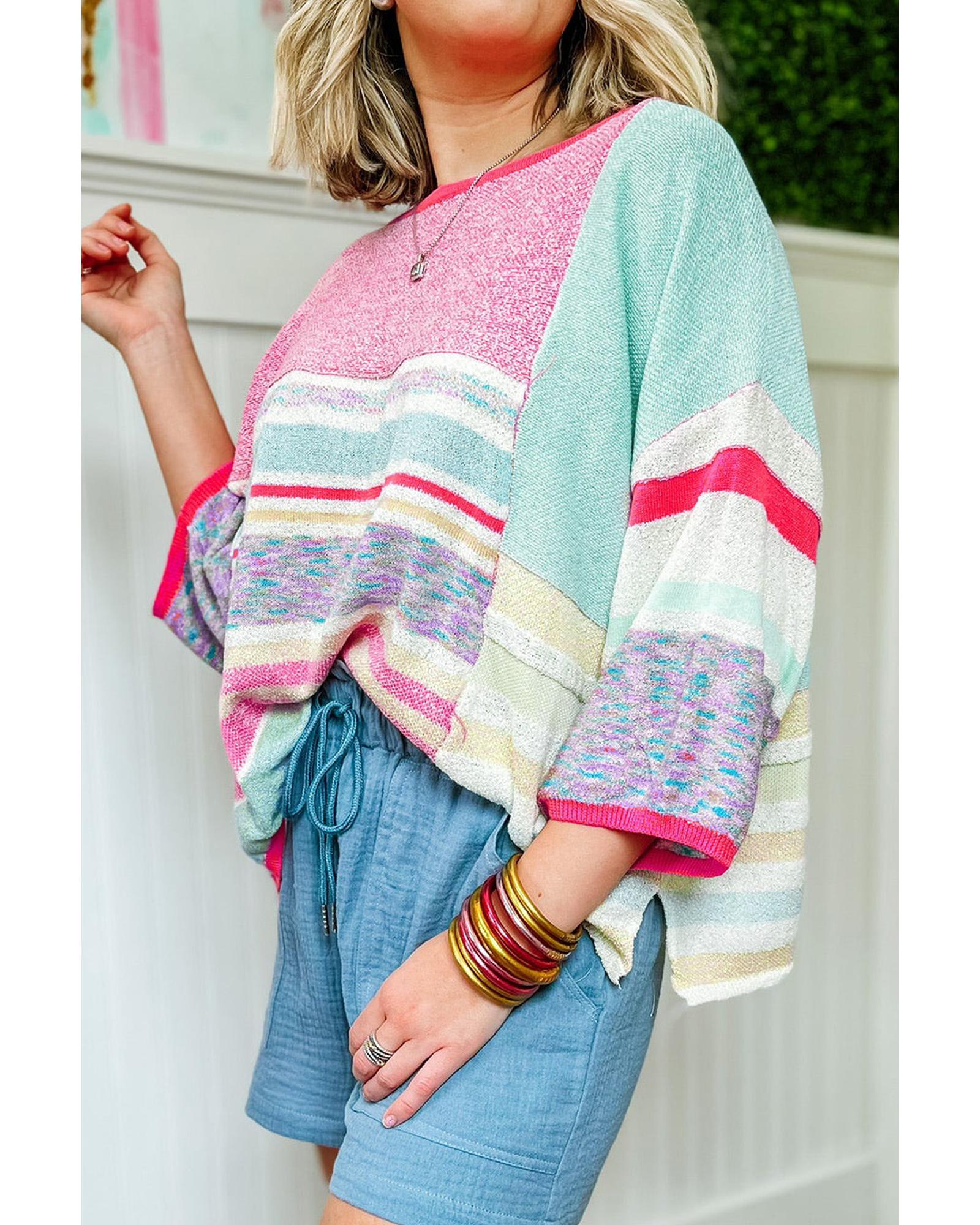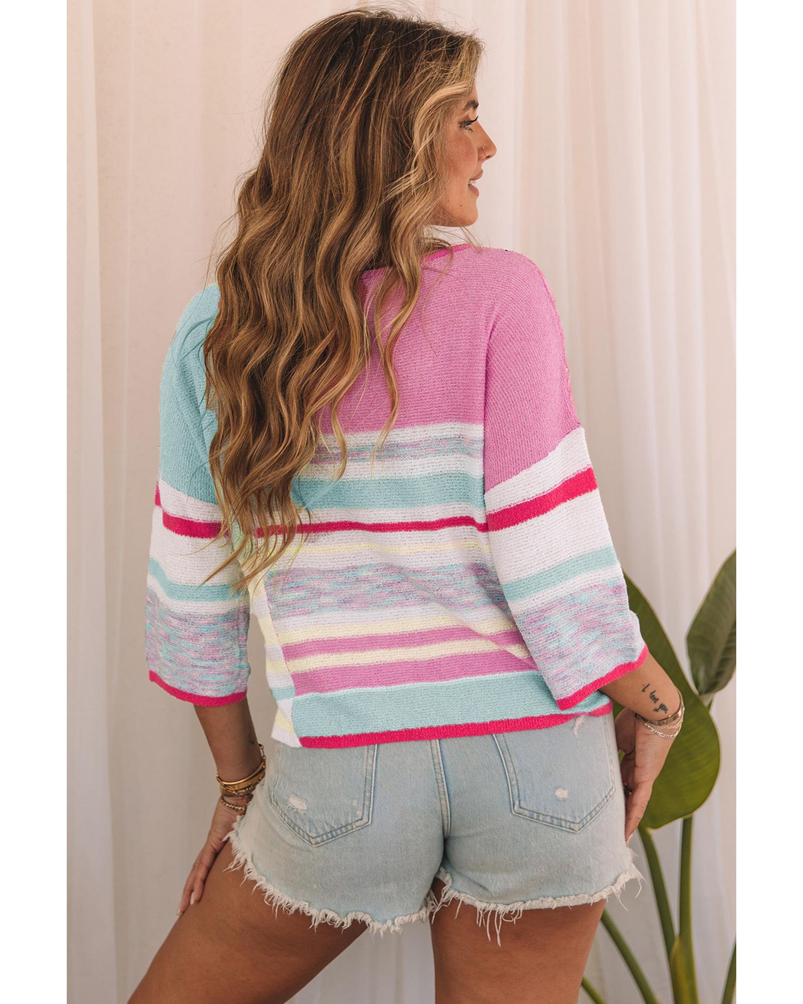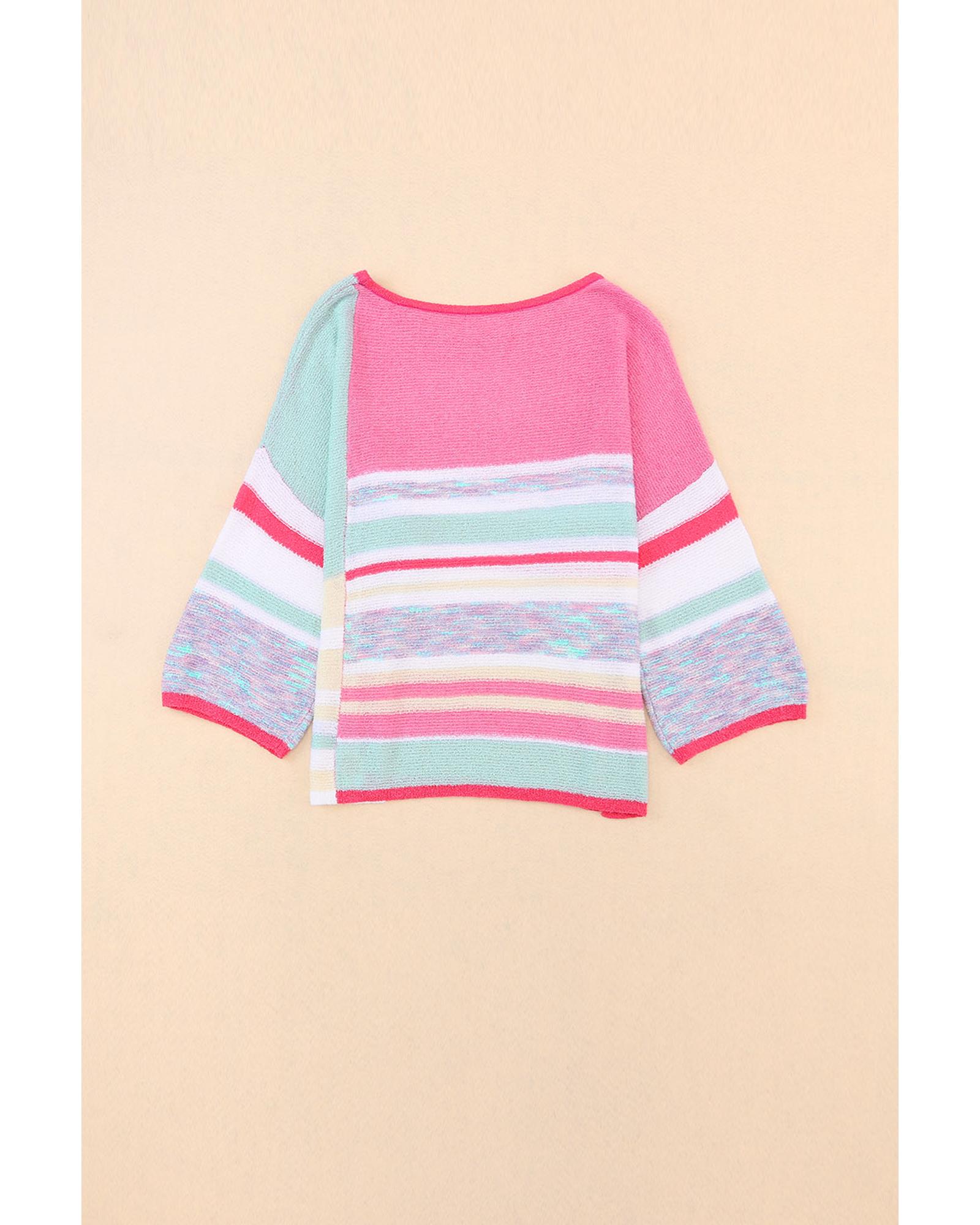 Pink Color Block Striped Three-Quarter Sleeve Knitted Top – L