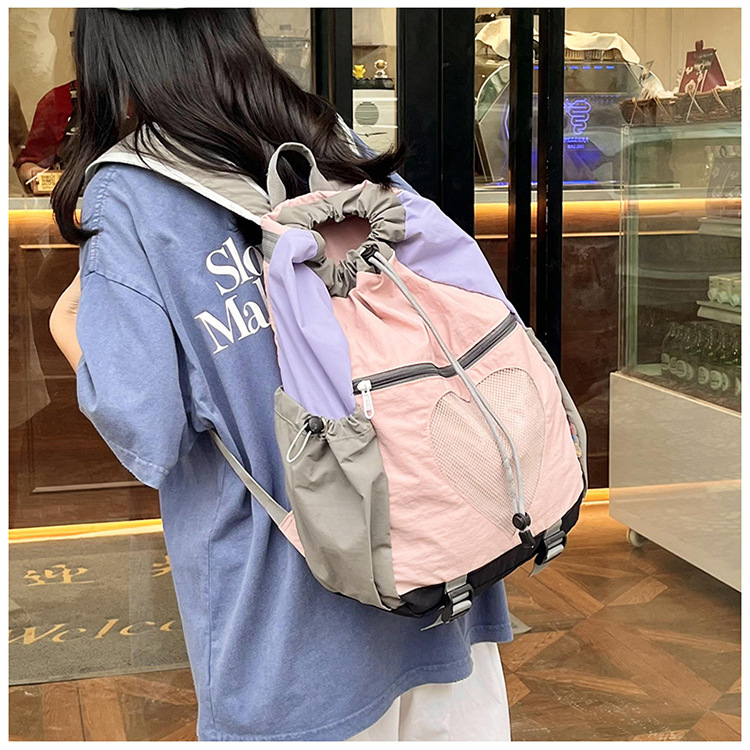 Pink Colorblock Drawstring Backpack – Lightweight Nylon Bag with Heart Mesh Pocket