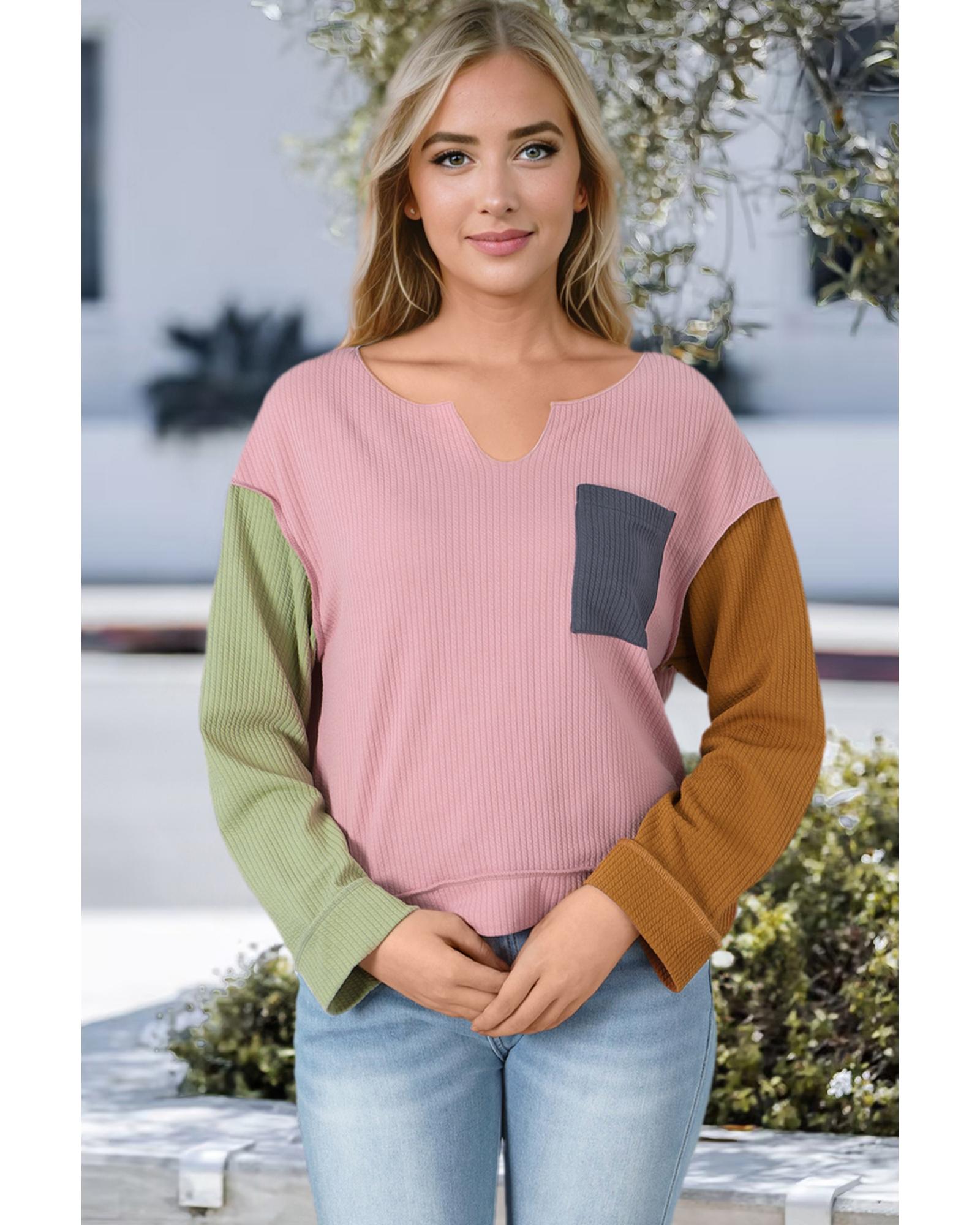 Pink Colorblock Rib Textured Loose Long Sleeve Top – L