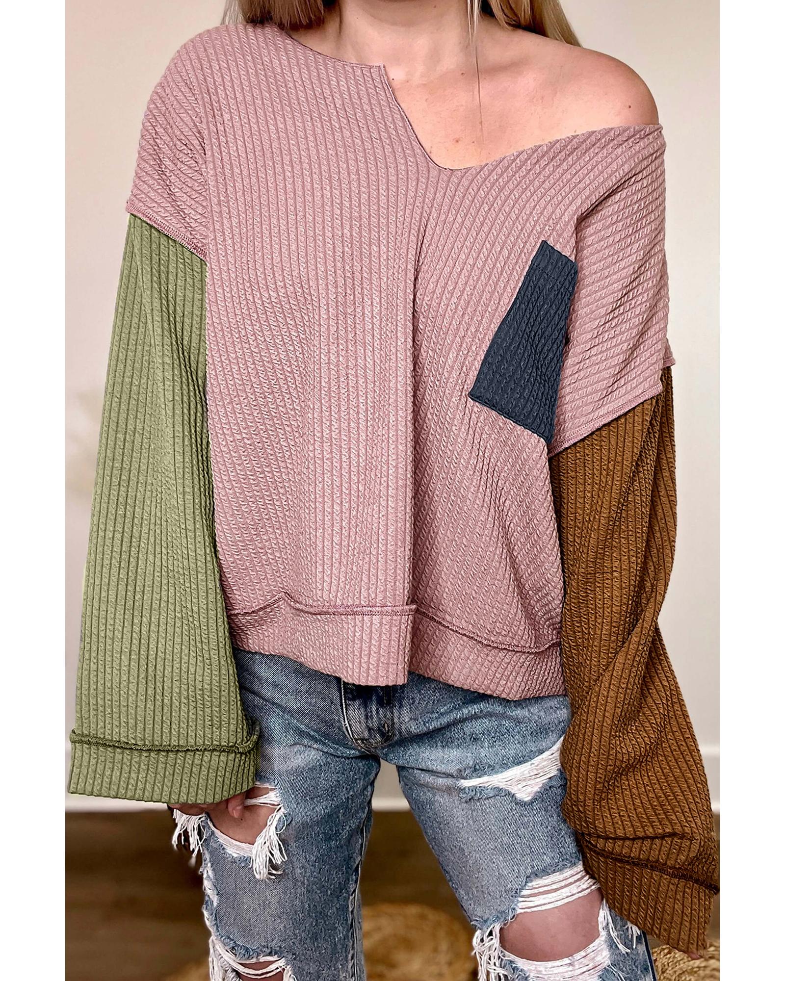 Pink Colorblock Rib Textured Loose Long Sleeve Top – M
