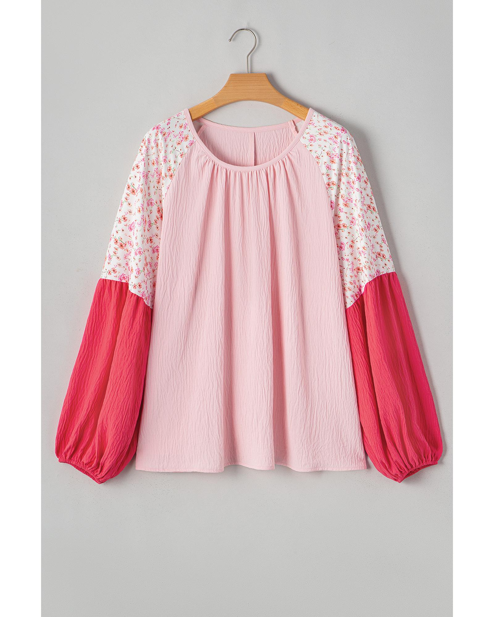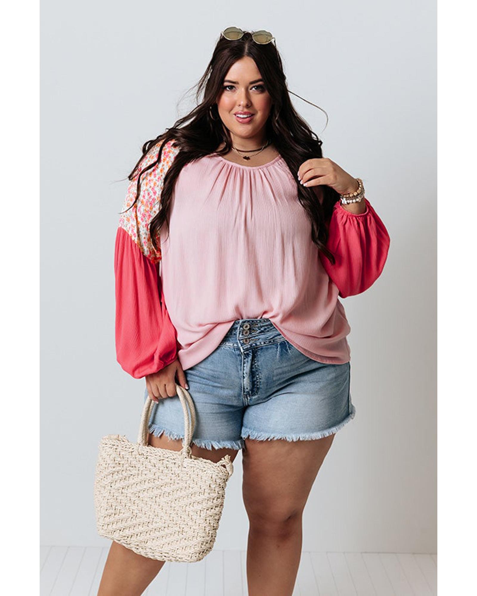 Pink Contrast Floral Patchwork Long Sleeve Plus Size Blouse – 2X