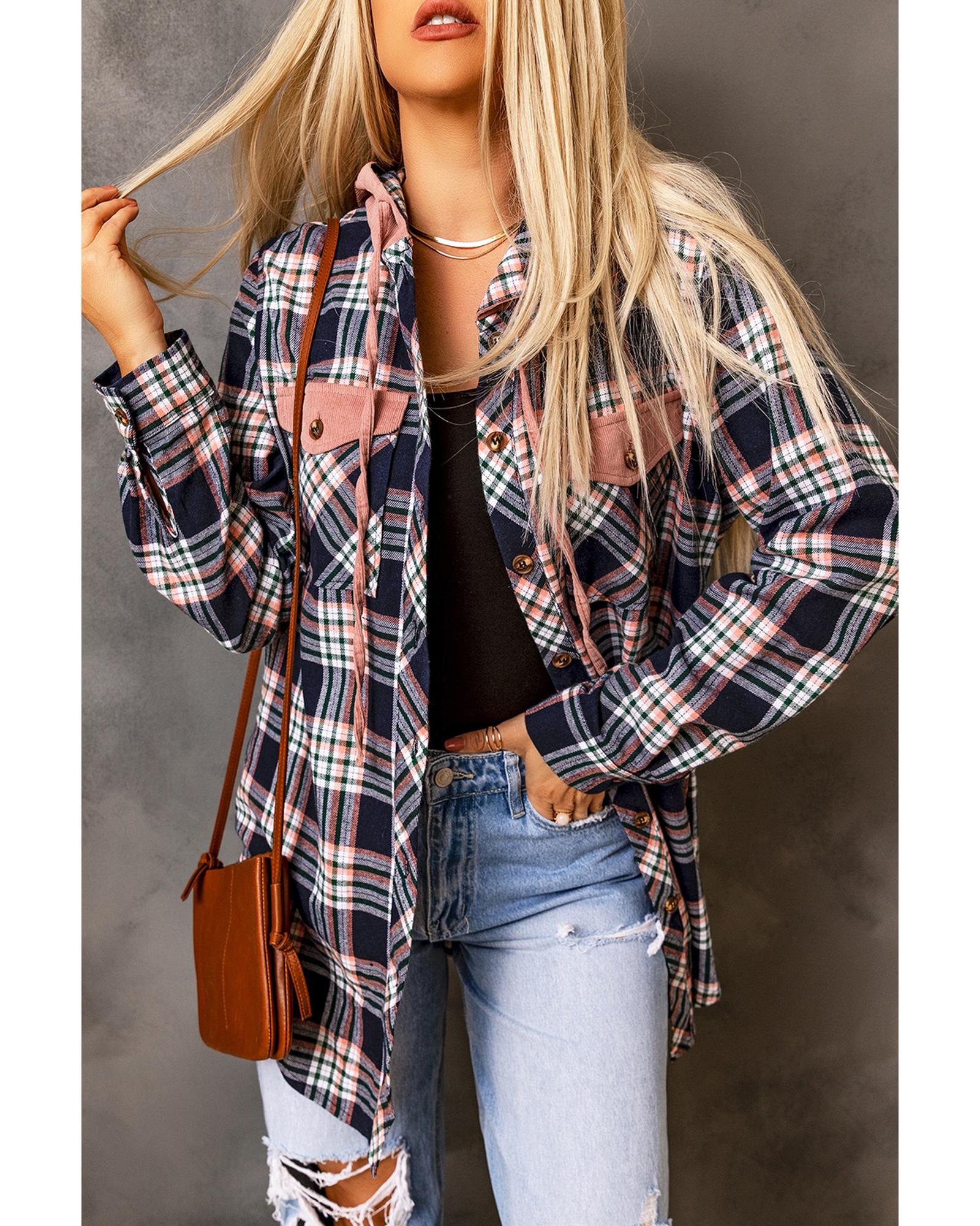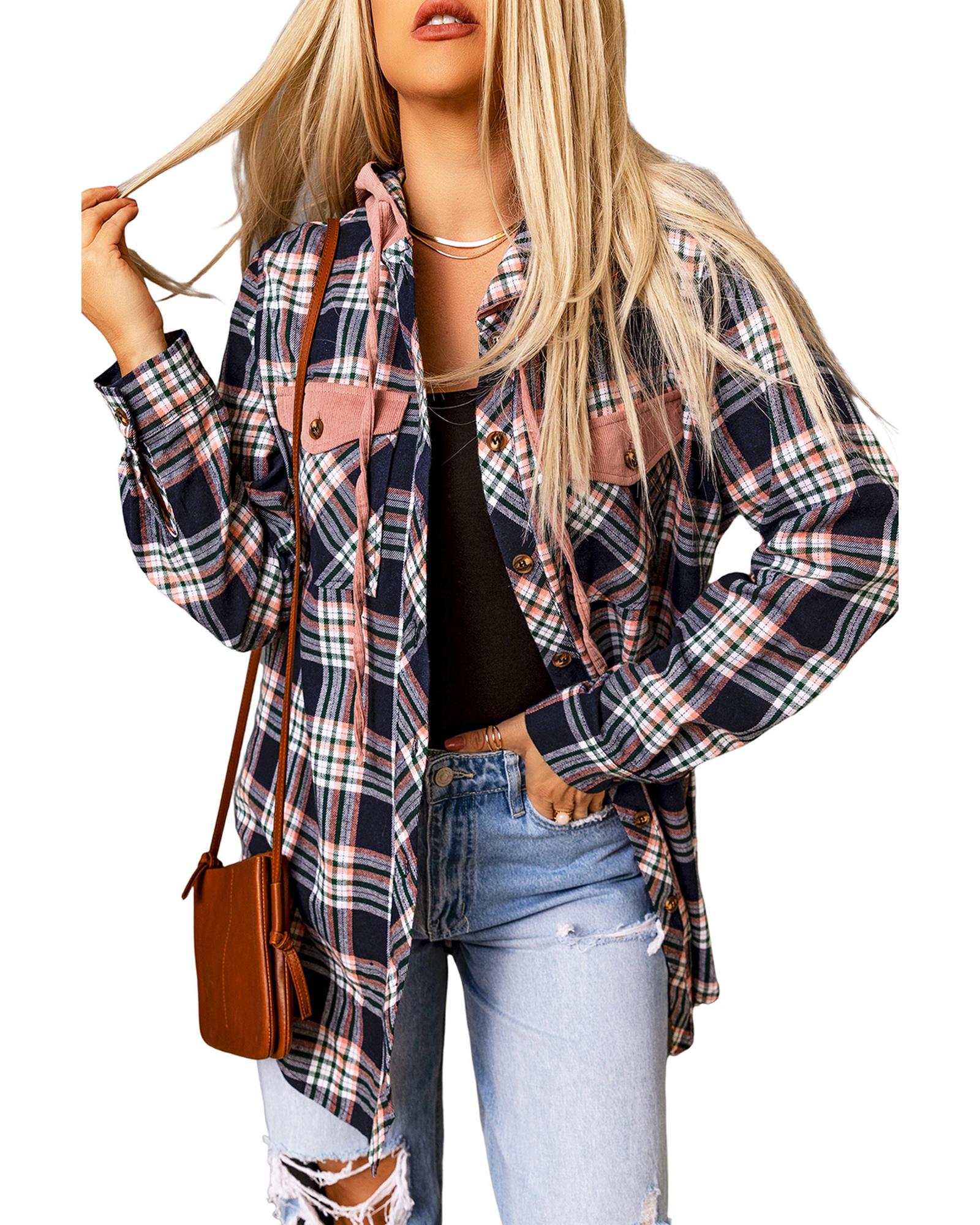 Pink Contrast Hooded Drawstring Plaid Shacket – L