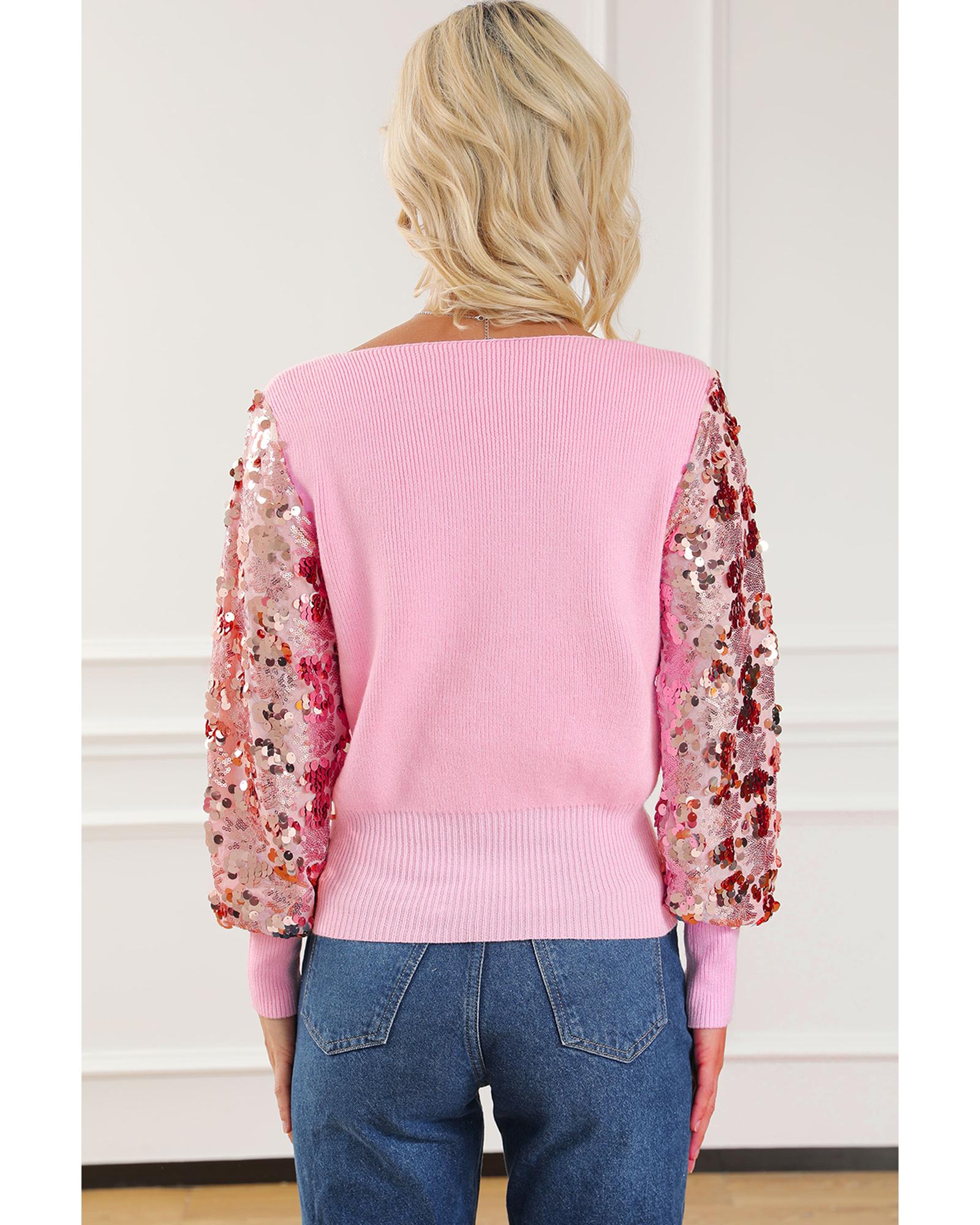 - Pink Contrast Sequin Sleeve V Neck Ribbed Knit Sweater