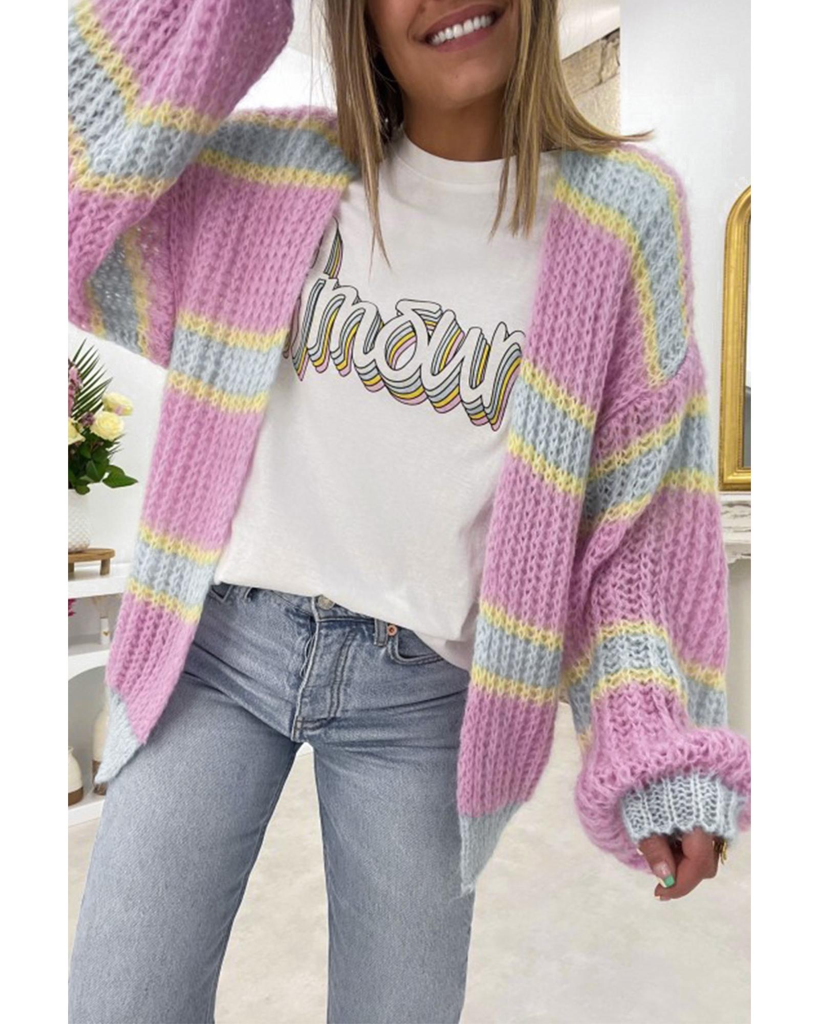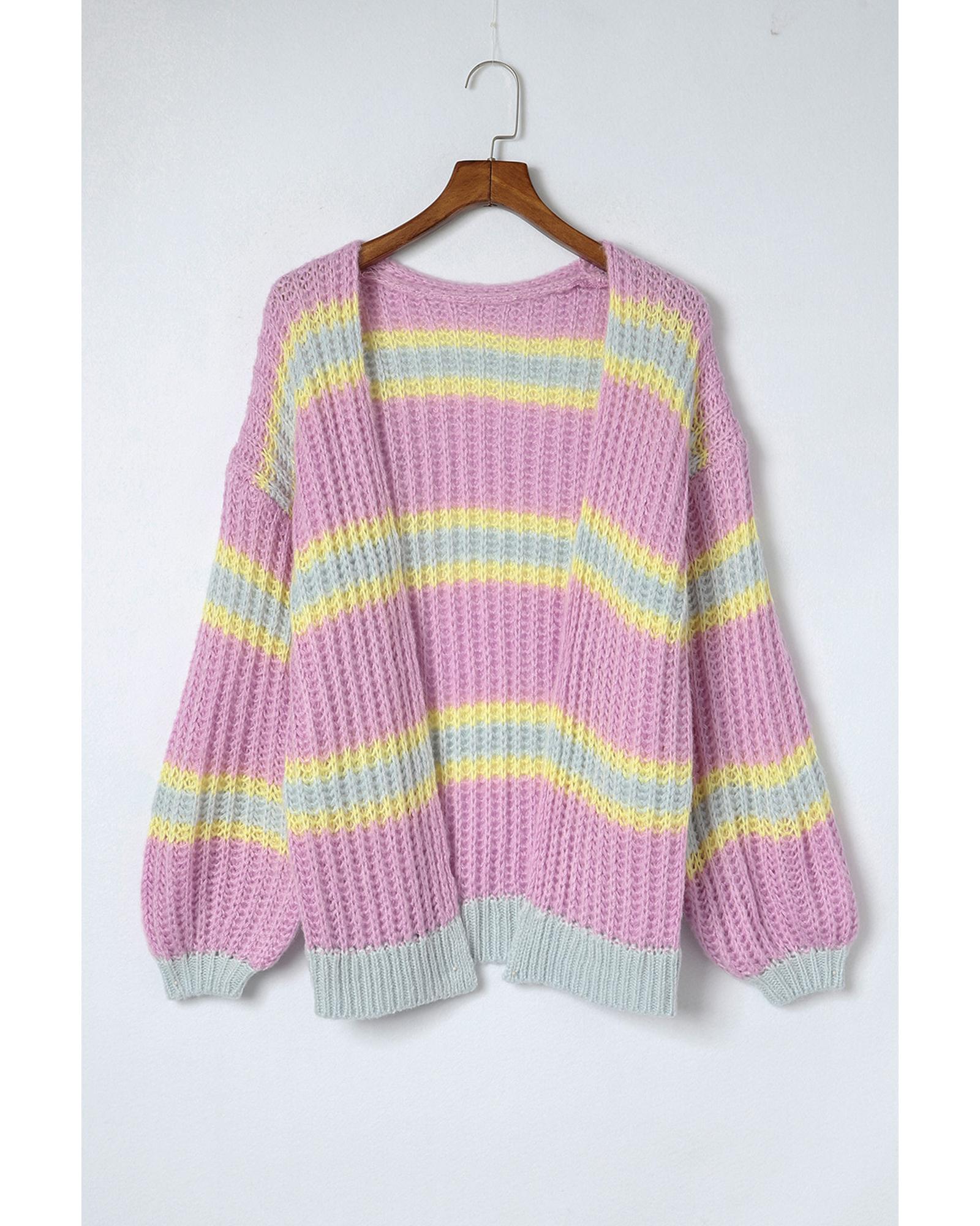 - Pink Contrast Striped Open Front Cable Cardigan