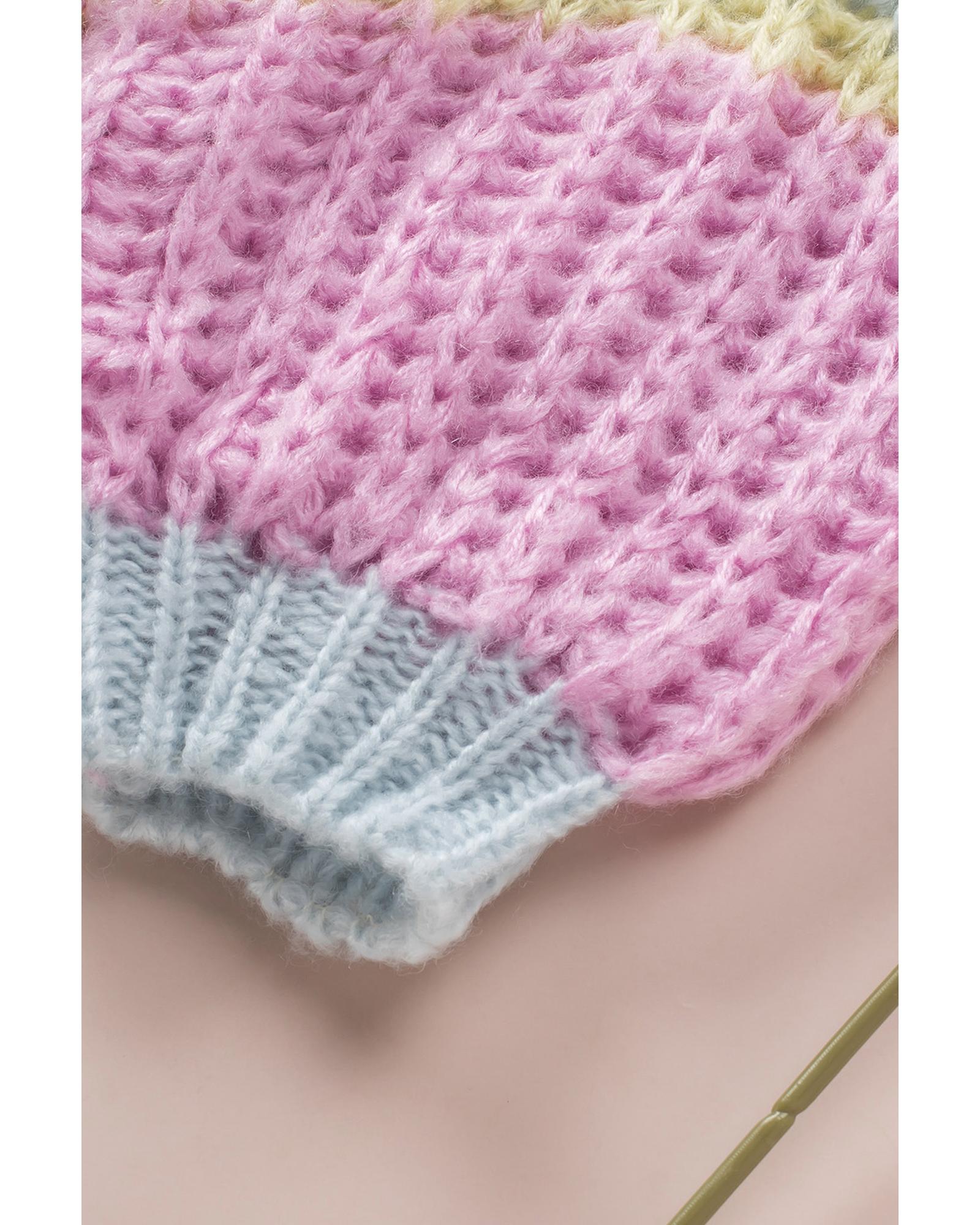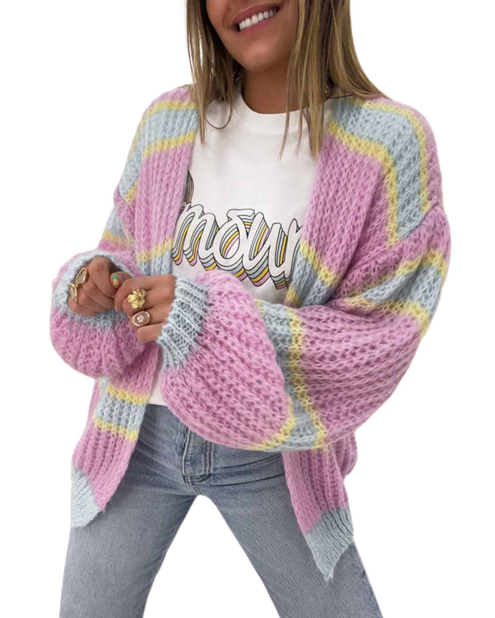 - Pink Contrast Striped Open Front Cable Cardigan
