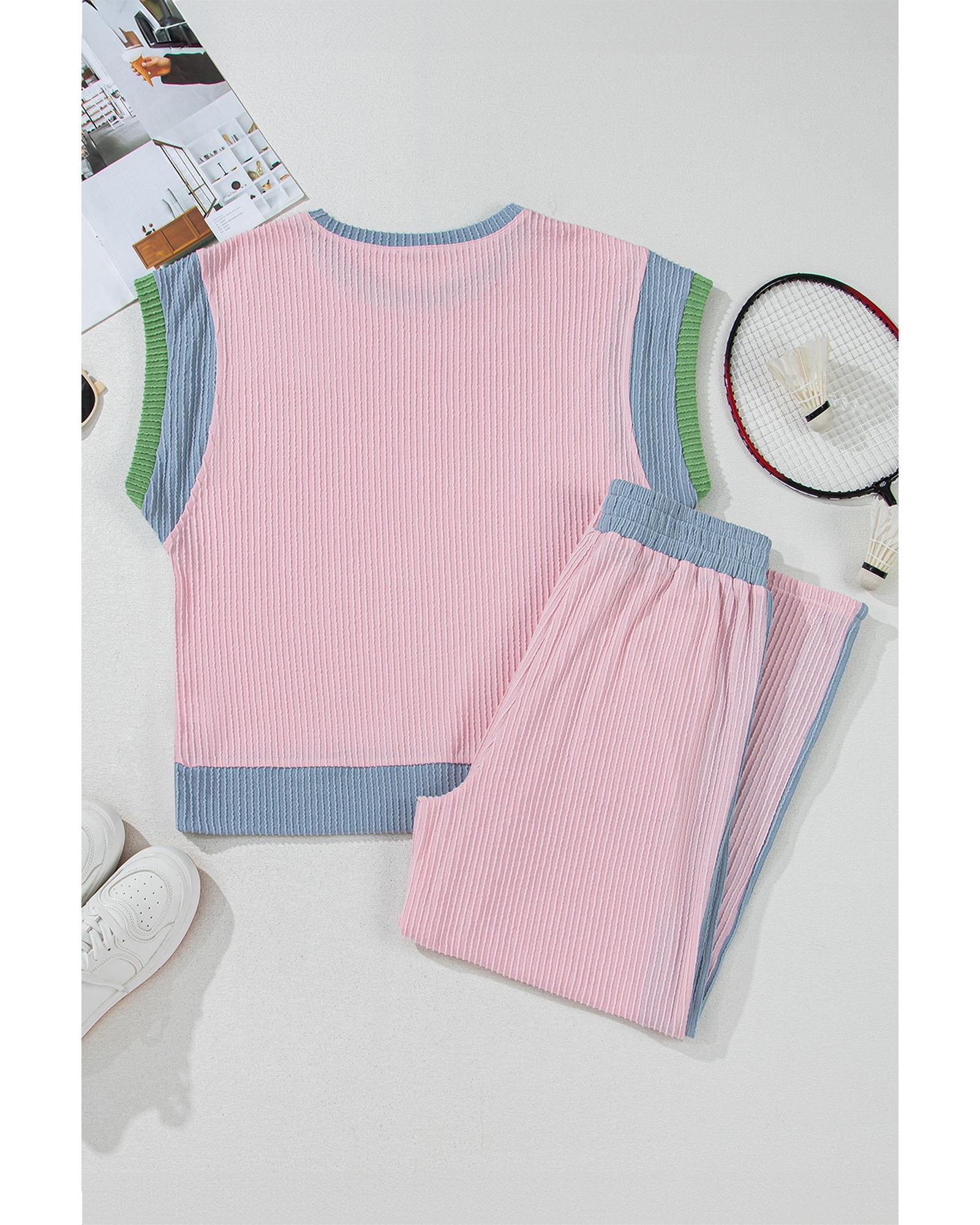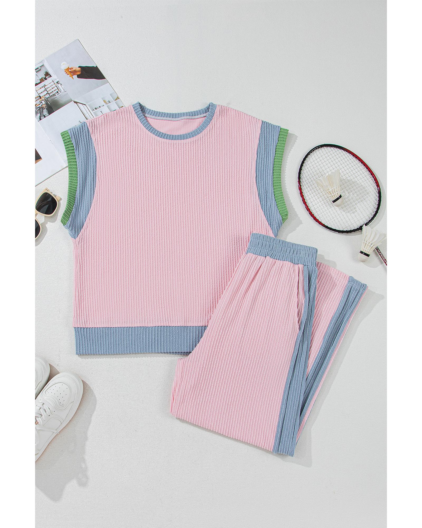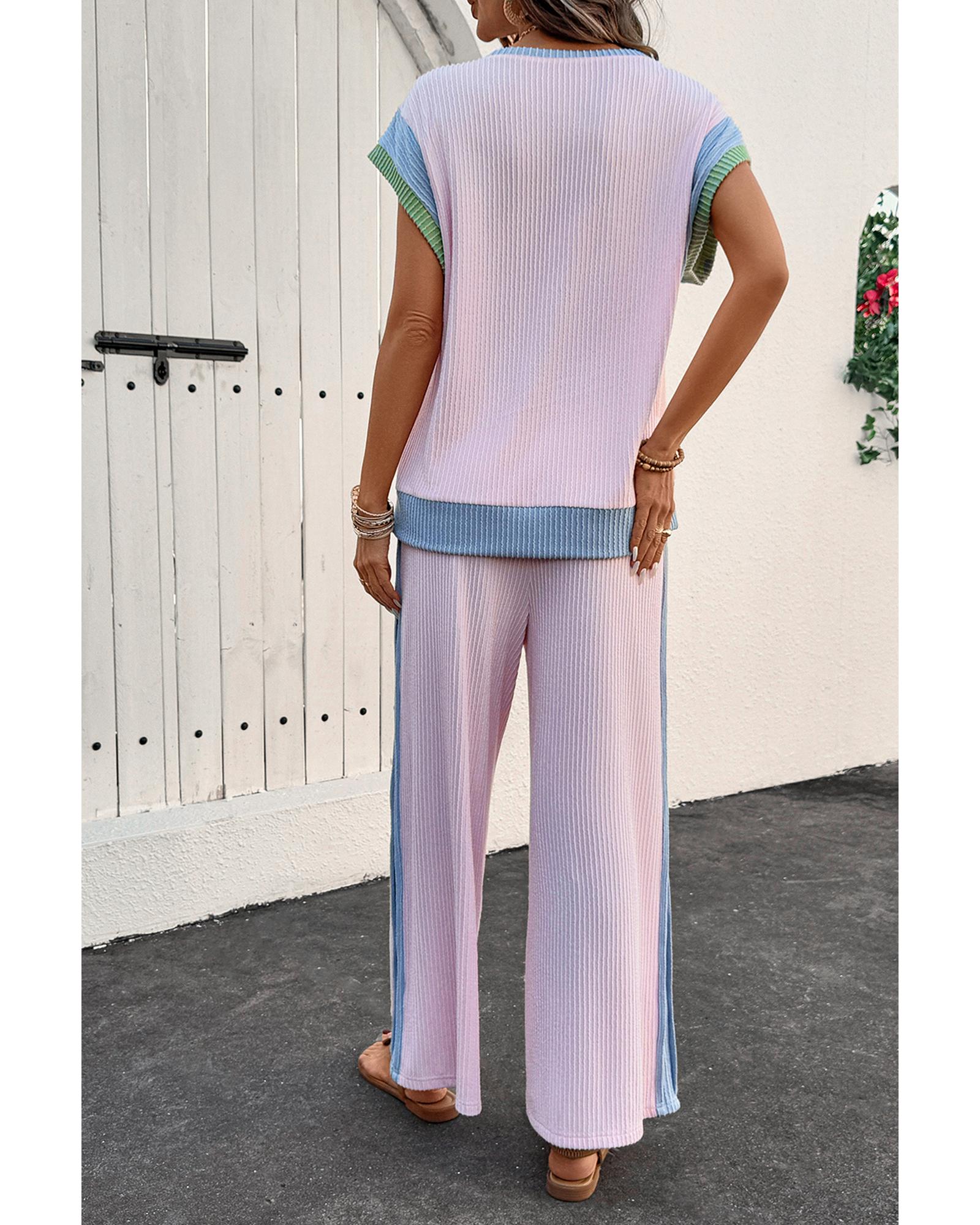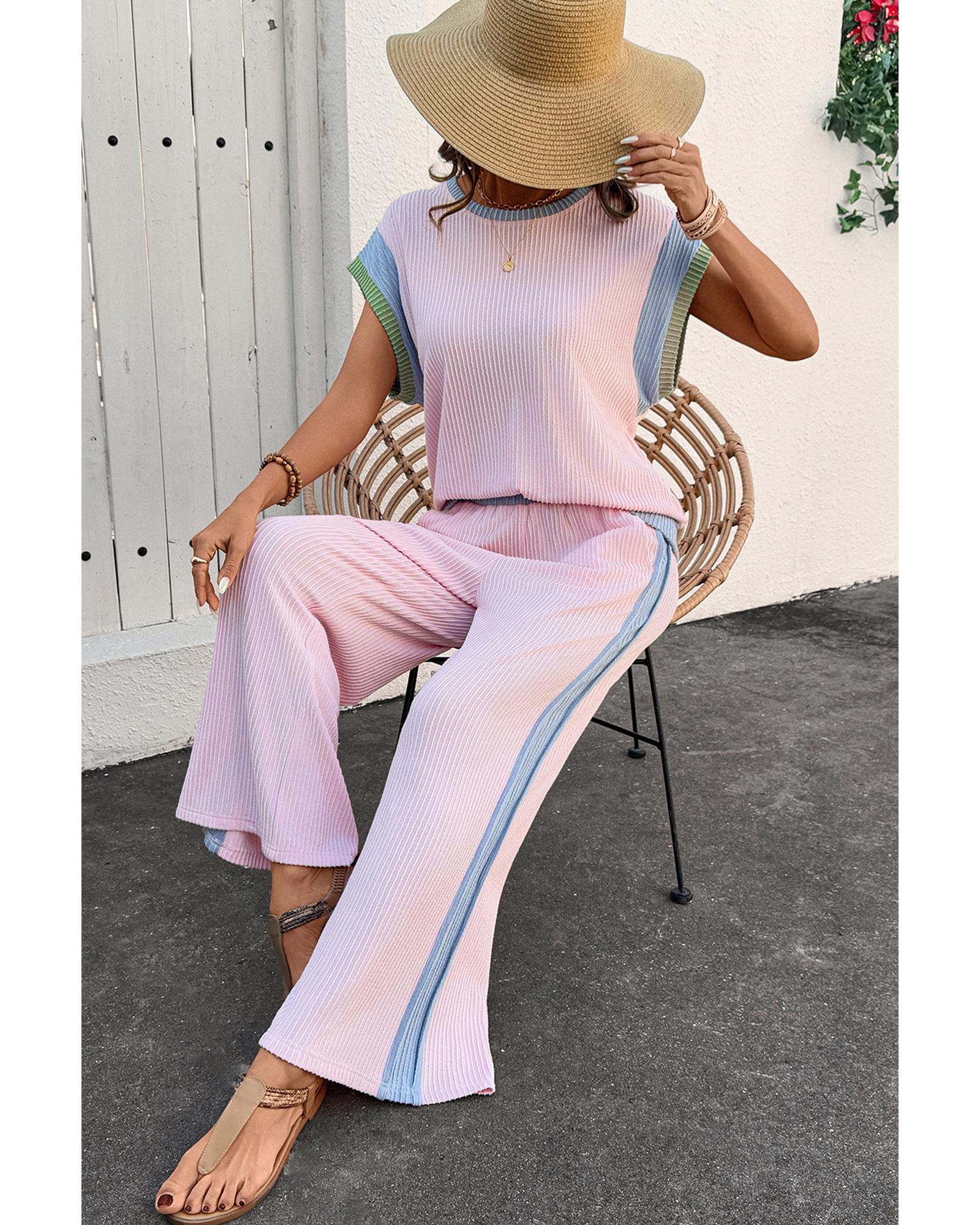 Pink Corded Colorblock Patchwork Short Sleeve Top and Loose Pants Set – L