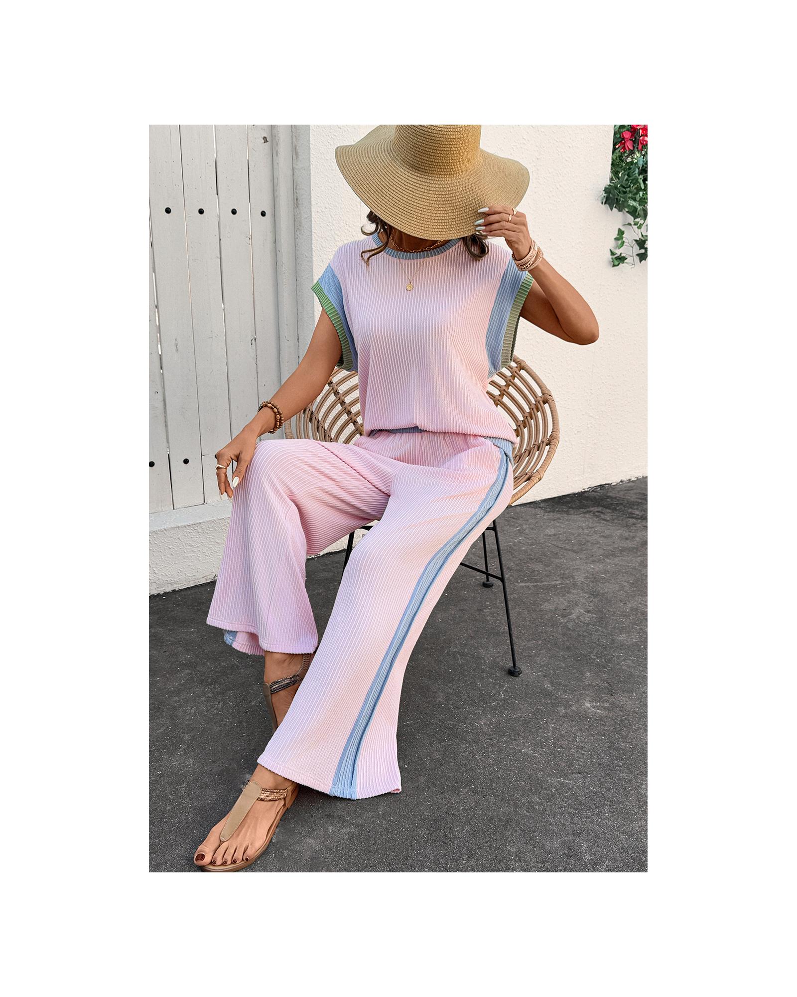 Pink Corded Colorblock Patchwork Short Sleeve Top and Loose Pants Set – M