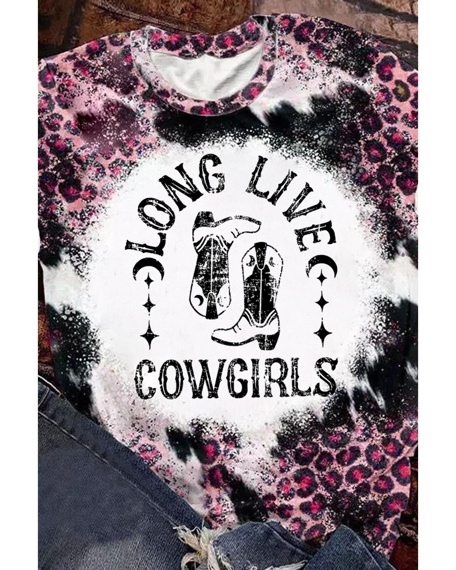 Pink Cowgirls Boots Leopard Bleached Crew Neck T Shirt – M