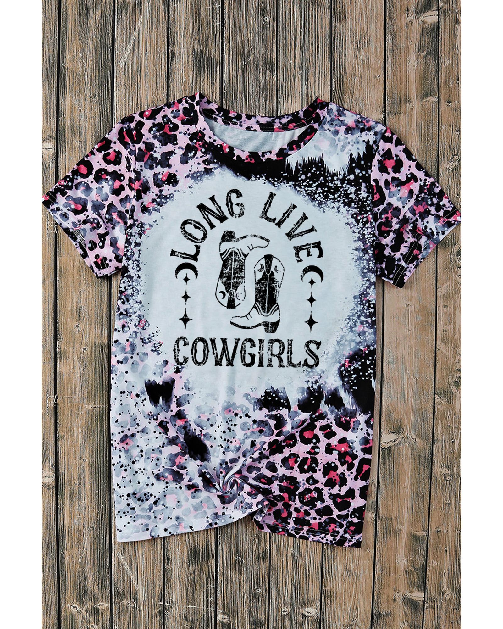 Pink Cowgirls Boots Leopard Bleached Crew Neck T Shirt – XL