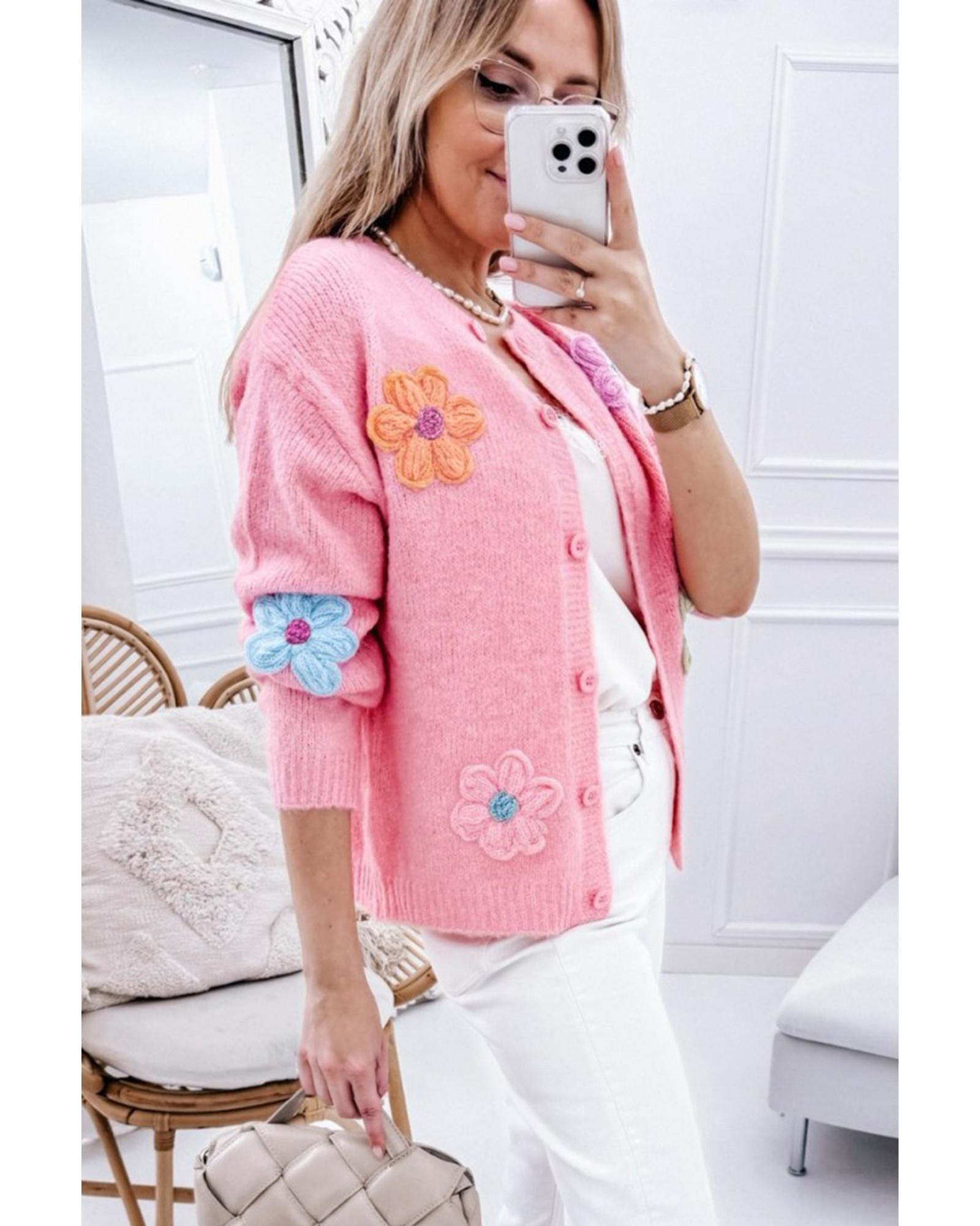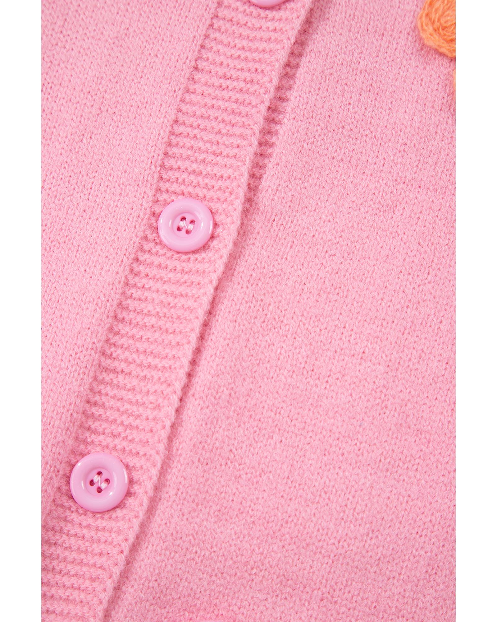 Pink Cute Knitted Floral Pattern Button Up Cardigan – S