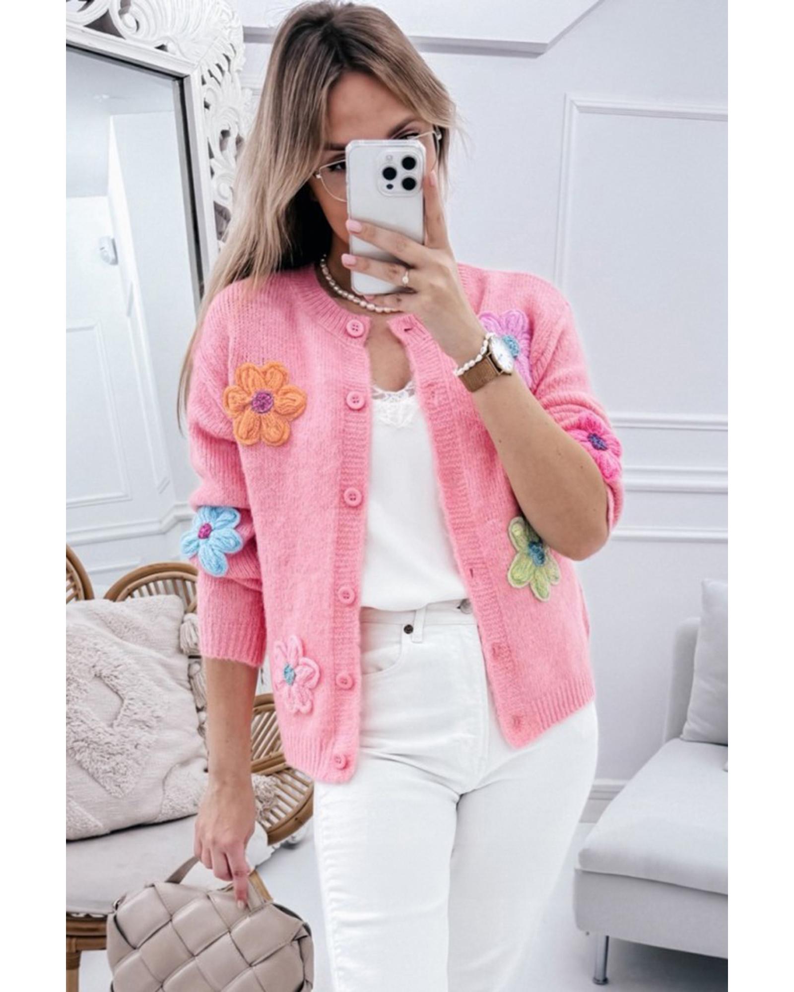 Pink Cute Knitted Floral Pattern Button Up Cardigan – XL