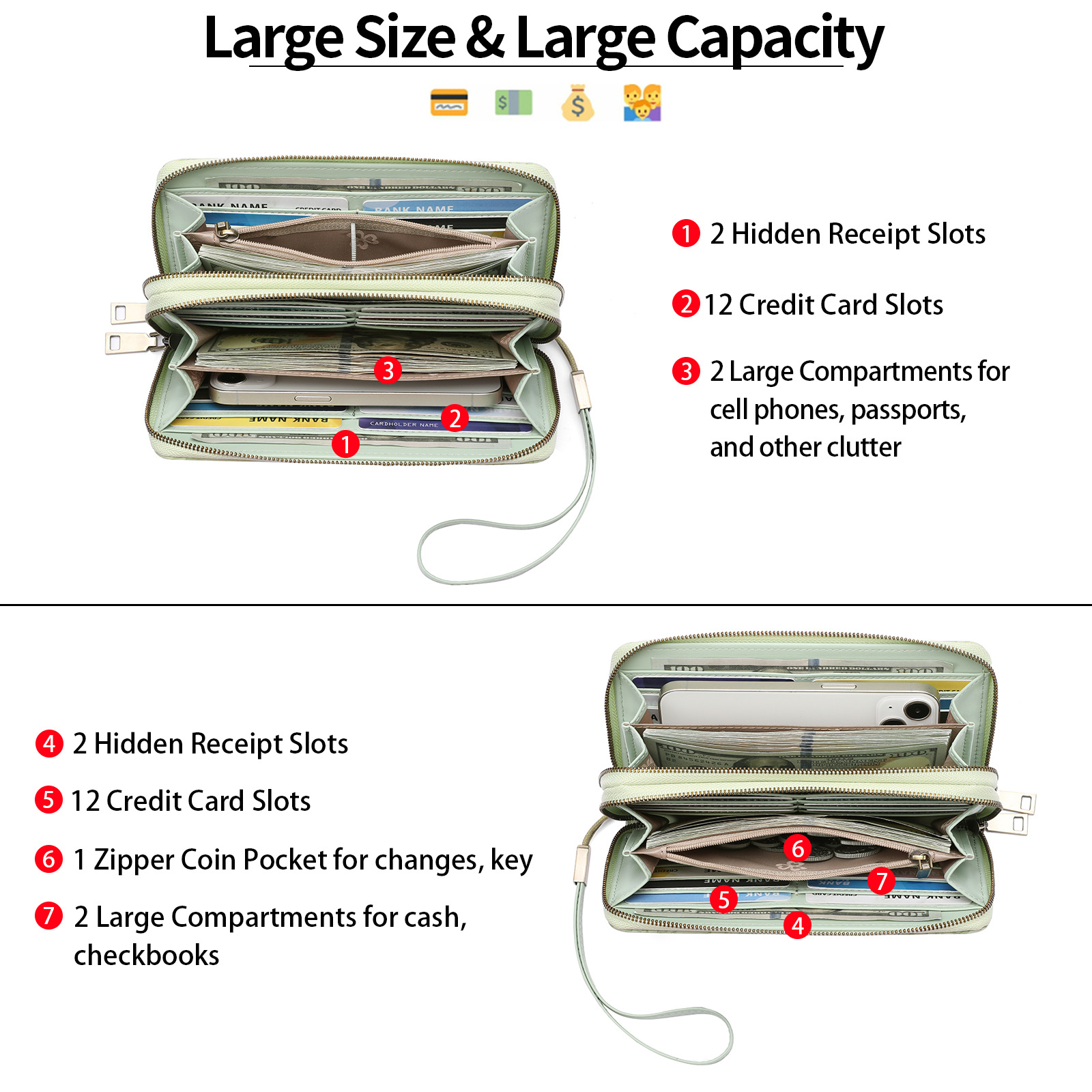 - Large Capacity Design: Includes 24 card slots, 4 full-length cash compartments, 4 receipt slots, and 1 zipper coin pocket.