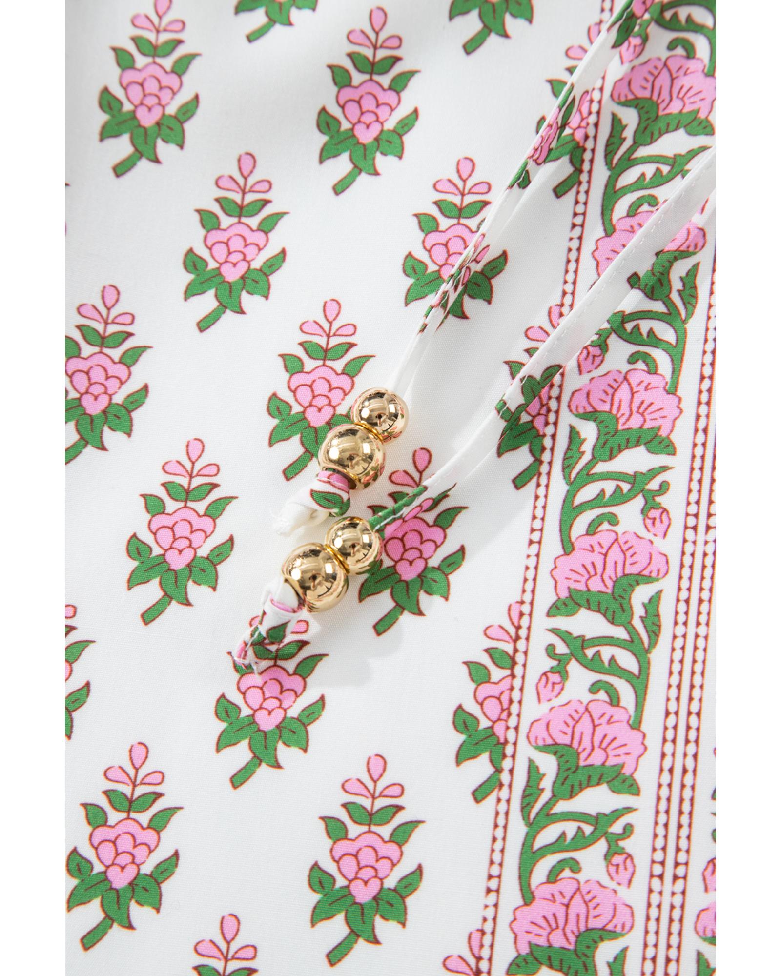 Pink Floral Print Bubble Sleeve Neck Tie Ruffled Dress – L
