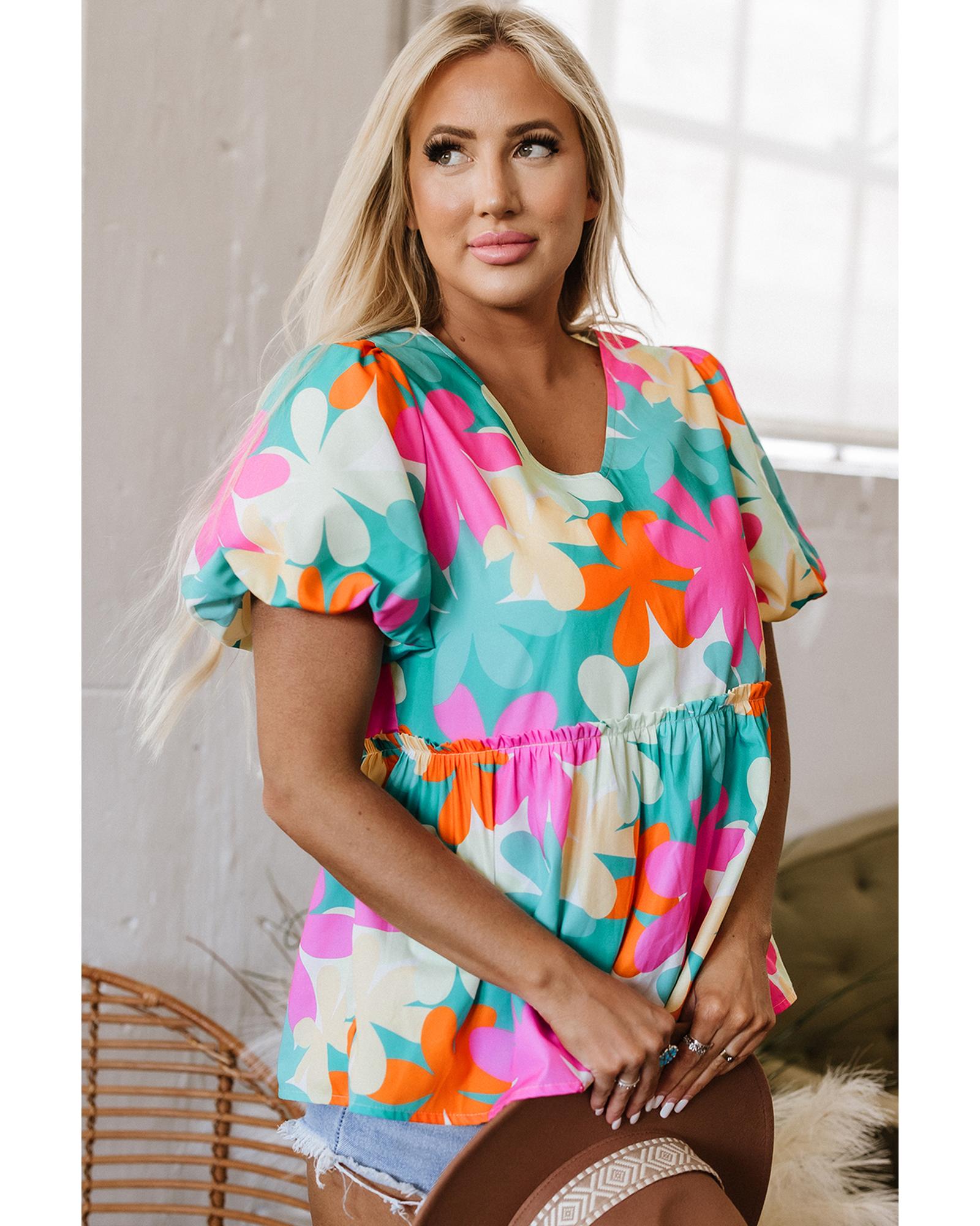 • Pink Floral Print Bubble Sleeve V Neck Peplum Blouse