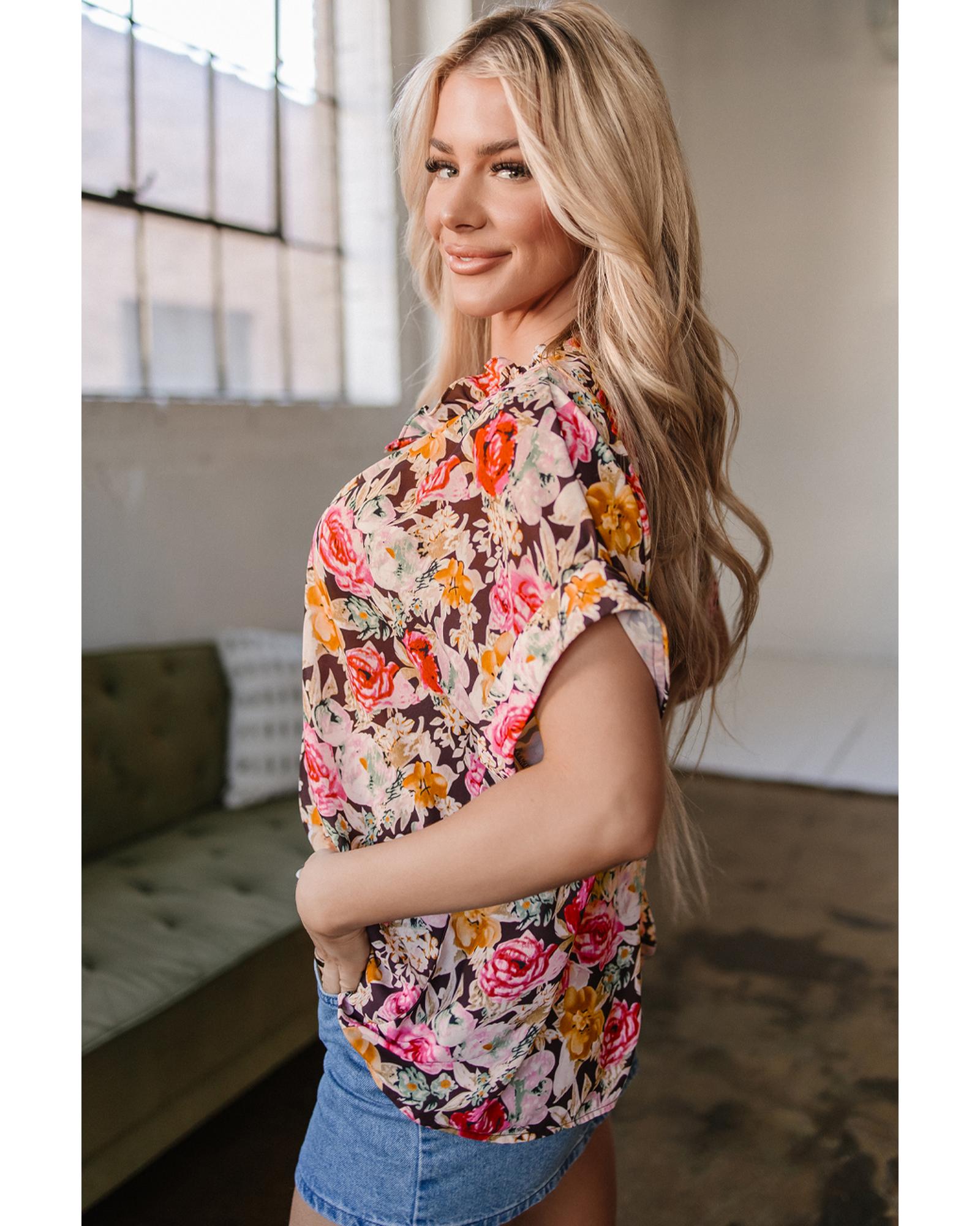 Pink Floral Print Crew Neck Short Sleeve Shift Blouse – L
