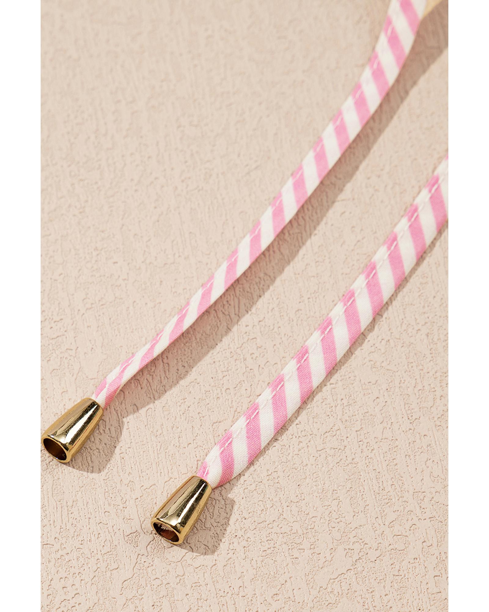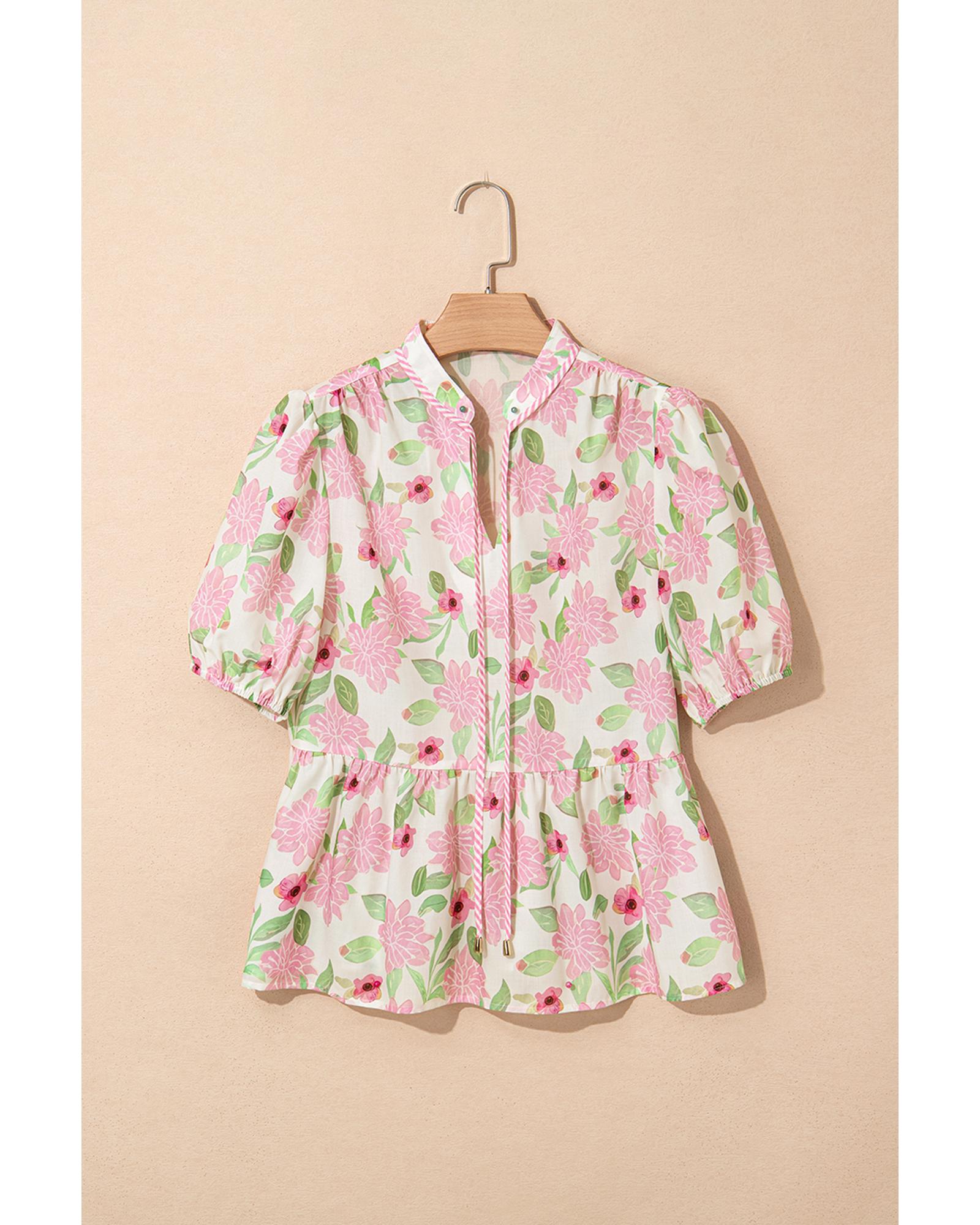 Pink Floral Print Drawstring V Neck Peplum Blouse – L