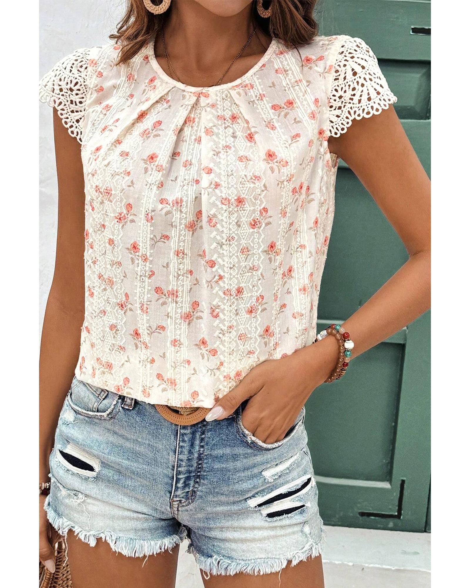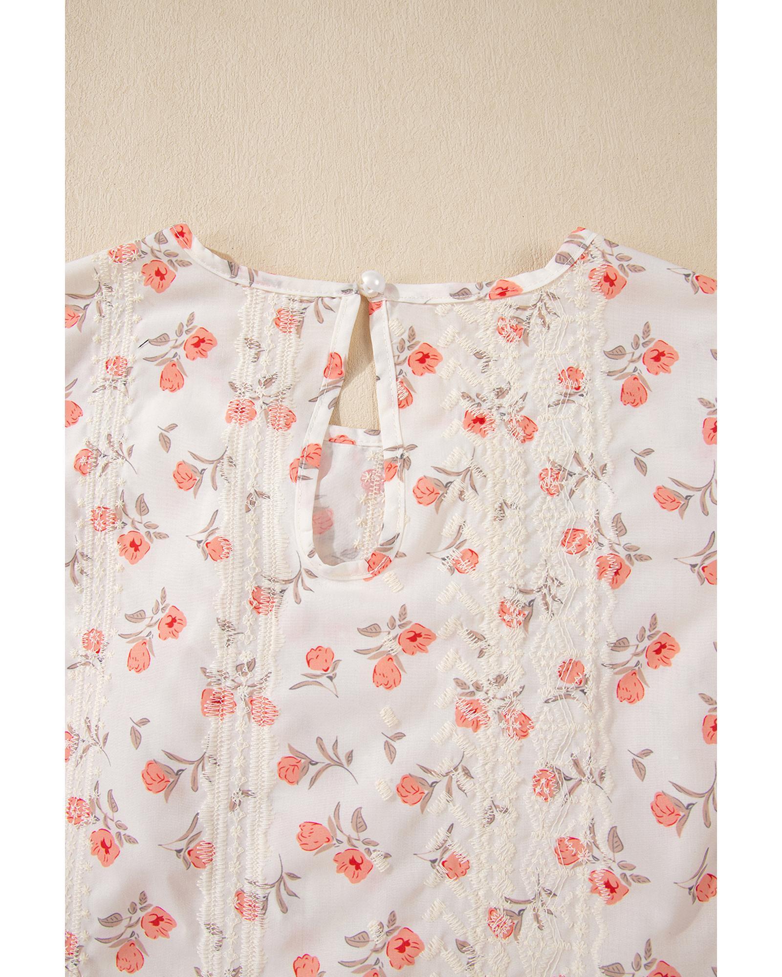 Pink Floral Print Embroidery Detail Crochet Cap Sleeve Blouse – M