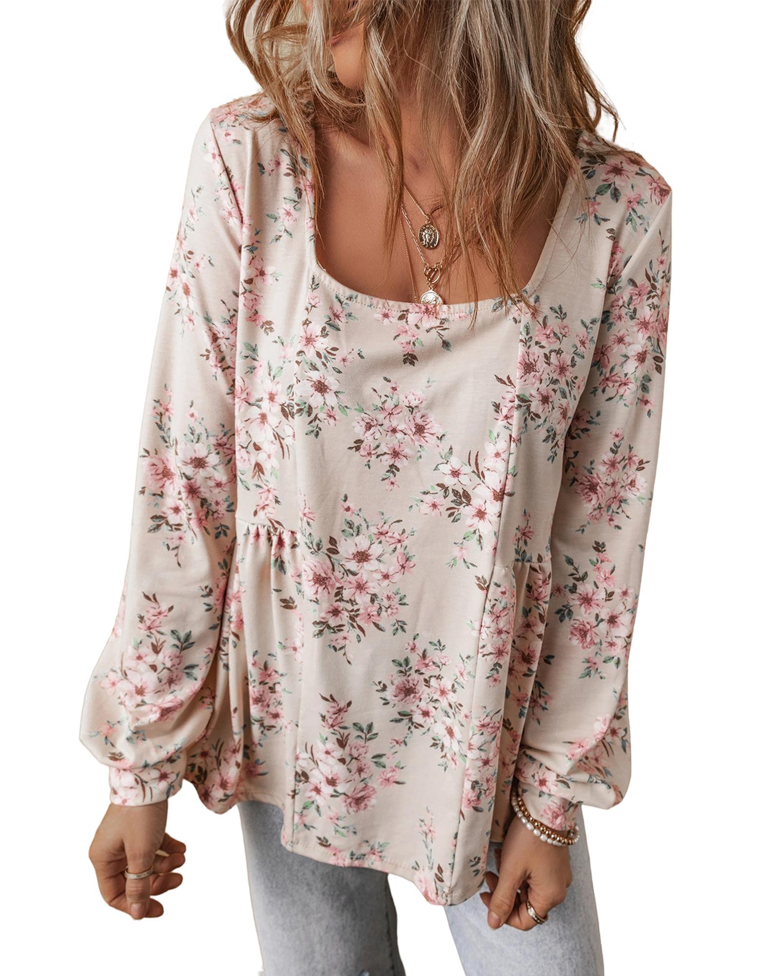Pink Floral Print Pleated U Neck Loose Fit Blouse – M