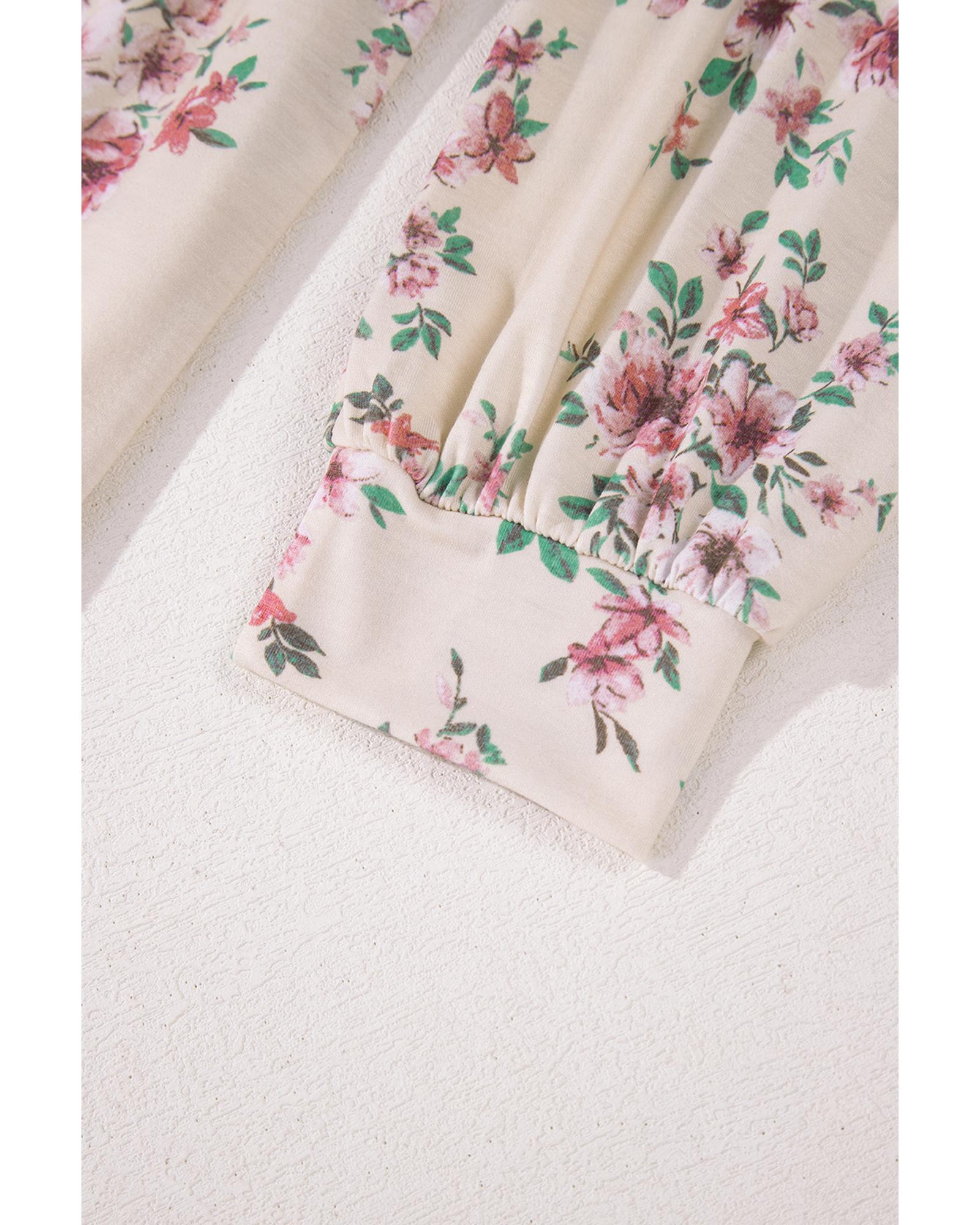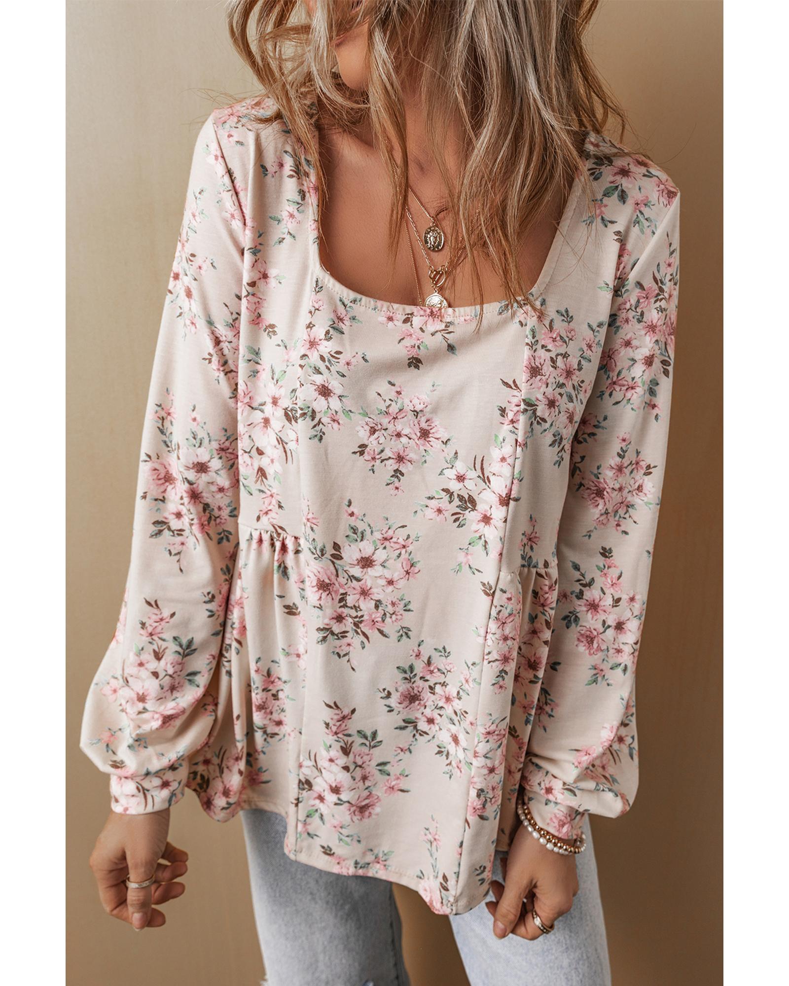 Pink Floral Print Pleated U Neck Loose Fit Blouse – XL