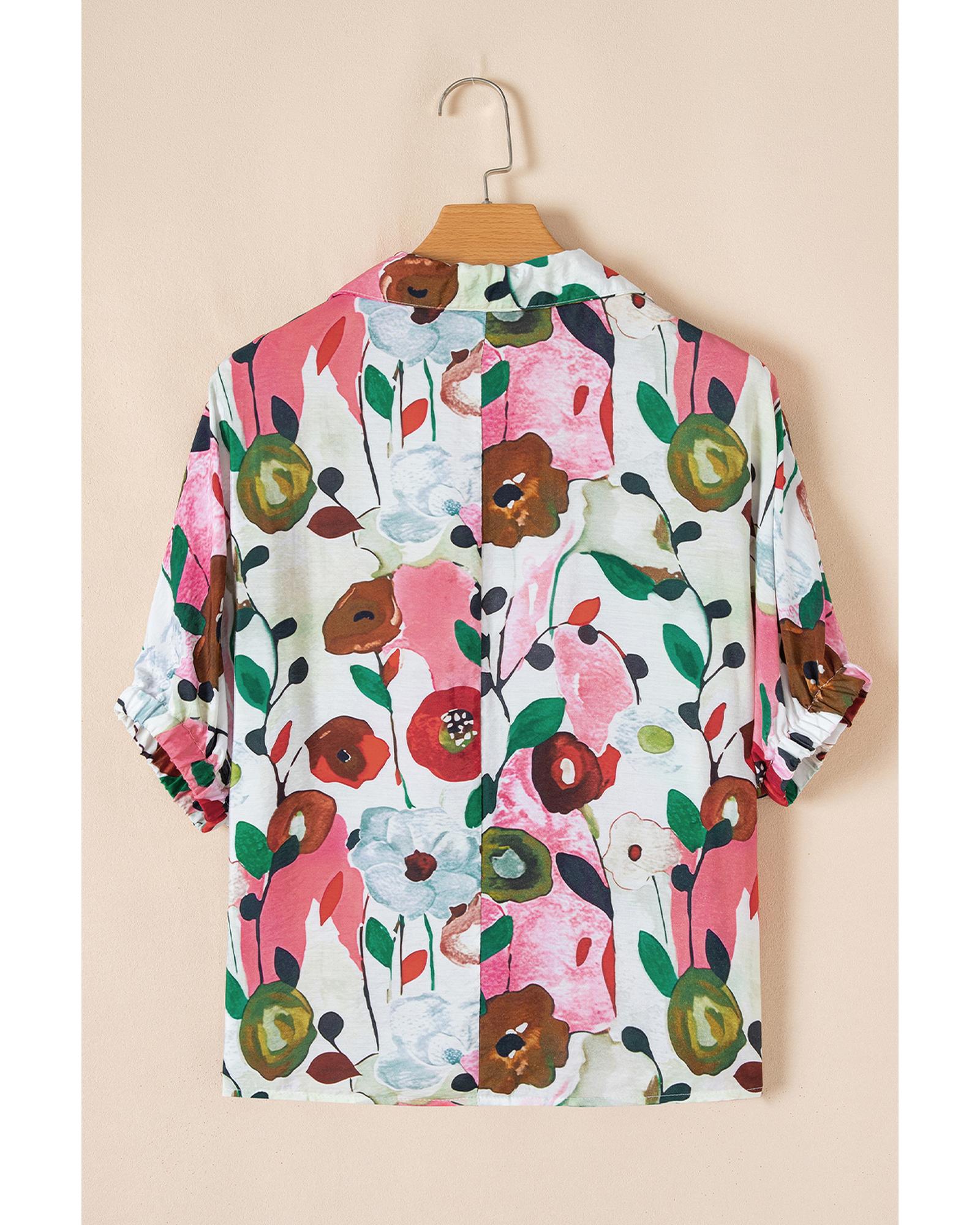 Pink Floral Print Slit V Neck Short Sleeve Blouse – S