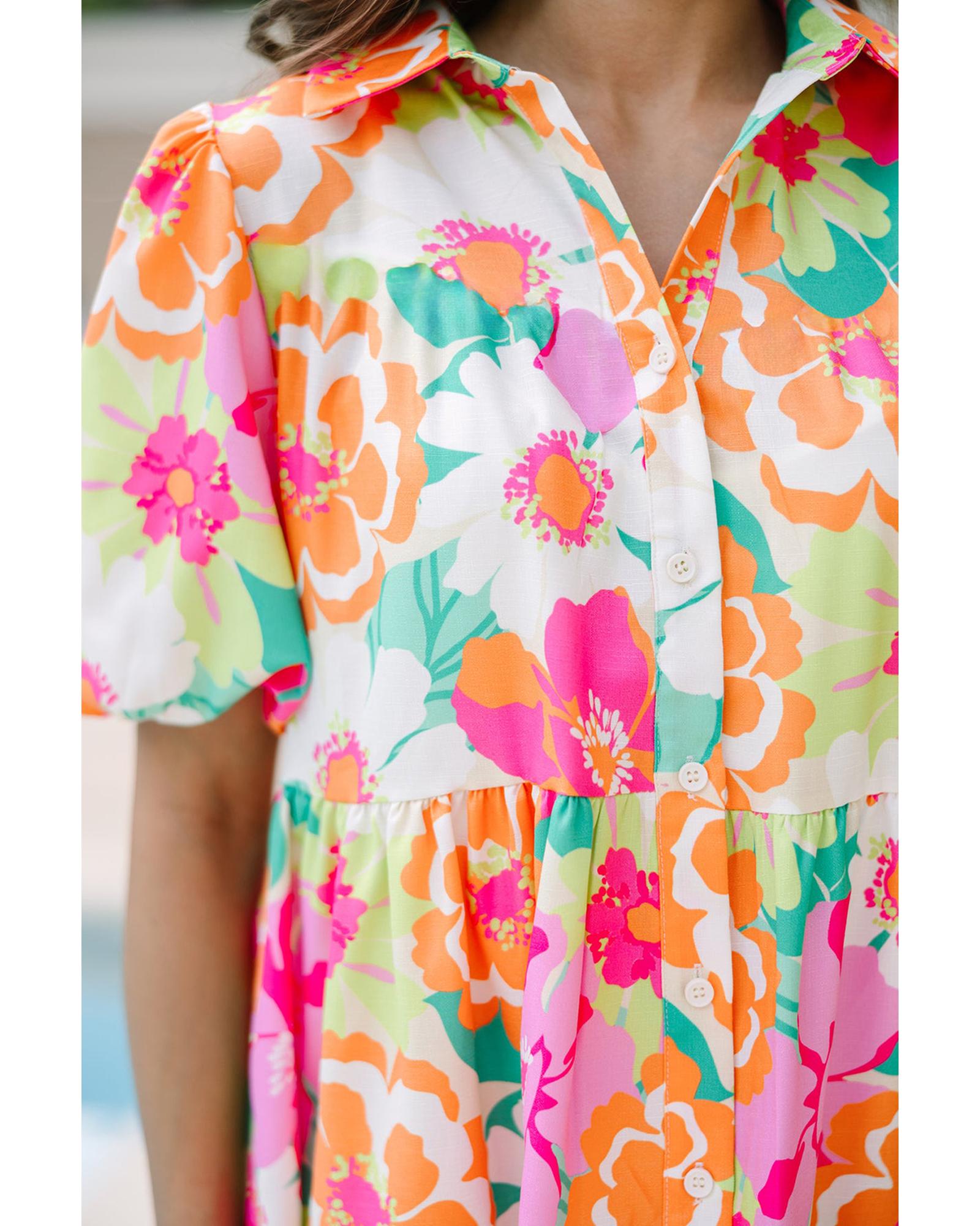 - Pink Floral Puff Sleeve Collar Buttoned Babydoll Dress